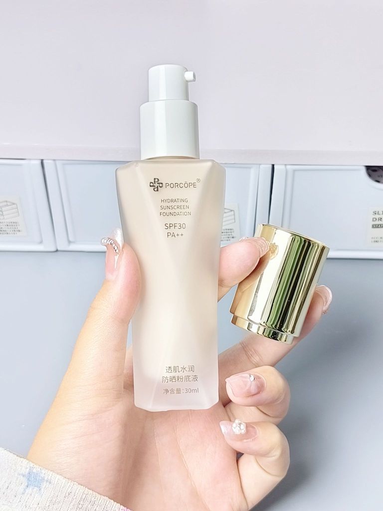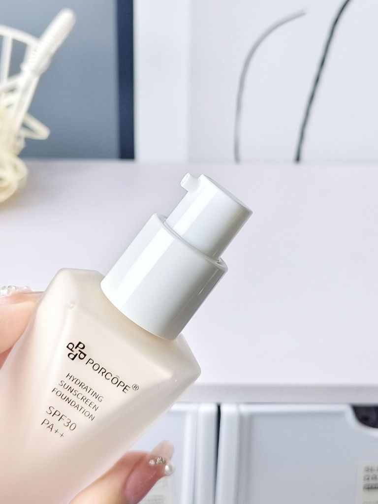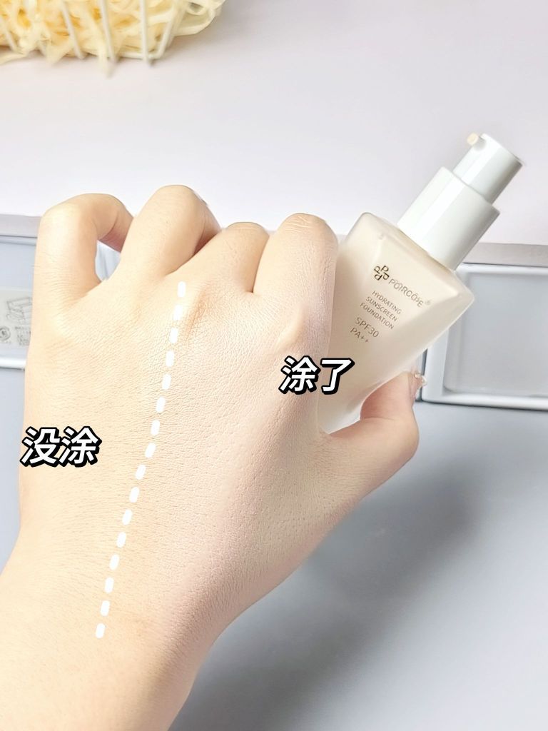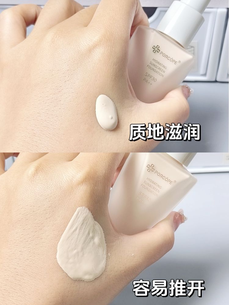 就是介个PORCOPE防晒粉底液 它的质地就真的挺水润好推开的 而且自带防晒 我本人是混油皮 上脸后也不怎么卡粉 痘痘瑕疵也能遮个七七八八的 平时出门一天下来底妆还是牢牢的 用它的同时还能补防晒 我这个懒人尊嘟狠狠爱啦~