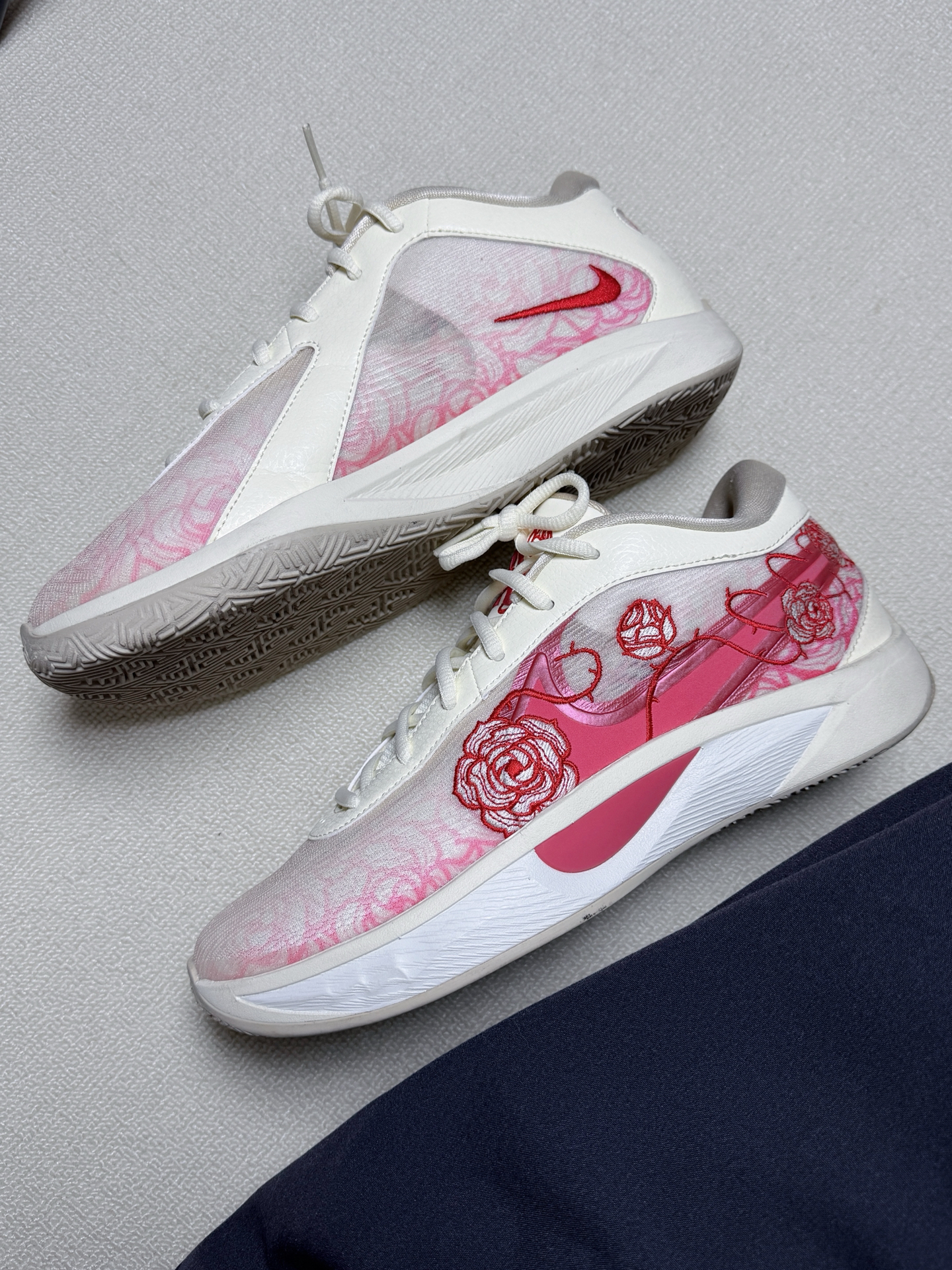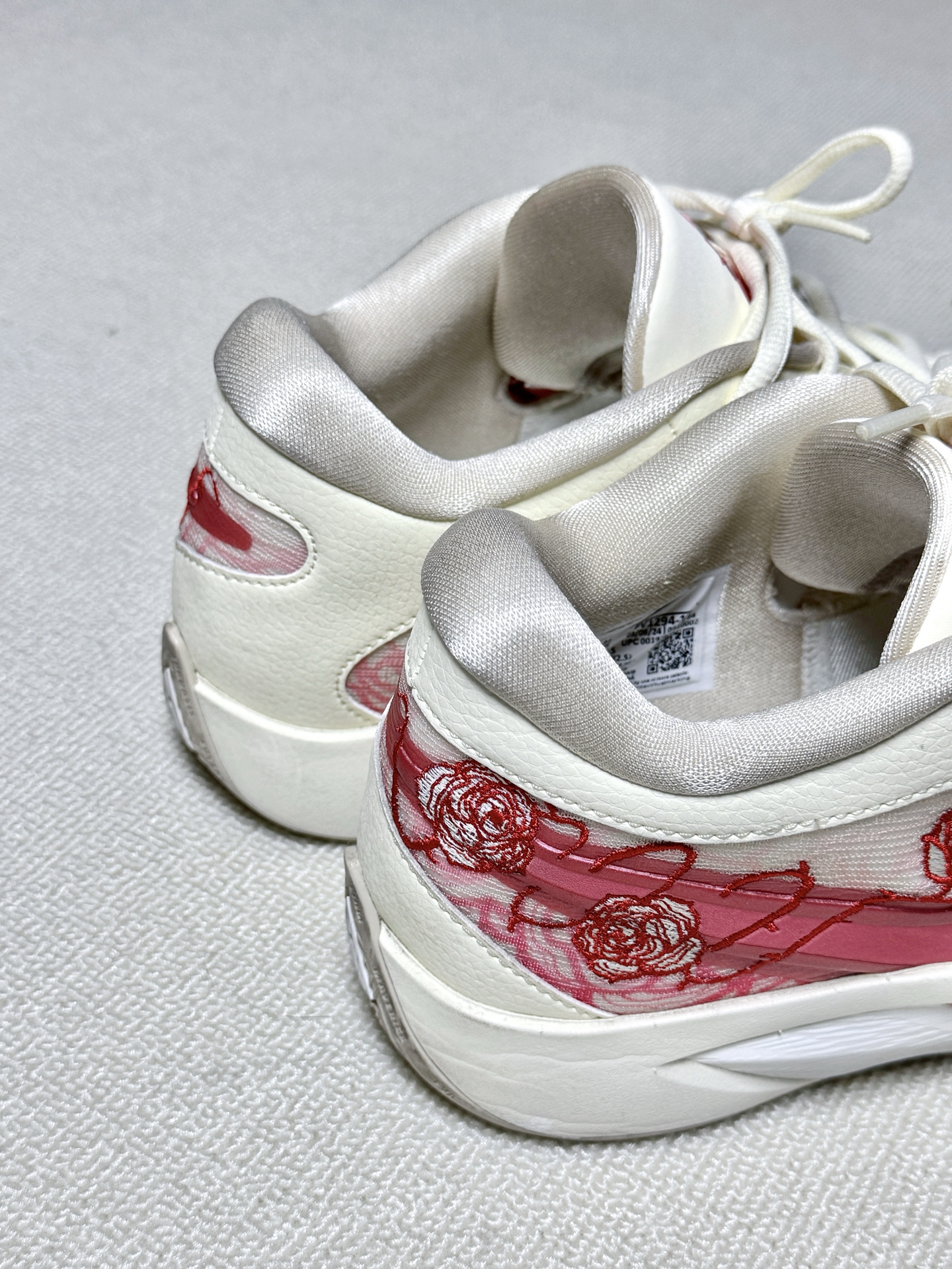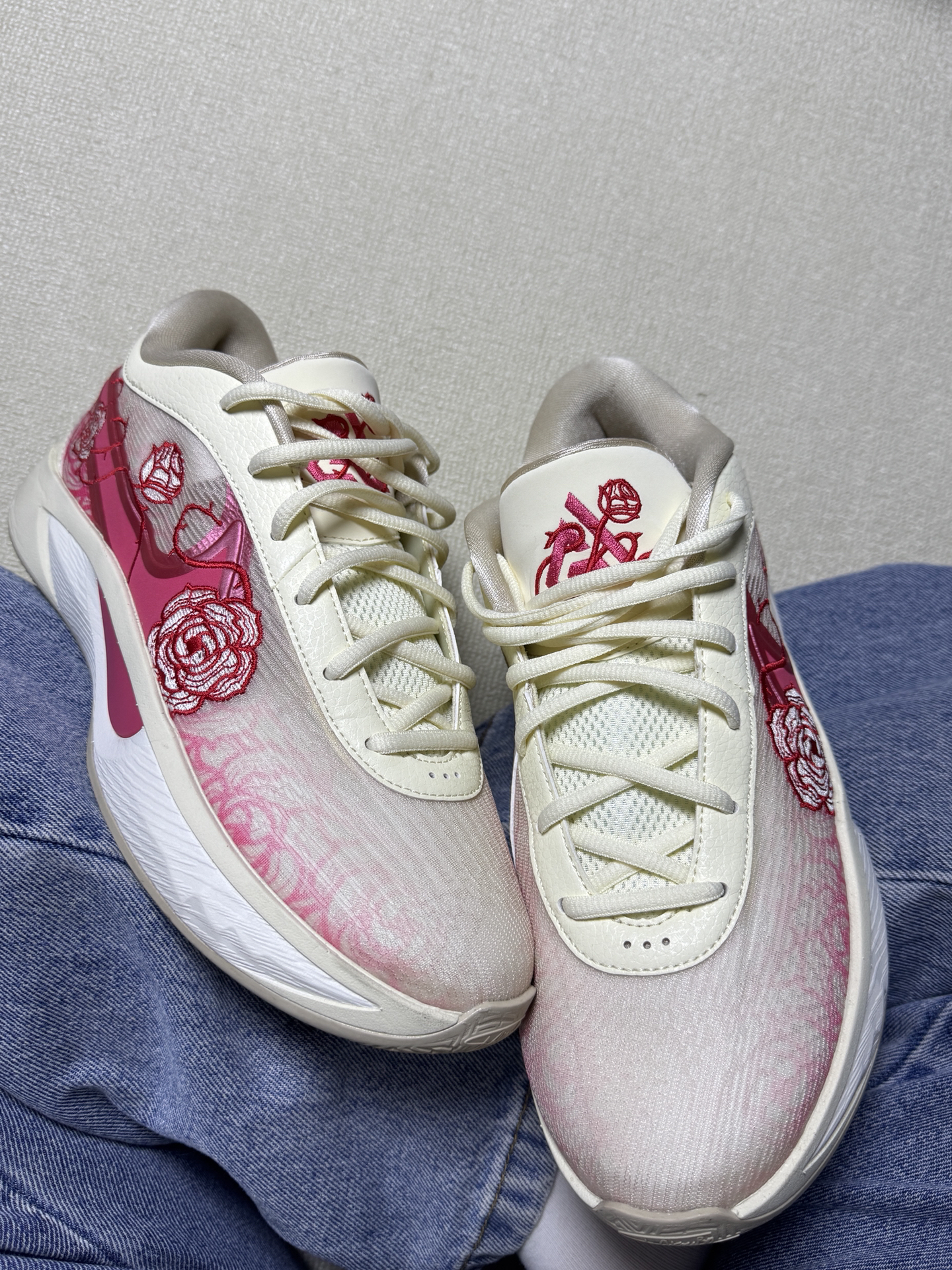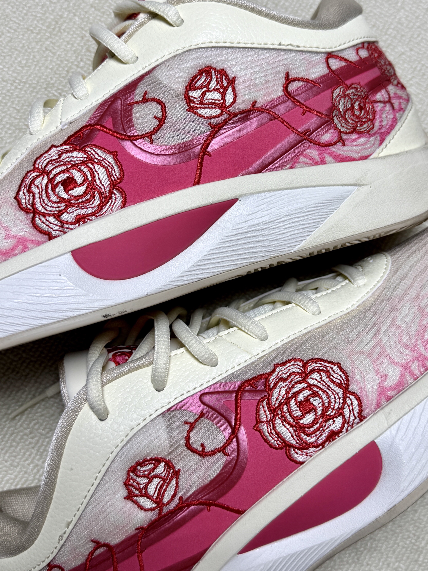 完全长在我审美上的篮球鞋 米白色的鞋面十红色玫瑰刺绣,温柔又精致 鞋子自重很轻,鞋面是透气网面,夏天穿也不闷脚脚感舒服,抓地力很强 最让我喜欢的是他虽然是一双篮球鞋,但平时通勤穿搭都很适合
