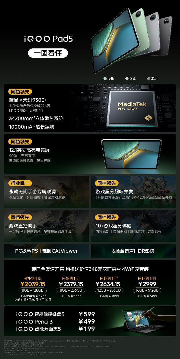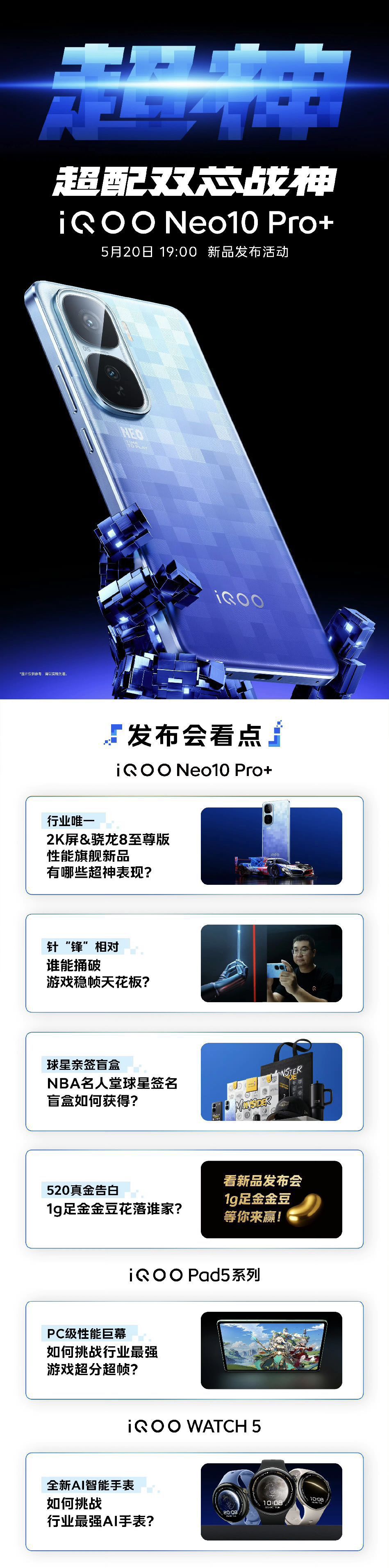 iQOO于2025年05月20日19:00举办新品发布会,推出iQOO Neo10 Pro+、Pad5系列、WATCH 5等产品。 一、iQOO Neo10 Pro+ ①性能:搭载蓝晶×骁龙8至尊版处理器,配备LPDDR 5X Ultra和UFS 4.1存储技术,安兔兔得分超331万。 ②显示:配备自研电竞芯片Q2,支持2K+144FPS技术。 ③散热:采用7K冰穹VC散热系统。 ④屏幕:2K ...