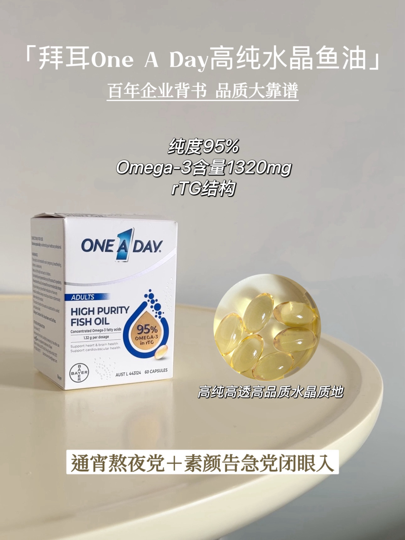 本篇笔记关联了WHC 小千金深海高纯度鱼油 盒装 护肤养发 60粒、BAYER/拜耳 深海鱼油软胶囊 补充营养促进吸收 60粒、BAYER/拜耳 one a day 深海鱼油胶囊 高浓度无腥 60粒等商品,为用户提供真实的使用体验和购买参考。