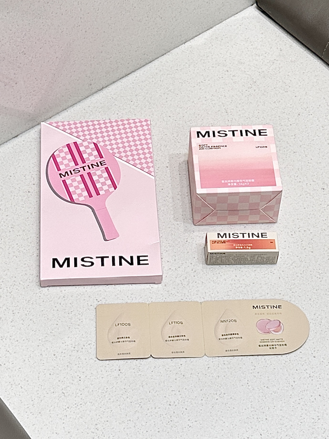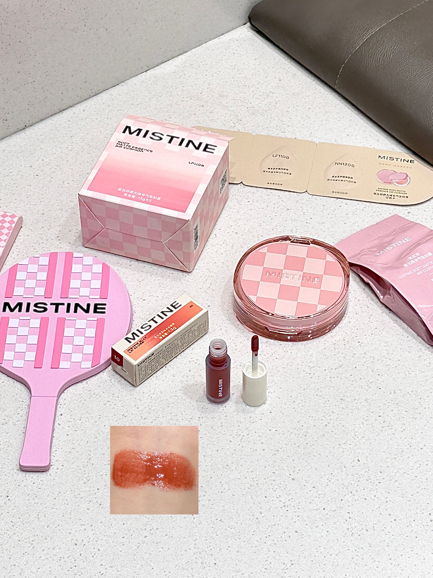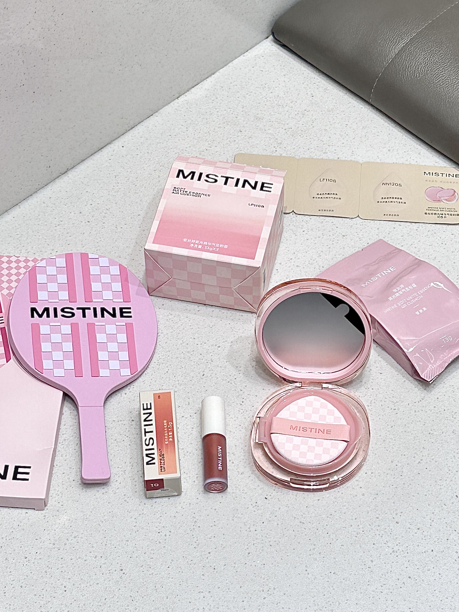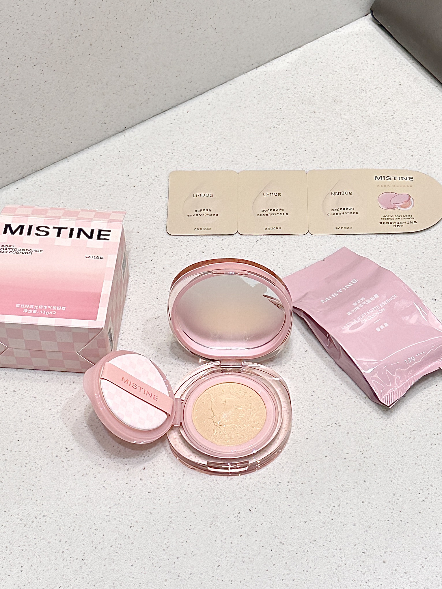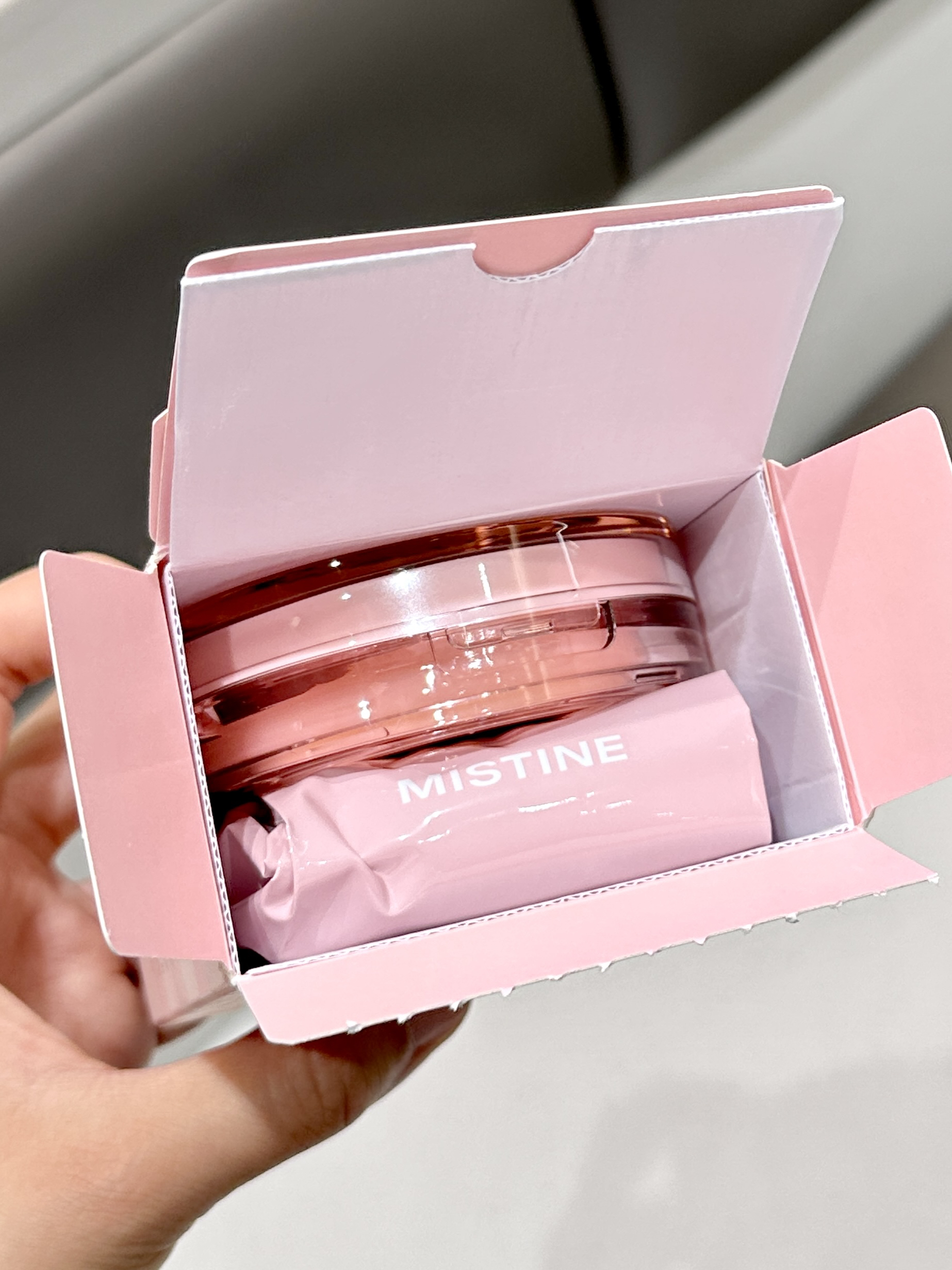 是mistine家新出的棋盘格气垫耶 里面有正装和替换装 感觉好贴心 粉粉嫩嫩的包装少女心一下拉满 质地水润细腻 感觉妆感很自然 有种妈生皮即视感 小小一只放在包包里也不会占太大空间