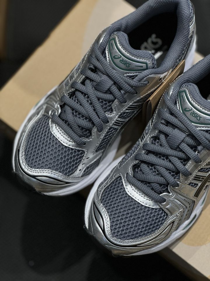 亚瑟士Gel-Kahana 8 SP 鞋面是单层银色网纱+合成革拼接,像会呼吸的滤网(亲测38℃暴走脚底不闷汗!),后跟用立体泡棉包裹,落地时有种被稳稳托住的安心感。中底藏着GEL缓震胶,走碎石路像踩在软糯麻薯上,通勤挤地铁都变轻盈了 。3.5cm的SPEVA弹性中底悄悄拉腿长,AHAR橡胶大底的波浪纹抓地力超狠,雨天瓷砖地也没打滑过。