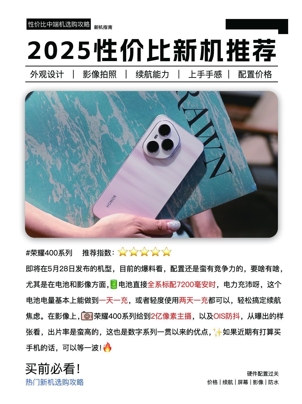 又是扎堆发布新机的月份,vivo、OPPO、荣耀、华为在这个月已经发布或者即将发布新的中端机型,对于打算换机的小伙伴来说,纠结症又要犯了,我把这几个厂商的机型都挨个讲下,帮你快速定位到适合自己的机型! 荣耀400系列 推荐指数:⭐⭐⭐⭐⭐ 即将在5月28日发布的机型,目前的爆料看,配置还是蛮有竞争力的,要啥有啥,尤其是在电池和影像方面,电池直接全系标配7200毫安时🔋,电力充沛呀,这个电池电量两...