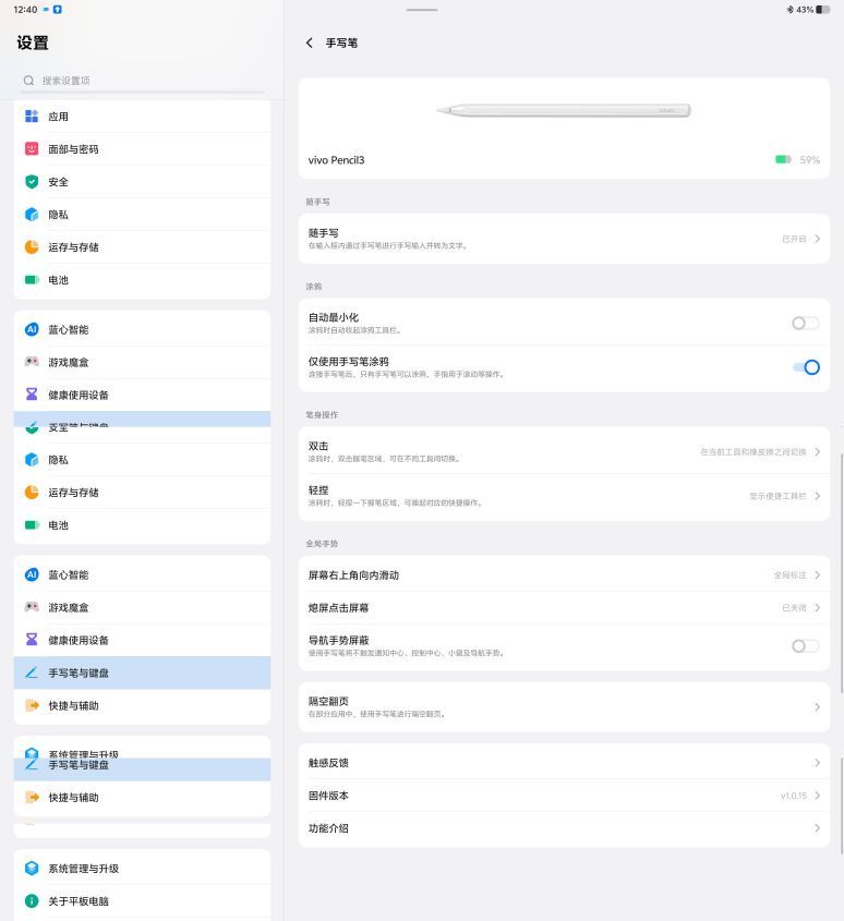 很高兴在第一时间入手了vivo Pad5 Pro,然后我还额外入手了vivo Pencil3触控笔和vivo Pad5 Pro智能触控键盘,正好是一套的完整的组合,如此一来,用它来办公都方便了许多。 那么,上手的第一件事情,自然是更新系统了,在我确认完是否存在更新后,我发现vivo Pencil3触控笔和vivo Pad5 Pro智能触控键盘暂时没有系统更新。 而vivo Pad5 Pro则是...