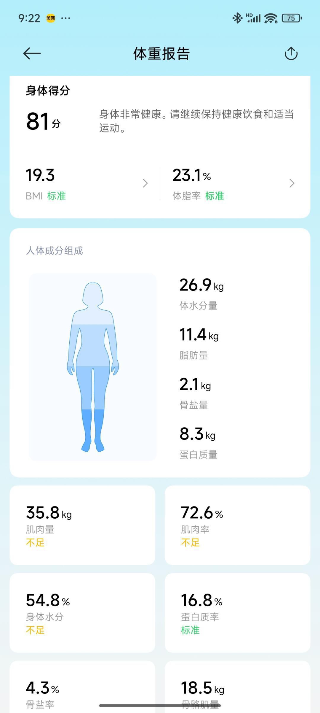 天天称体重?体脂率才是照妖镜! ▫️光脚站上秒测13项数据(截图App报告:肌肉量/水分率) ▫️和室友约减肥挑战,每周数据PK超有动力! ⚠️**避坑提醒**:体脂秤要放硬地板!地毯测量会不准哦~