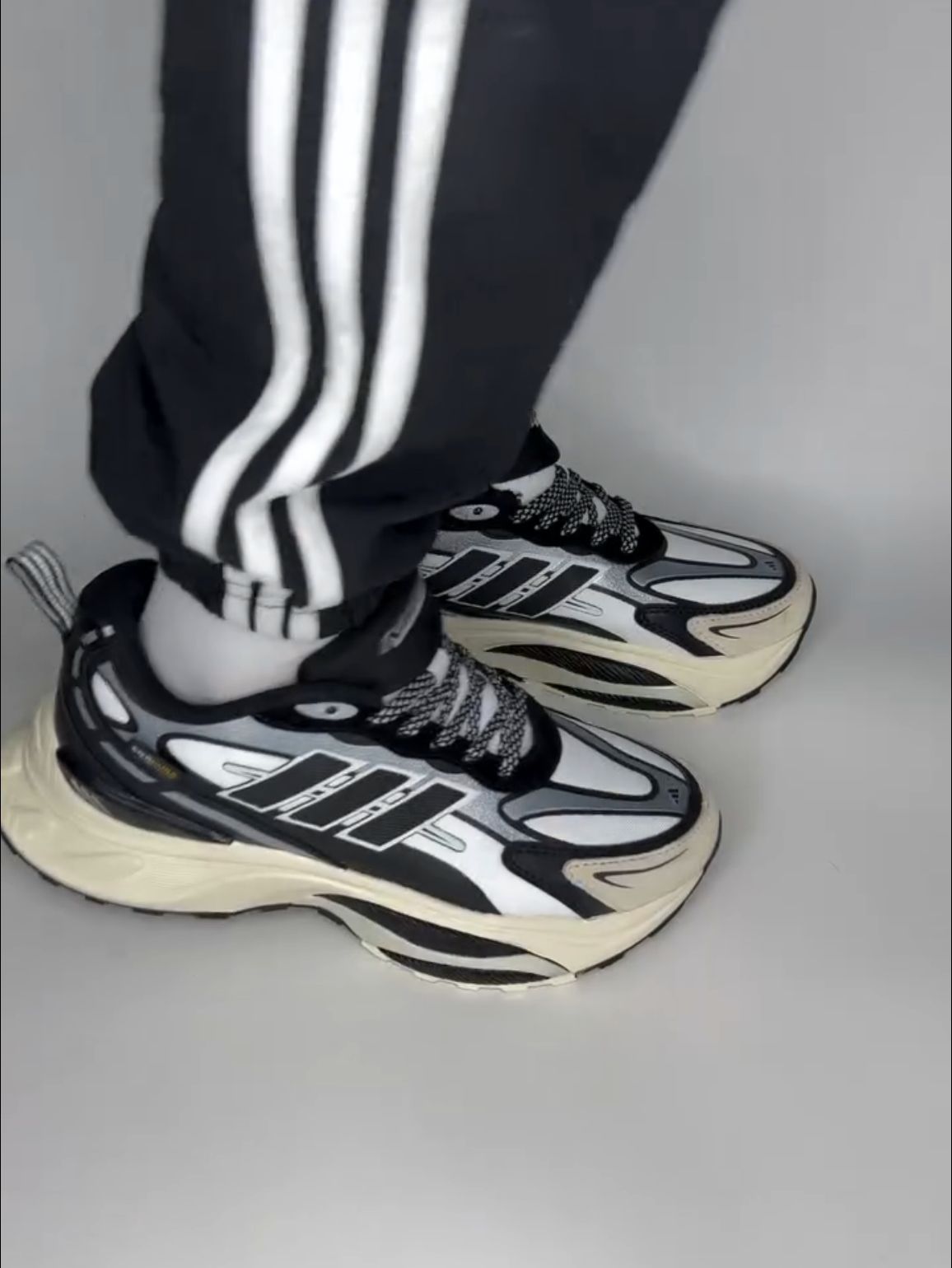 adidas MTS PRO 🥰颜值黑白灰三色碰撞,复古机能风拉满,鞋身线条凌厉又不失层次感,妥妥的百搭神鞋,不管是搭配运动束脚裤还是宽松牛仔裤,都能瞬间提升造型质感,出街回头率拉满 👟脚感比较舒适,中底搭载缓震科技,踩上去软弹十足,慢跑、快走都如踩云端。鞋面采用透气网布+皮革拼接,透气不闷脚,春夏穿着也清爽 😩但是白鞋通病,容易沾灰,洁癖党需勤打理;鞋头略宽,脚型偏瘦的朋友建议选小半码 😤这鞋颜...