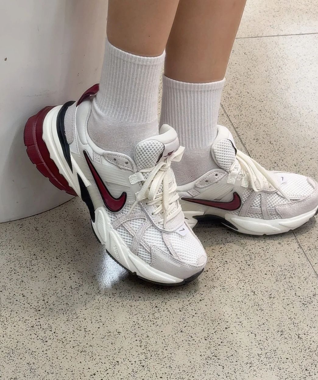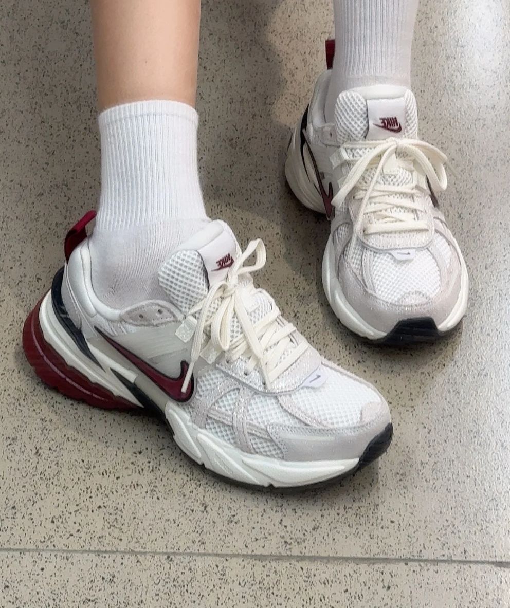 绝了!耐克V2K白红配色 全掌泡棉鞋底轻盈柔软舒适,久穿不累脚 华夫格鞋底耐磨耐穿 增高3CM真的很显腿长呀! 红色十白银细闪blingbling的+
