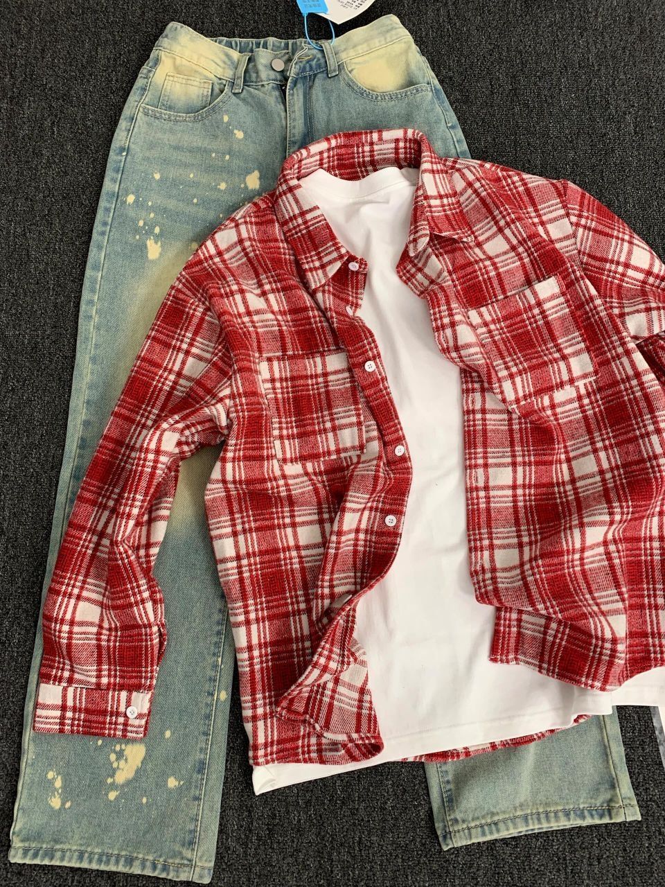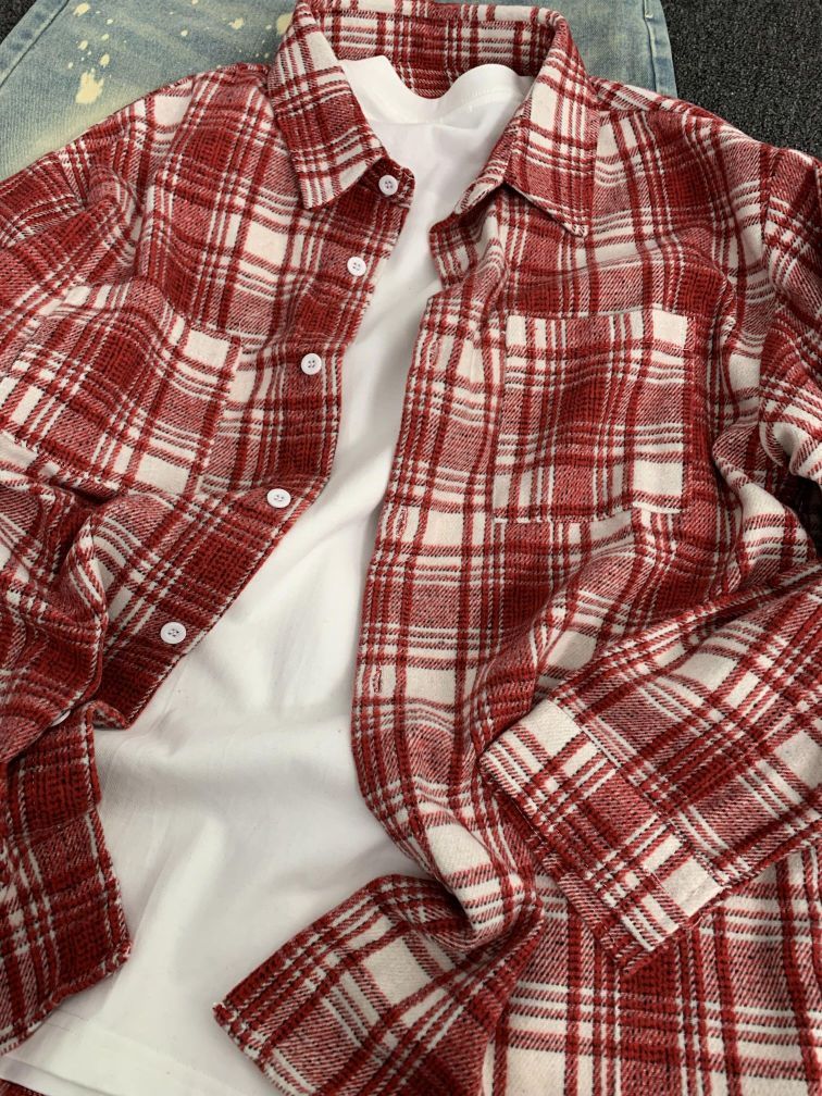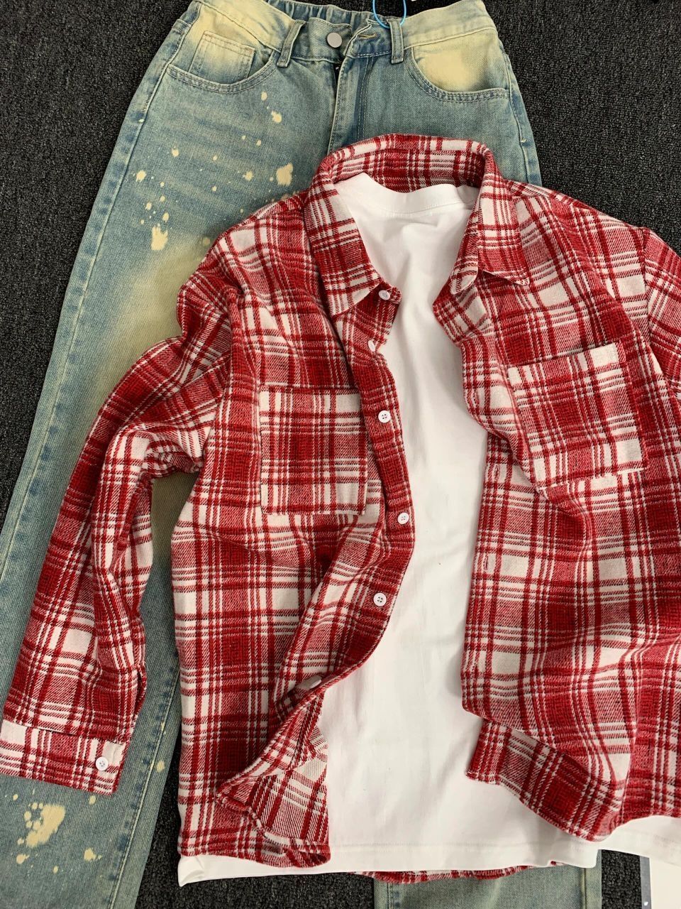 - 这套搭配复古感满满,红格纹衬衫经典又醒目,和做旧牛仔组合,妥妥的港风再现,穿上就是街头焦点。