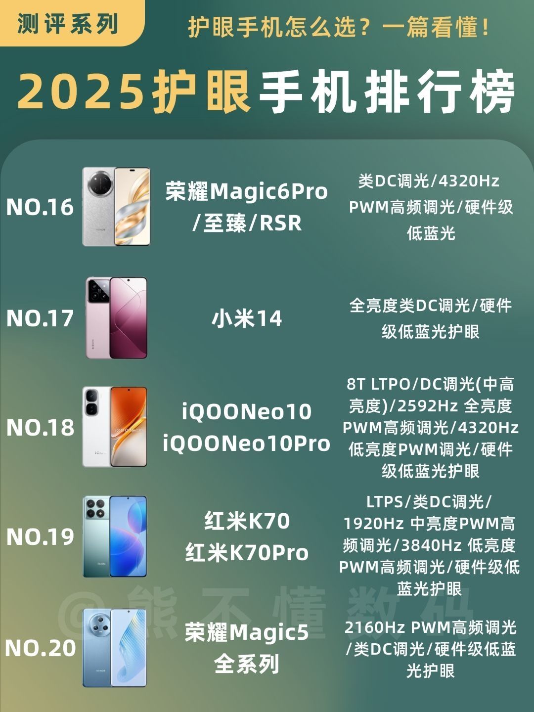 经常有人问哪款手机护眼,不伤眼,一般公认lcd屏是比oled屏护眼的~ 这次特地汇总了前20名护眼屏手机排行榜~ 更直观的让大家知道哪些手机是比较护眼的! 1️⃣红米K80\K80Pro 2️⃣OPPOfindX8 3️⃣OPPOReno13系列 4️⃣荣耀200Pro\300Ultra 5️⃣荣耀magic7 ………