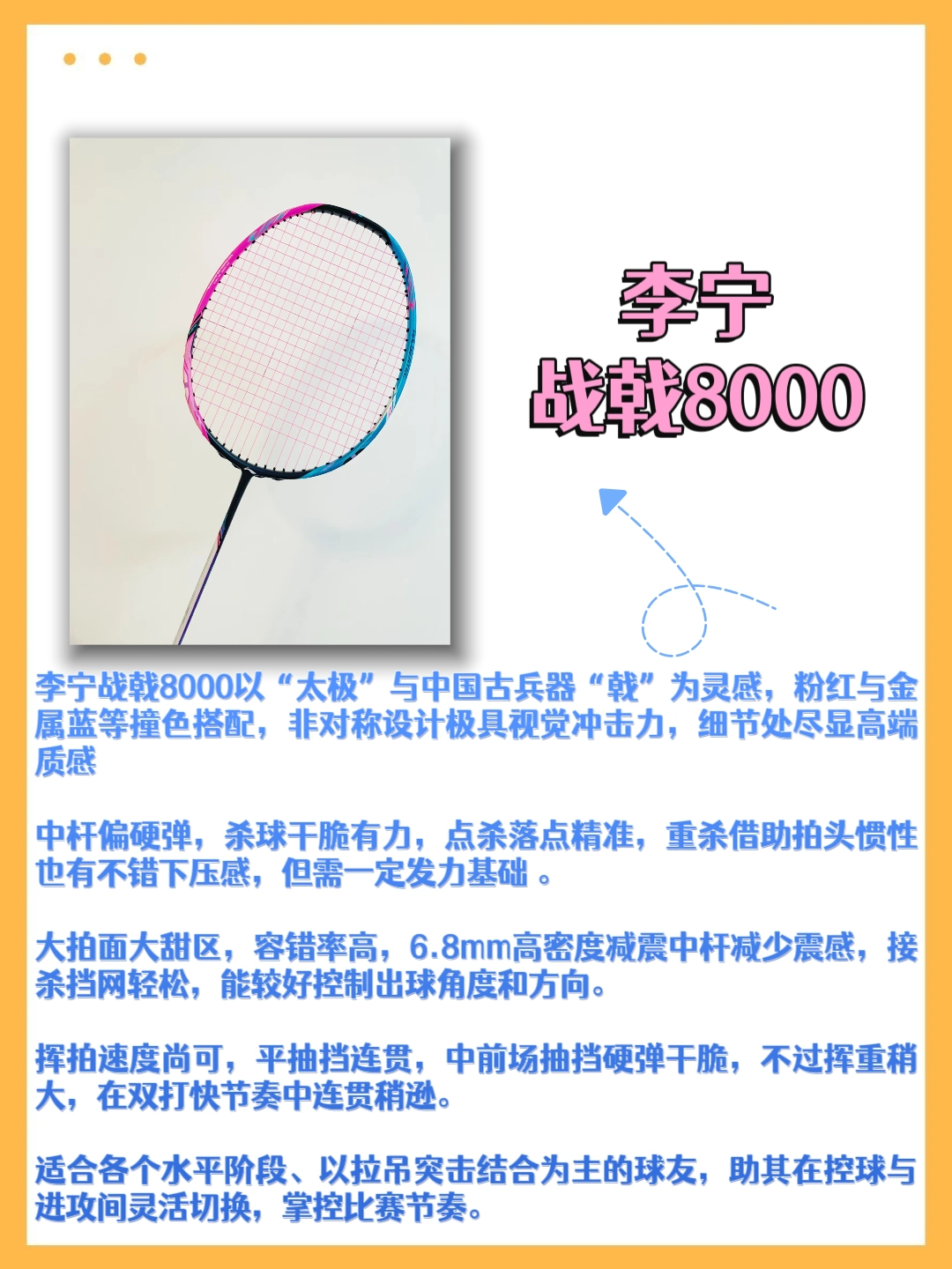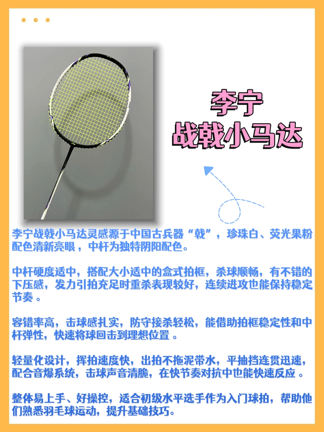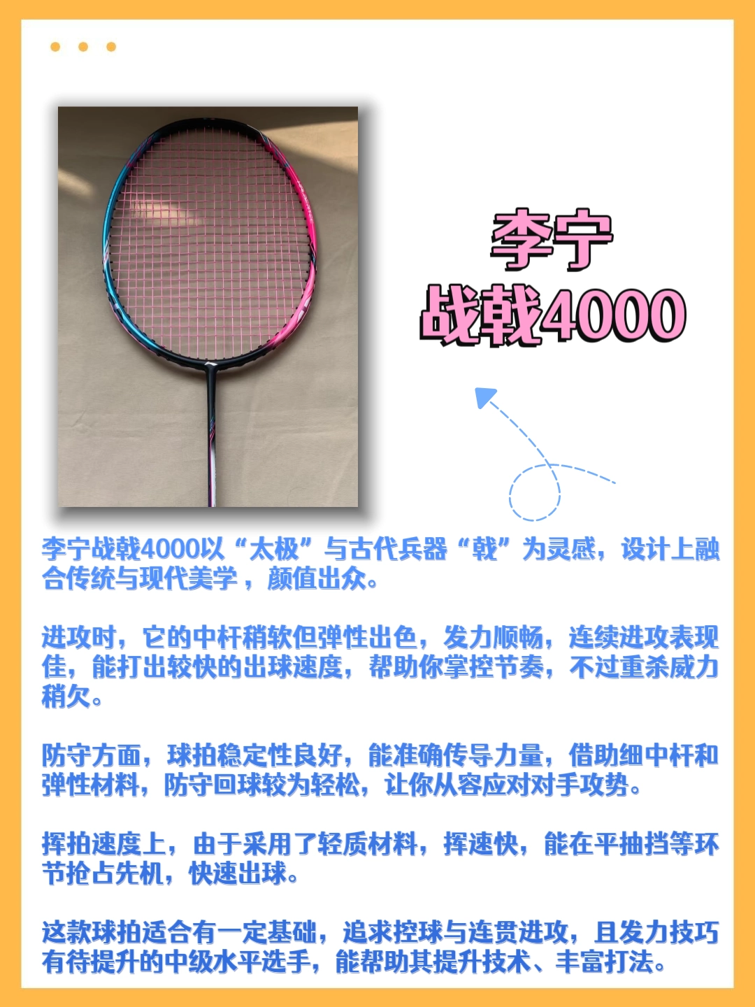 本篇笔记关联了Li Ning/李宁 战戟系列 战戟4000 控制型 耐打 高弹 羽毛球拍 珍珠白等商品,为用户提供真实的使用体验和购买参考。