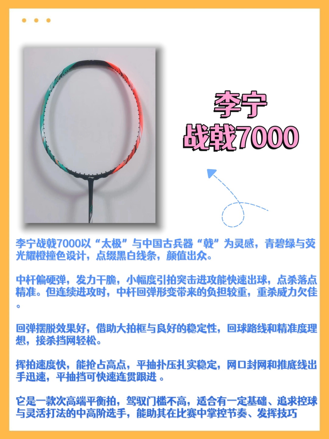 战戟系列灵感源自“太极”与古兵器“戟”,配色大胆,设计独特。 战戟2000 - 5000适合新手和进阶者,中杆软弹,容错率高,进攻连贯但重杀弱,防守借力轻松,挥速不错。 6000 - 7000是平衡拍,适合中高阶球员,中杆弹性好,防守出色,6000拉吊强,7000进攻速度快。 8000 - 9000采用高端碳纤维,进攻凌厉,8000适合拉吊突击,9000杀球威力大,适合高手。 小马达是入门拍,容错...