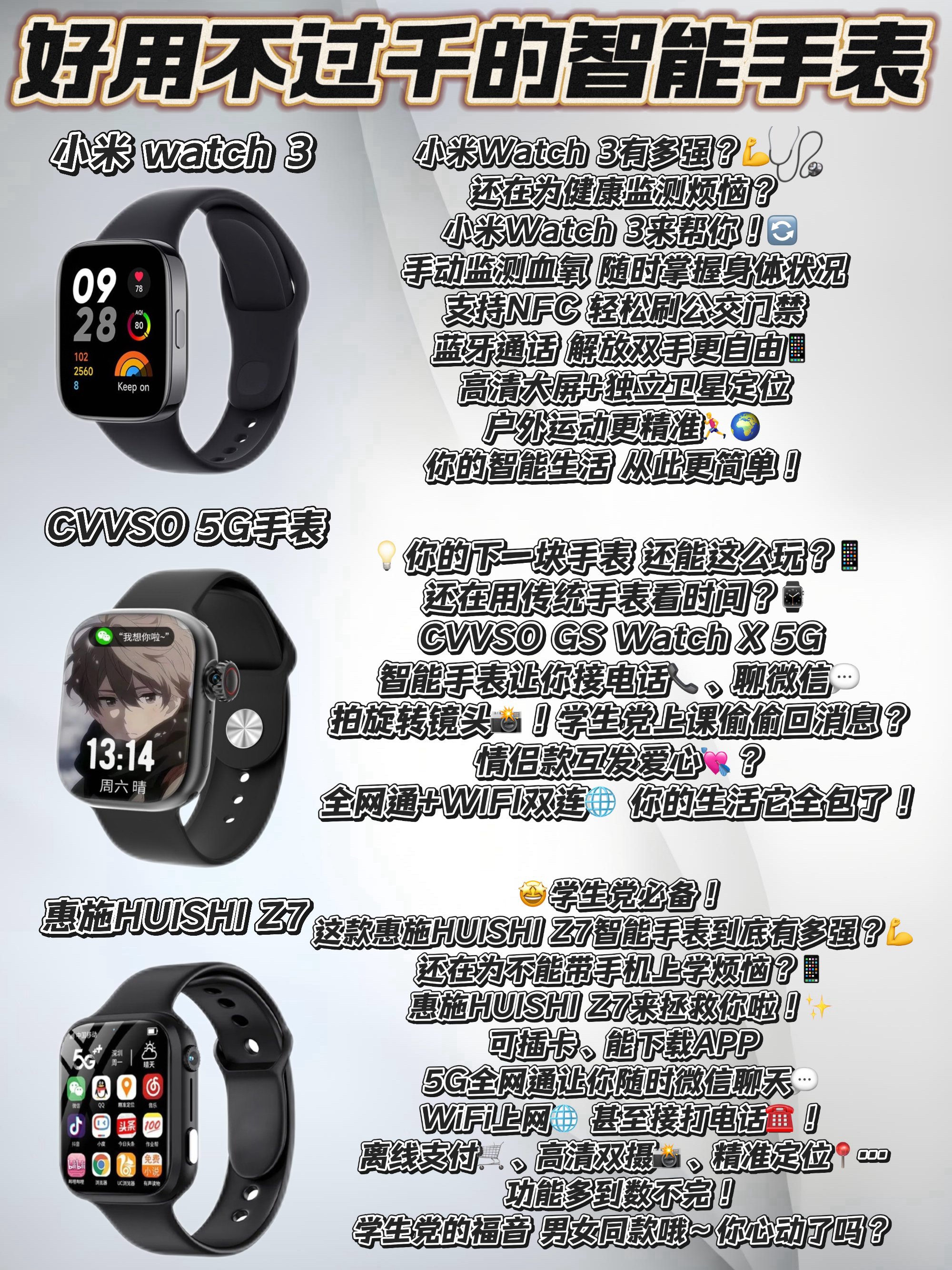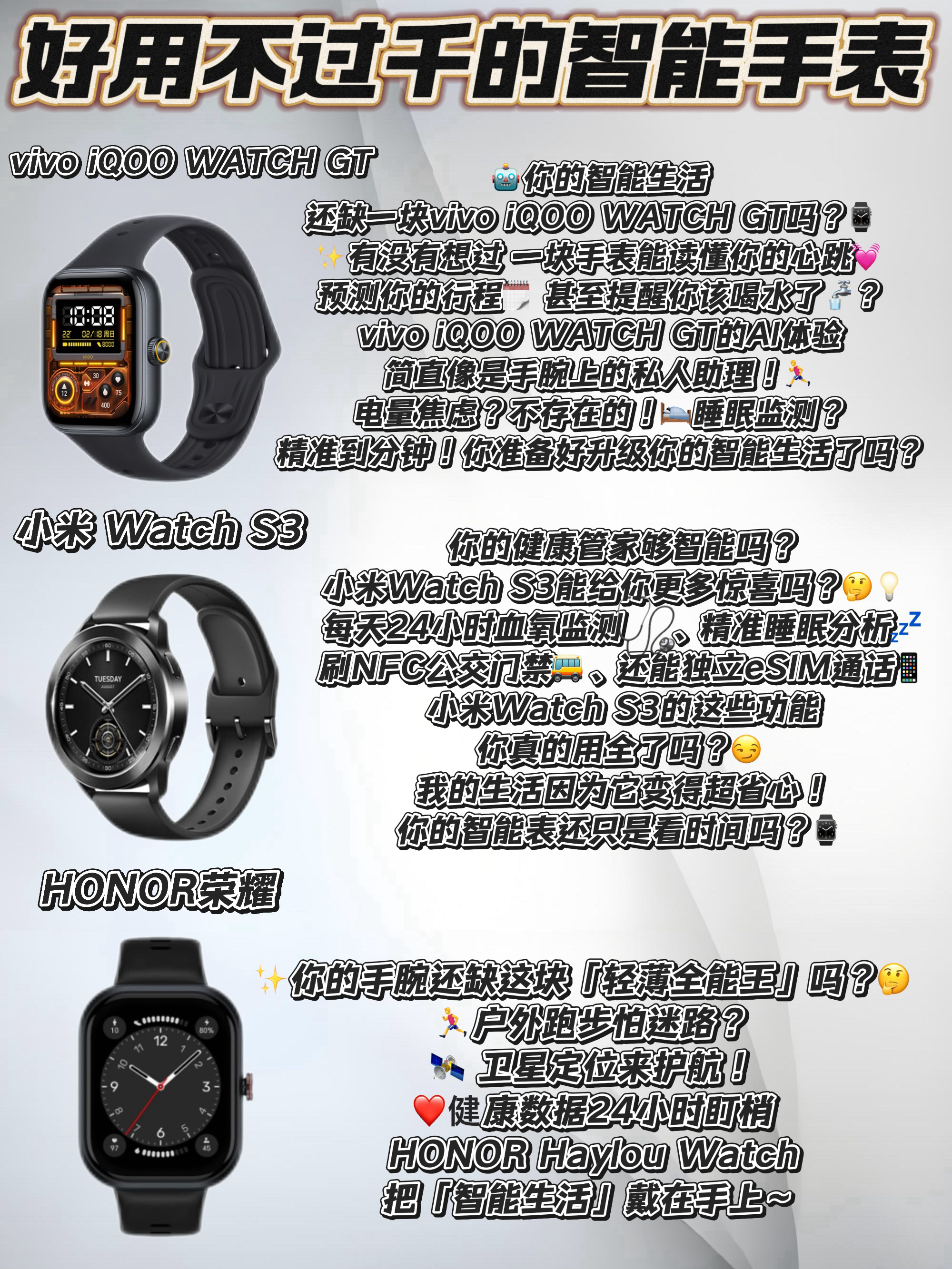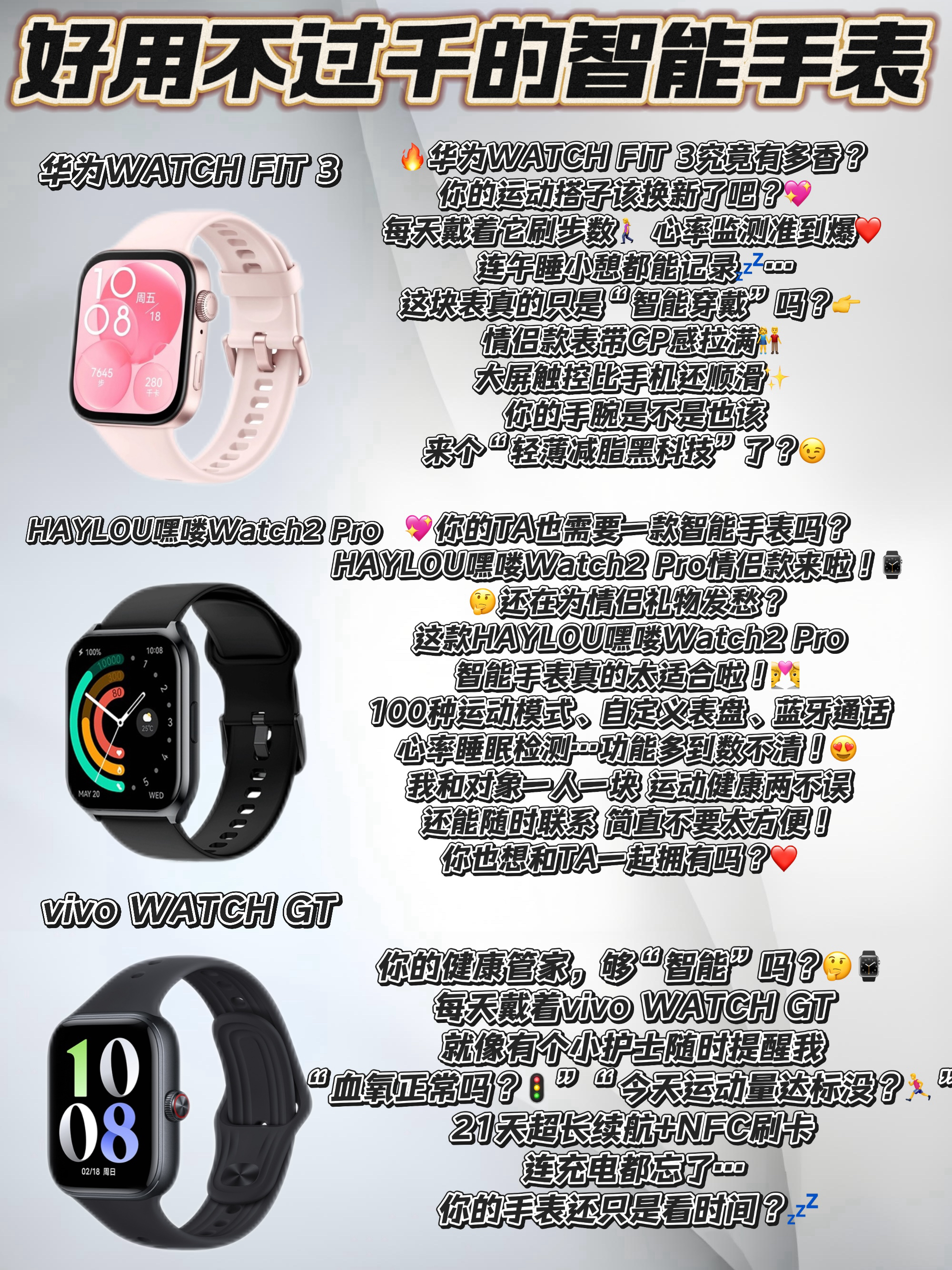 还在为选择哪款手表而纠结吗?💭 面对市面上琳琅满目的品牌和功能,是不是觉得眼花缭乱?✨ 今天,我就结合自己的真实体验,带你一探究竟!🔍 华为HUAWEI WATCH FIT 3的轻薄大屏和运动减脂功能,真的适合情侣档吗?🏃♂️🏃♀️ 还是HAYLOU嘿喽Watch2 Pro的蓝牙连接更符合你的日常需求? 📶 vivo WATCH GT的21天超长续航,能否打消你的电量焦虑?🔋 小米...
