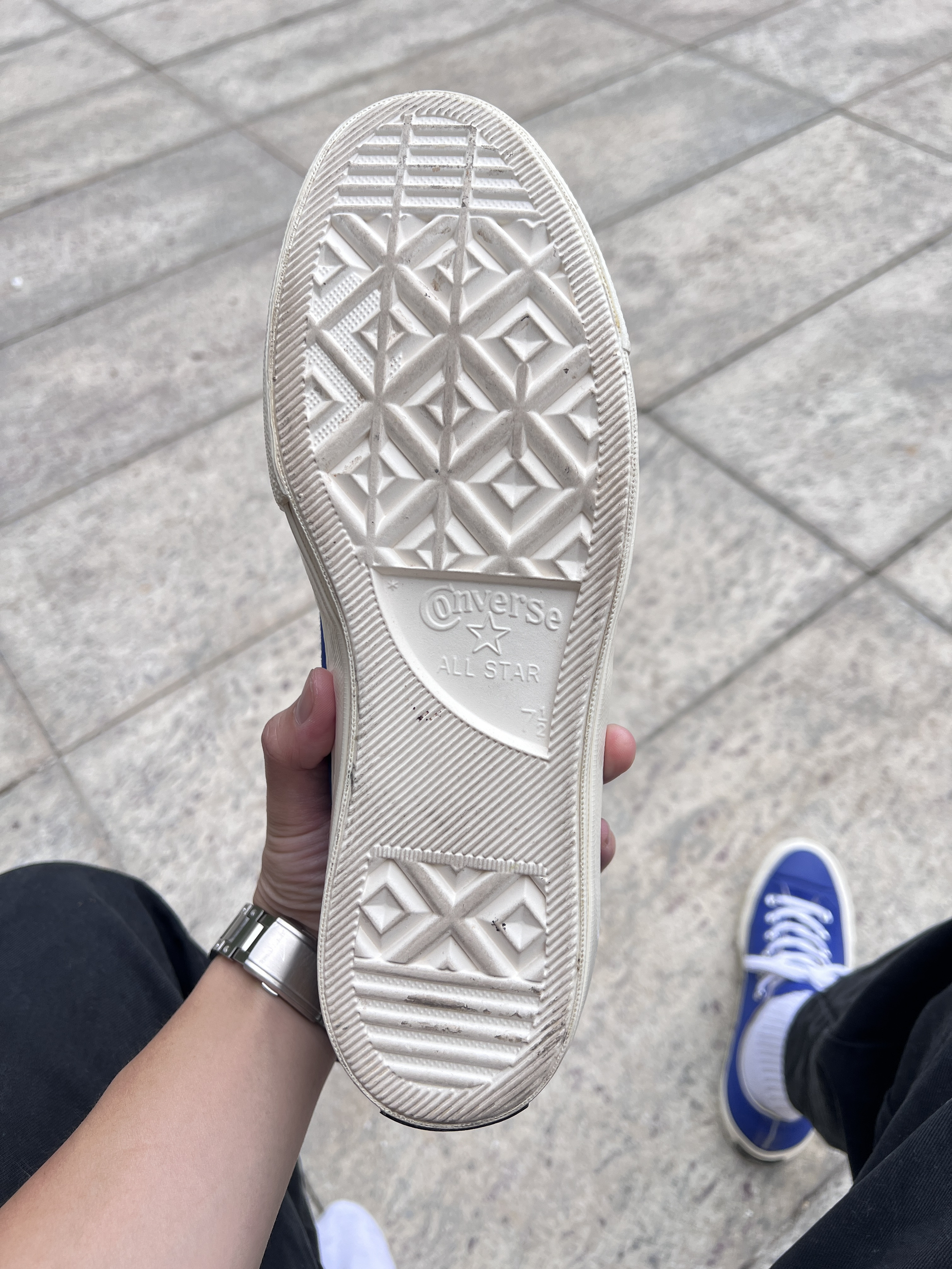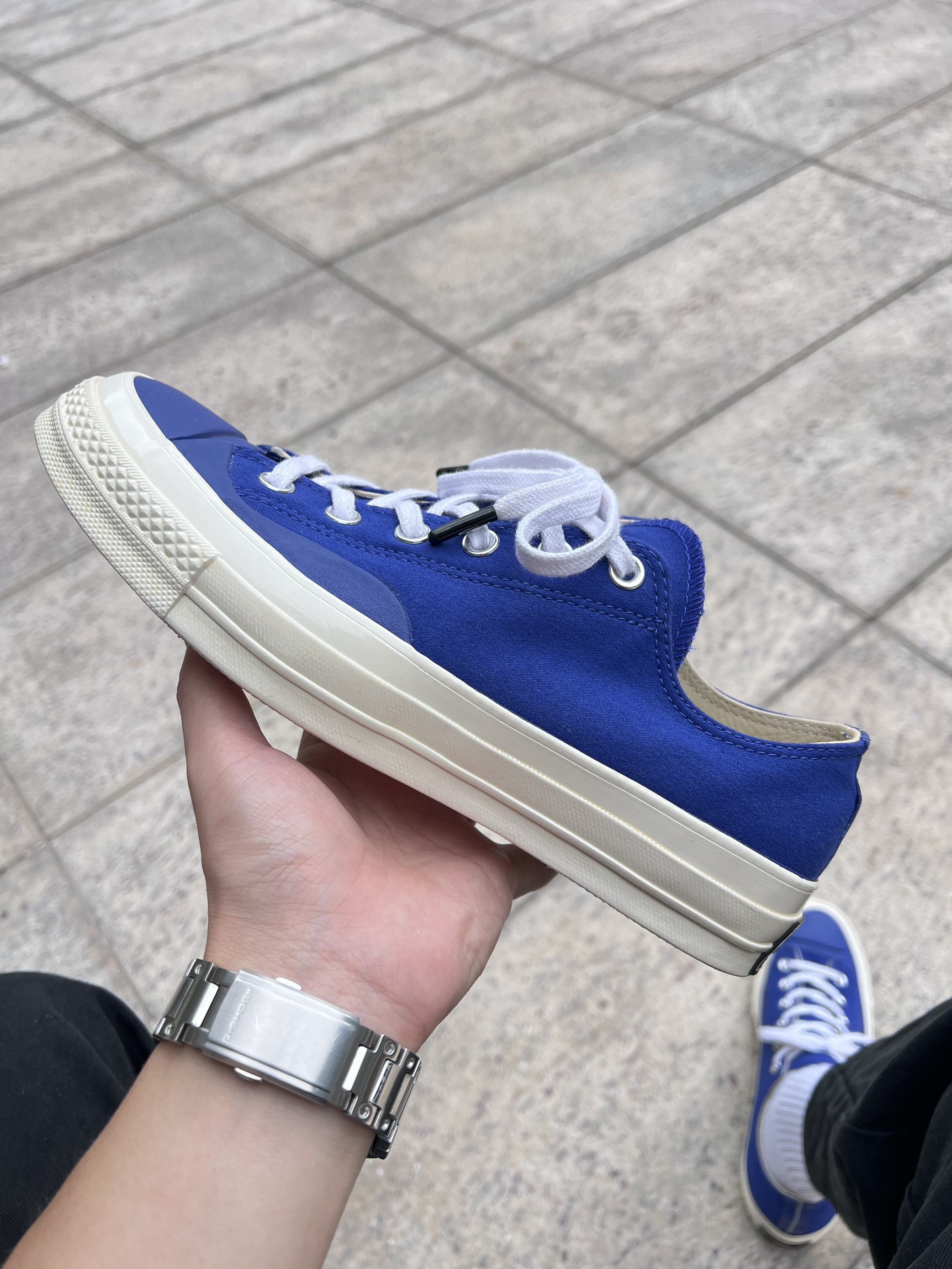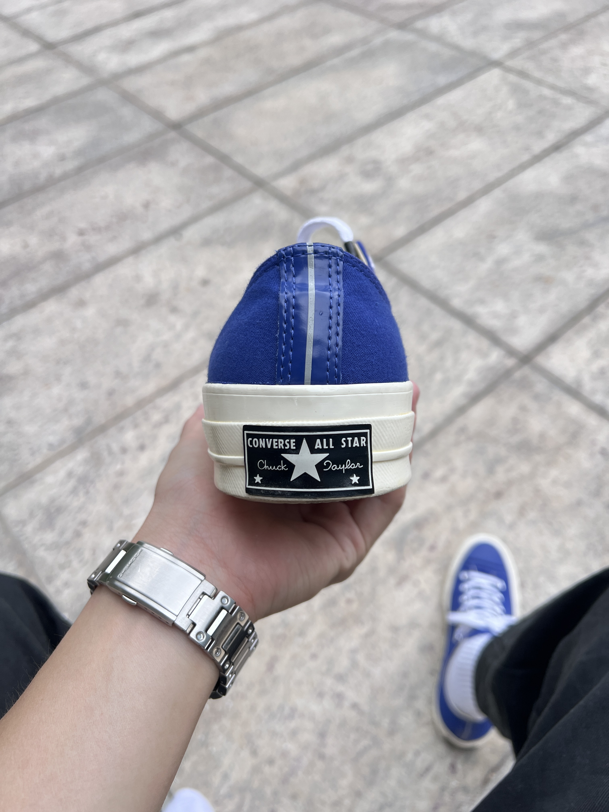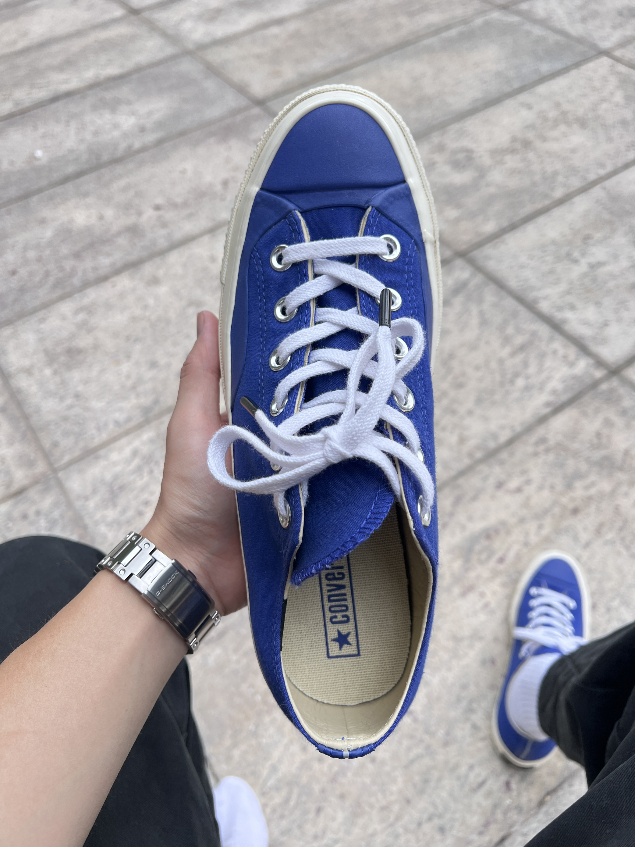 又是一款除了帅一无是处的鞋子😭 鞋子并不好穿,又硬又磨脚后跟(走路可难受了) 可是颜值太高了。 相比其他匡威1970s配色,鞋头也是蓝色的,鞋边氧化黄黄直戳我大动脉。 二开💰拿下的哈哈哈哈 穿搭分享: 首尾呼应 (整一顶同色系的帽子) 例:蓝色系鞋子搭蓝色系的帽子 衣服黑色或深色系为主