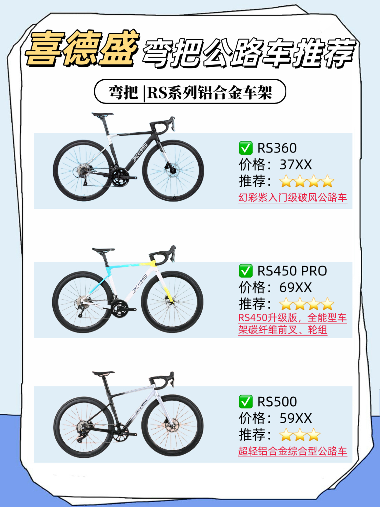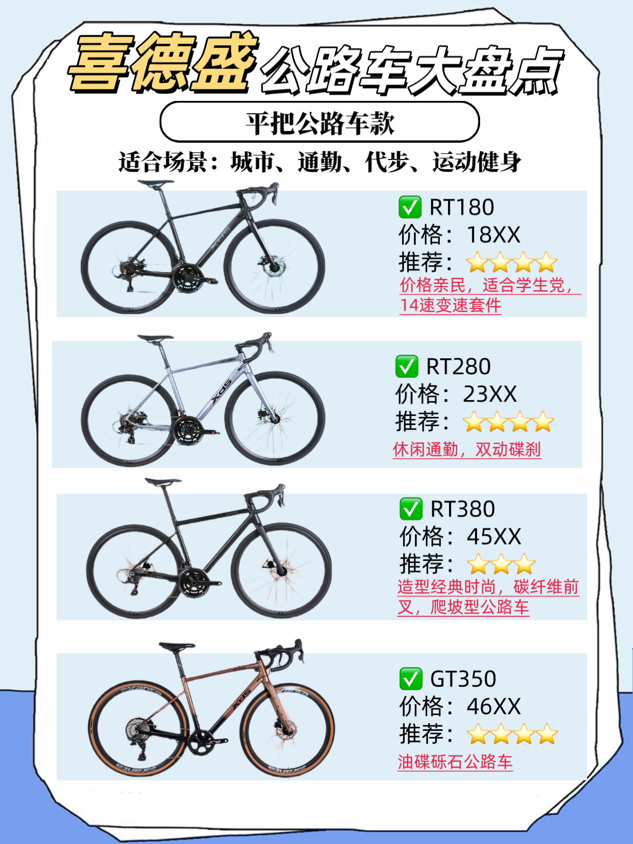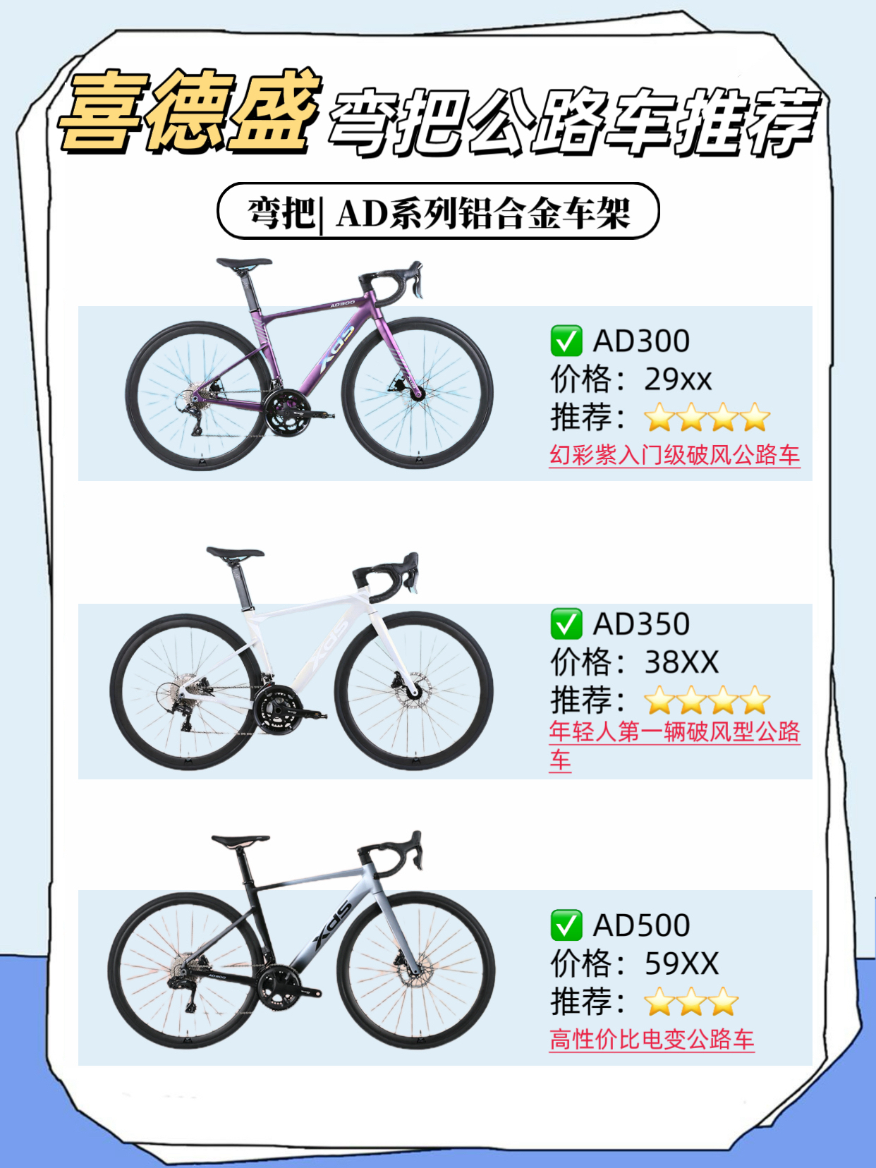 公路车大盘点推荐 🚴 来啦 🚨!! 看看哪款是你的菜 今天小编来给大家介绍一下喜德盛的热门公路车推荐吧!请跟着我往后看😊 ✅弯把公路车 适合场景:公路、平坦路面、城市、竞速等 1️⃣AD系列铝合金车架 AD300:入门级破风公路车 AD350:年轻人的第一辆公路车 AD500:高性价比电变公路车 2️⃣RS系列铝合金车架 RS360:时尚潮流综合型公路车 RS450 Pro:RS450升级版,全能...