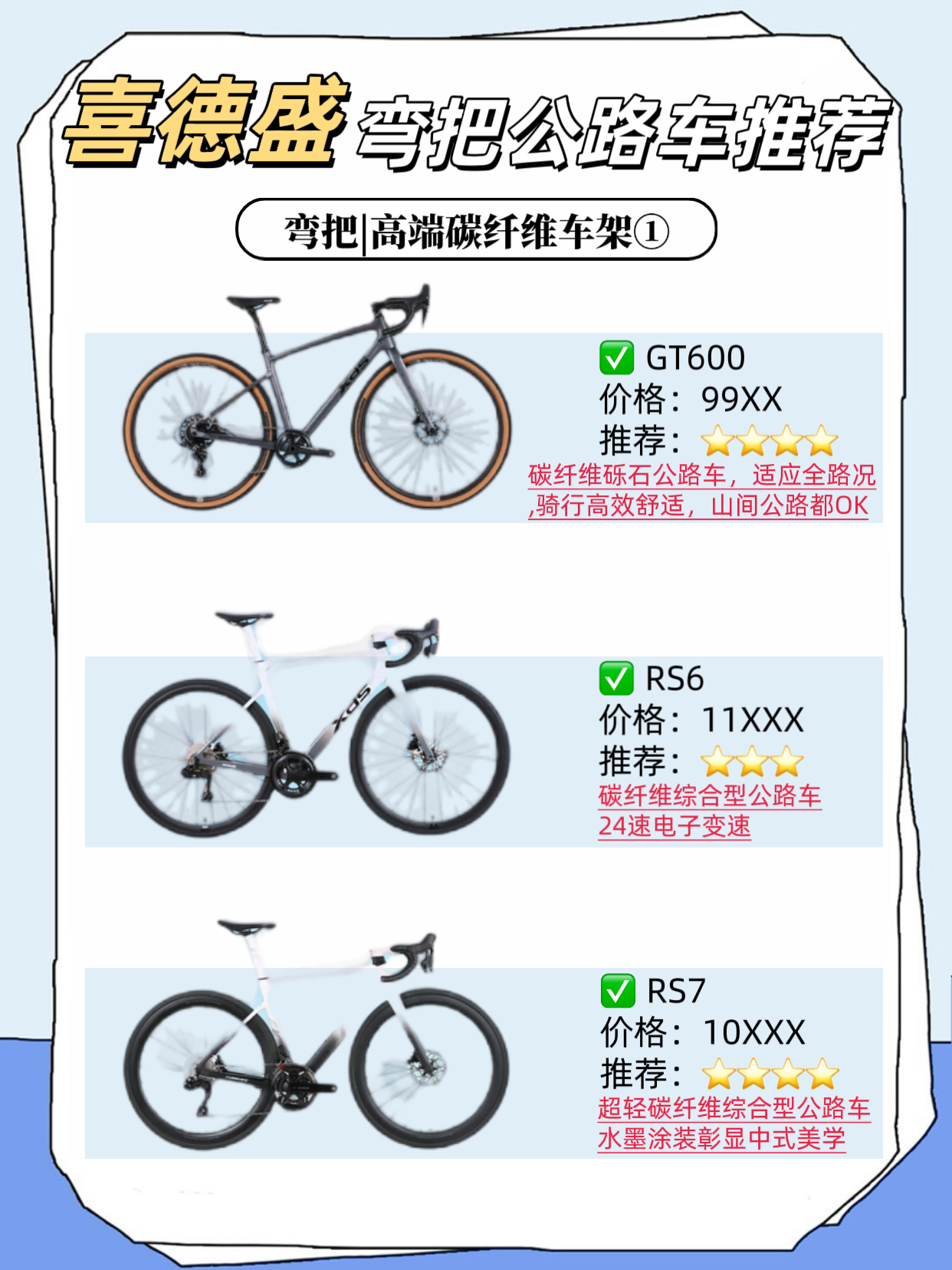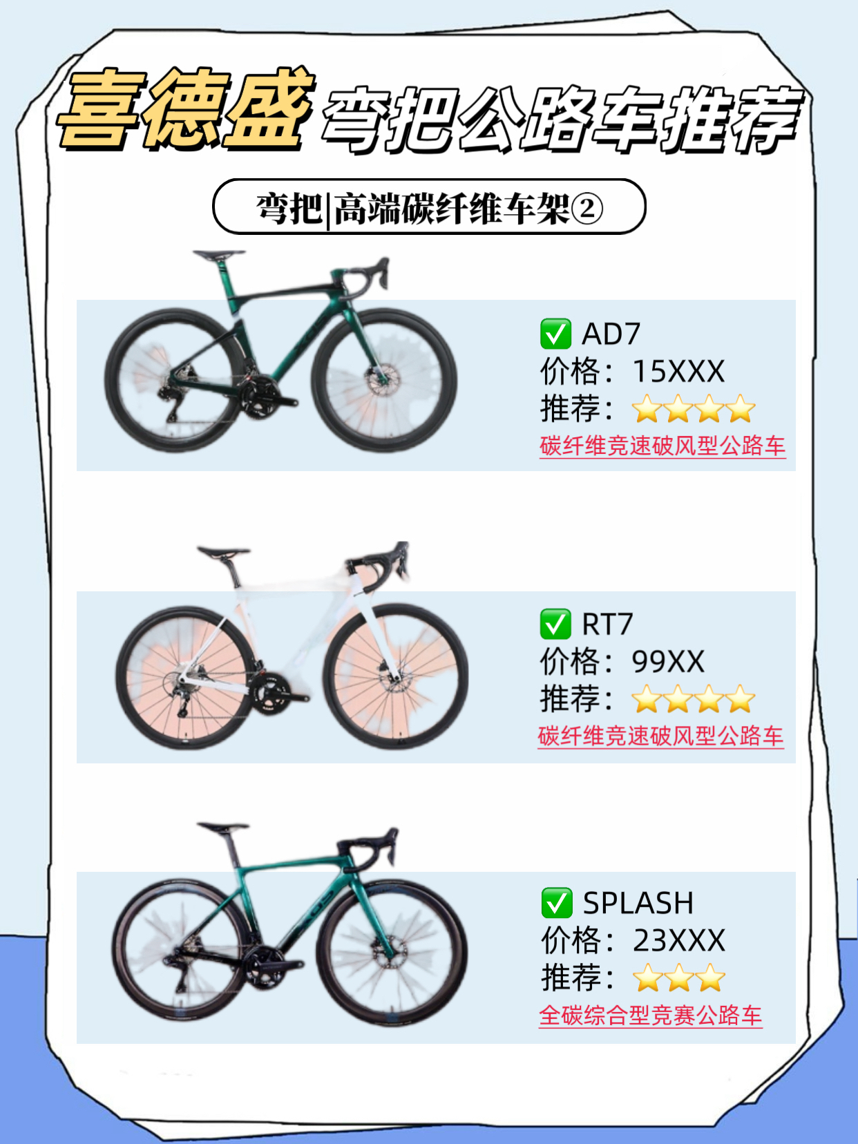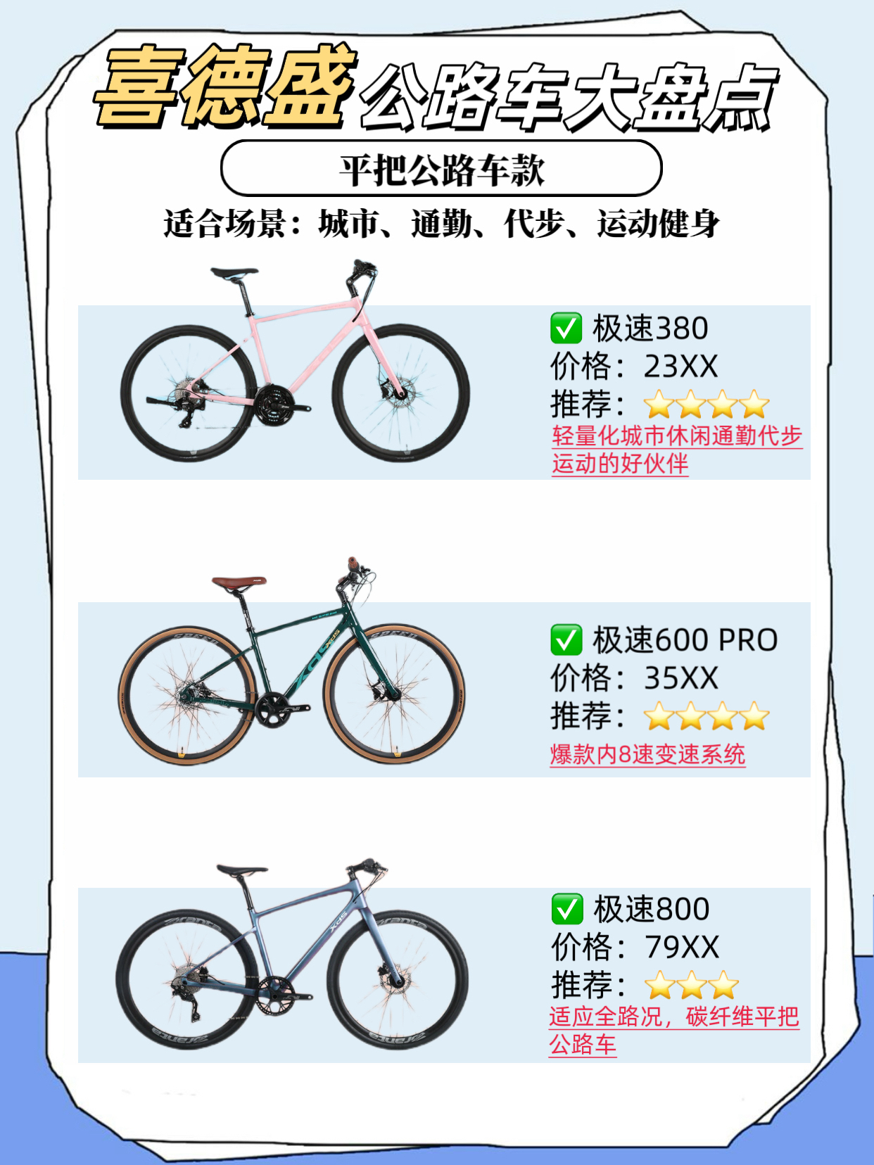 公路车大盘点推荐 🚴 来啦 🚨!! 看看哪款是你的菜 今天小编来给大家介绍一下喜德盛的热门公路车推荐吧!请跟着我往后看😊 ✅弯把公路车 适合场景:公路、平坦路面、城市、竞速等 1️⃣AD系列铝合金车架 AD300:入门级破风公路车 AD350:年轻人的第一辆公路车 AD500:高性价比电变公路车 2️⃣RS系列铝合金车架 RS360:时尚潮流综合型公路车 RS450 Pro:RS450升级版,全能...