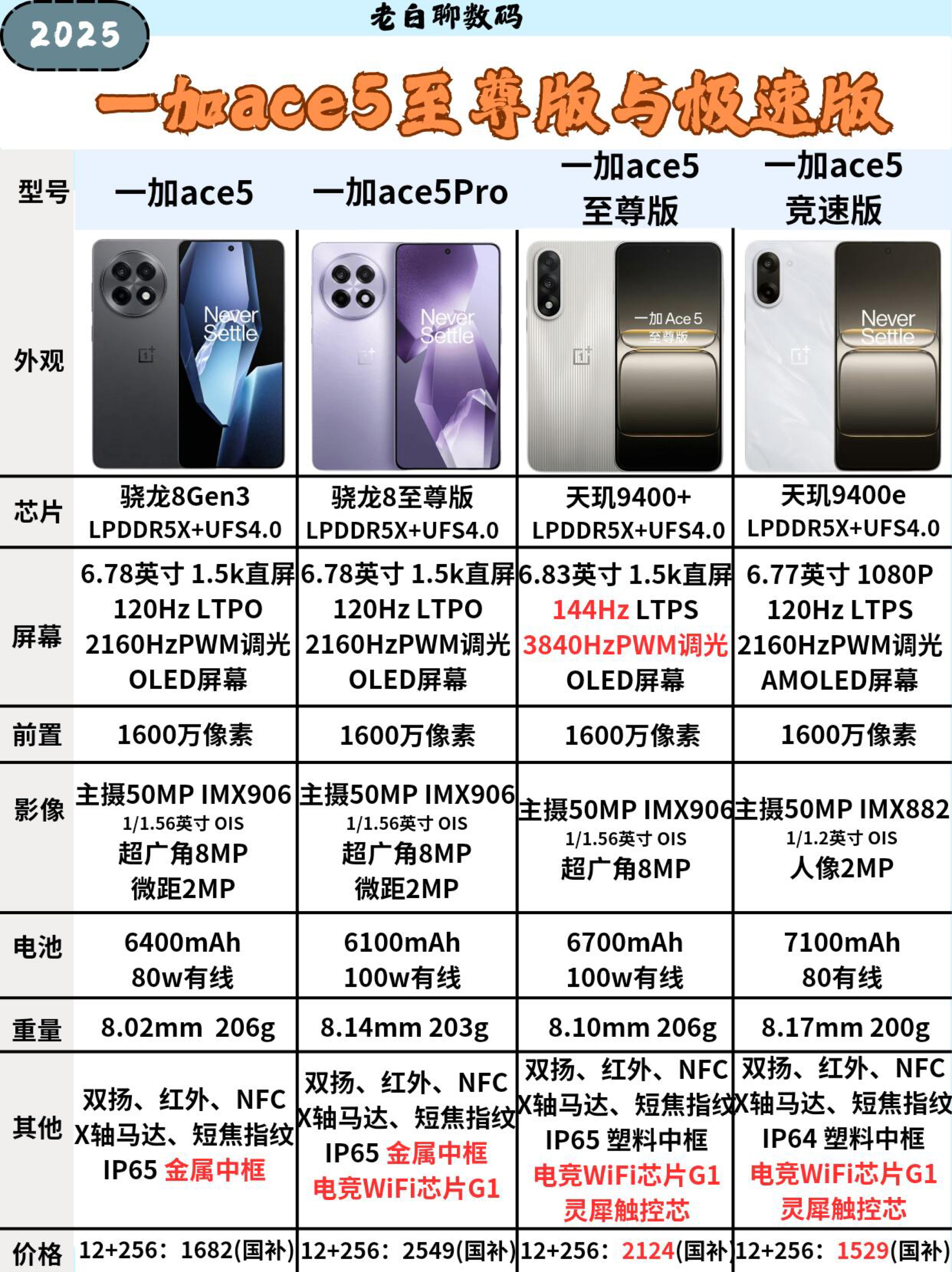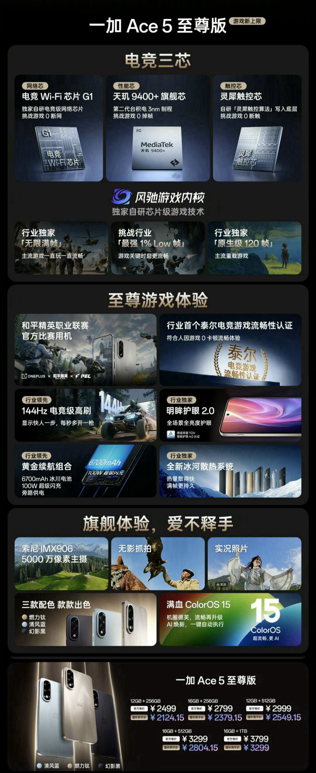 2025年05月27日下午14点30分,一加手机正式推出一加 Ace5 至尊系列的两款新机型,即Ace5 至尊版和Ace5 竞速版。 一、一加 Ace5 至尊版 ① 电竞三芯: ~ 网络芯:采用独家自研的电竞级网络芯片G1,致力于实现游戏过程中的零断网体验。 ~ 性能芯:搭载天玑9400+旗舰级处理器,采用第二代台积电3nm制程技术,旨在提供零掉帧的游戏性能。 ~ 触控芯:内置灵犀触控芯,采用自...
