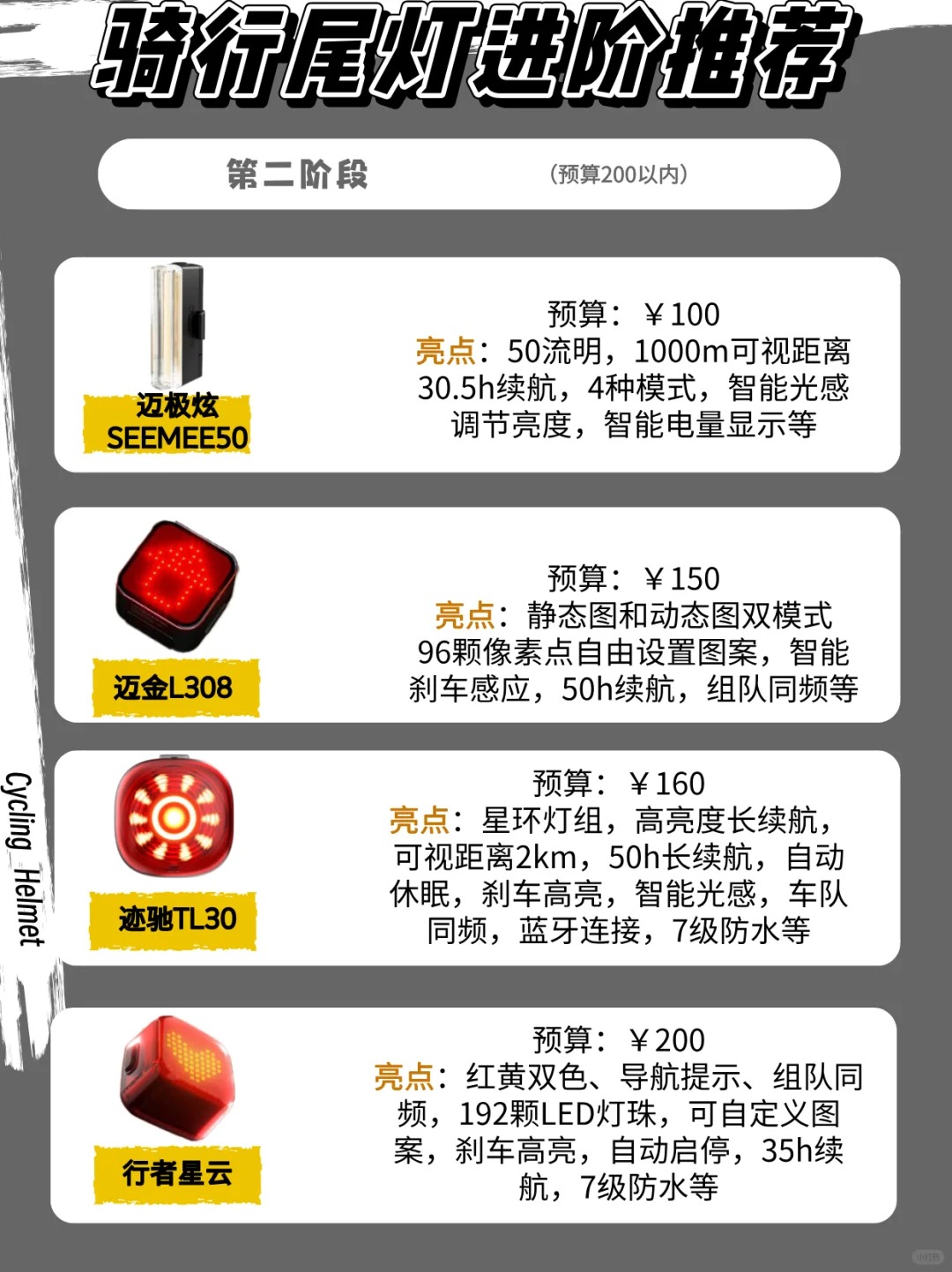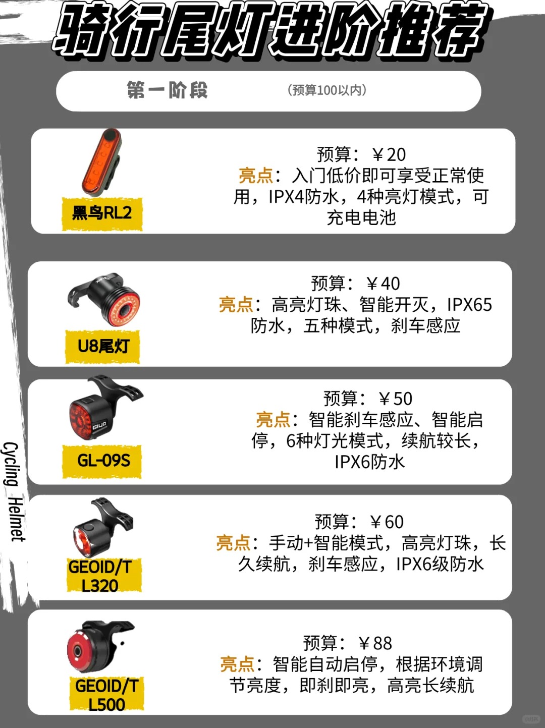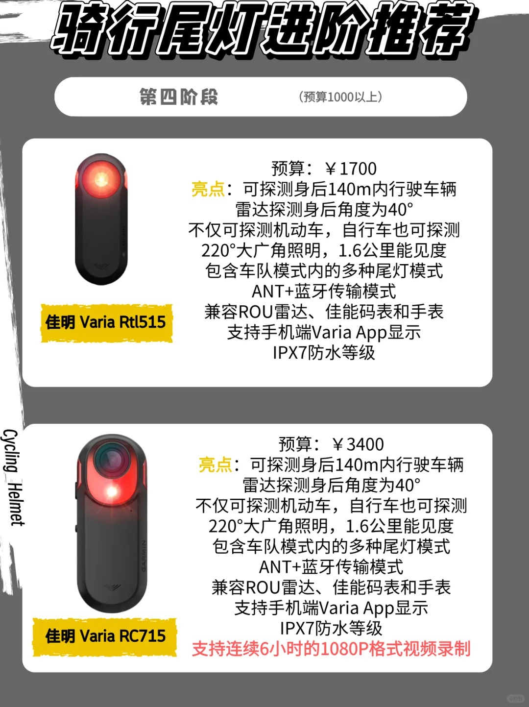 大家最近骑行一定要注意安全,因为最近一段时间骑行事故特别多 这些事故我看了一下大部分都是放坡、追尾、被压,被侧面撞击.....有些还好,只是轻伤,但是被报道的那就真的很严重了 ✅所以骑行尾灯装备真的很重要,我仔细查阅了网上的尾灯,结合身边朋友使用体验,罗列了14款尾灯💡。希望能够帮助正好需要尾灯的朋友们 🕹️这14款尾灯我大致分为四个阶段:入门、进阶、智能和佳明四个阶段 第一阶段入门款【预...