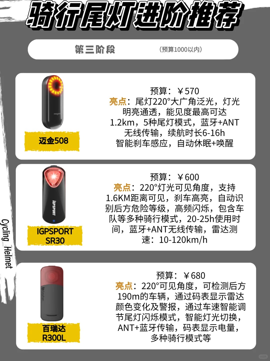 本篇笔记关联了MAGENE/迈金 L308 高亮 警示 自行车灯 尾灯、IGPSPORT 迹驰 SR30 智能雷达尾灯 自行车灯 雷达尾灯SR30、BLACKBIRD/黑鸟 RL2 智能 夜骑行 警示 强光 山地单车 自行车灯 RL2智能尾灯等商品,为用户提供真实的使用体验和购买参考。