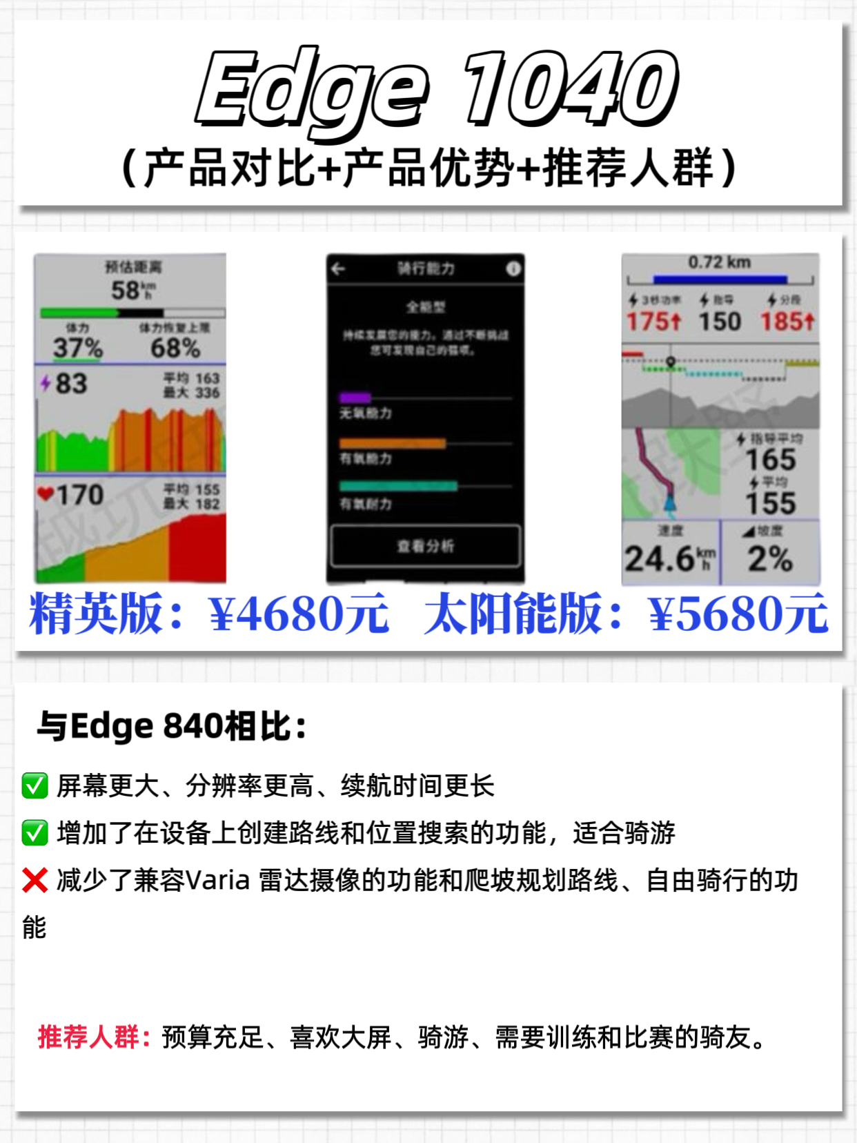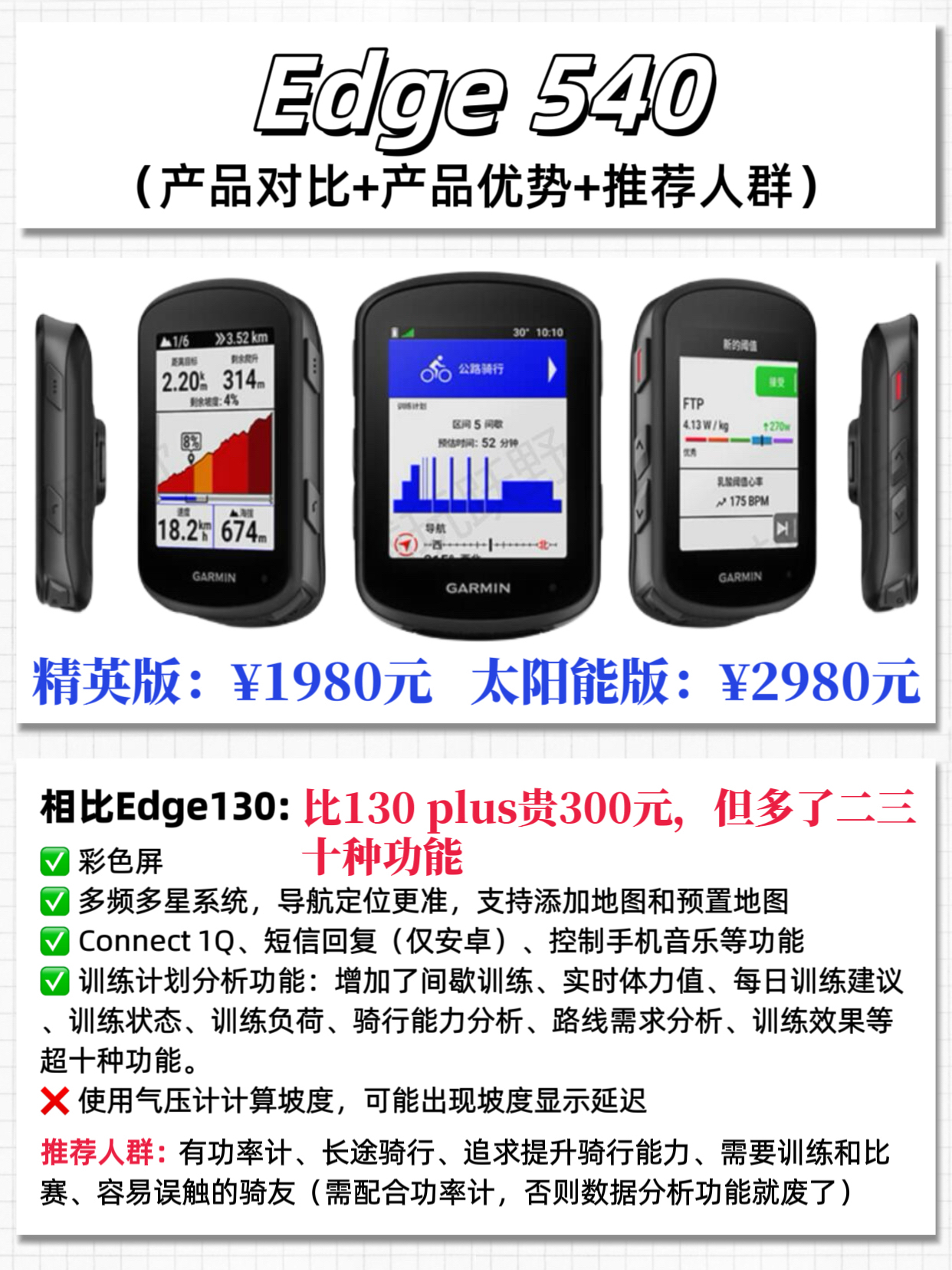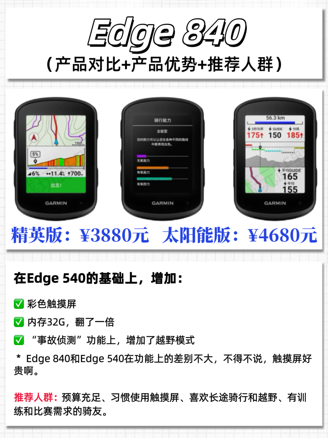 本篇笔记关联了Garmin/佳明 Edge 540 防水 太阳能 轨迹导航 路线分析 自行车码表 Edge540、Garmin/佳明 Edge 840 防水 无线 太阳能 长续航 自行车码表 840、Garmin/佳明 Edge1050 路线分析 事故侦测 轨迹导航 智能 自行车码表 Edge 1050等商品,为用户提供真实的使用体验和购买参考。