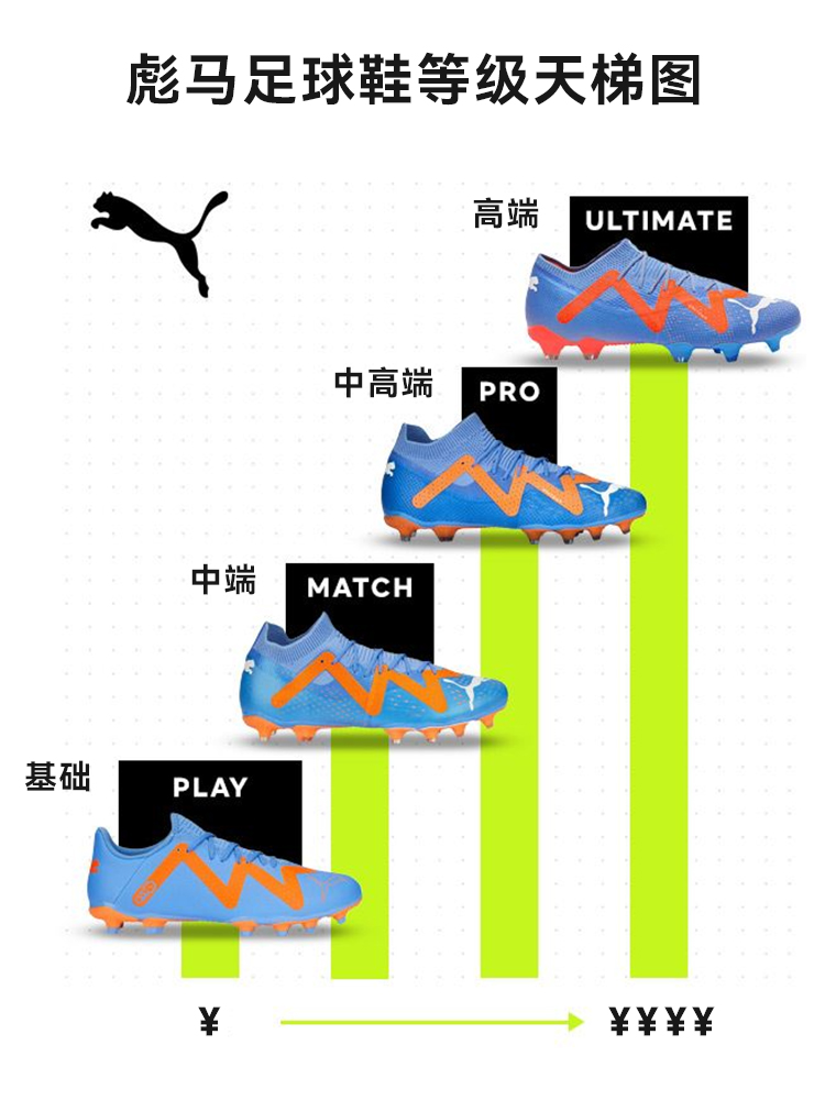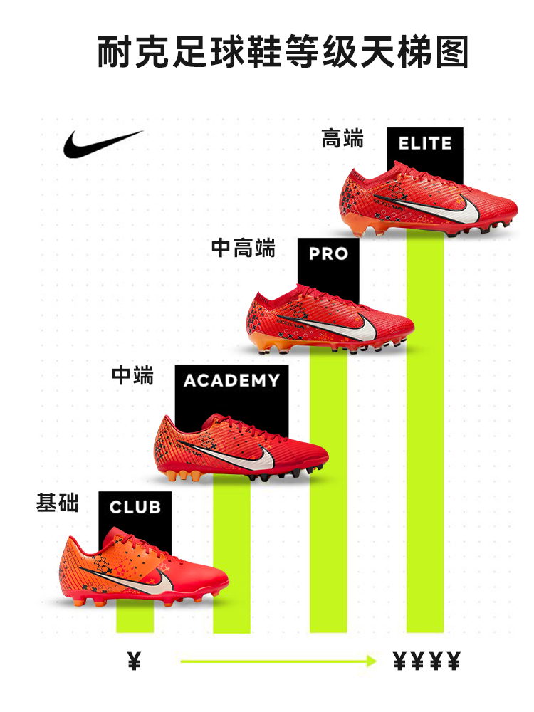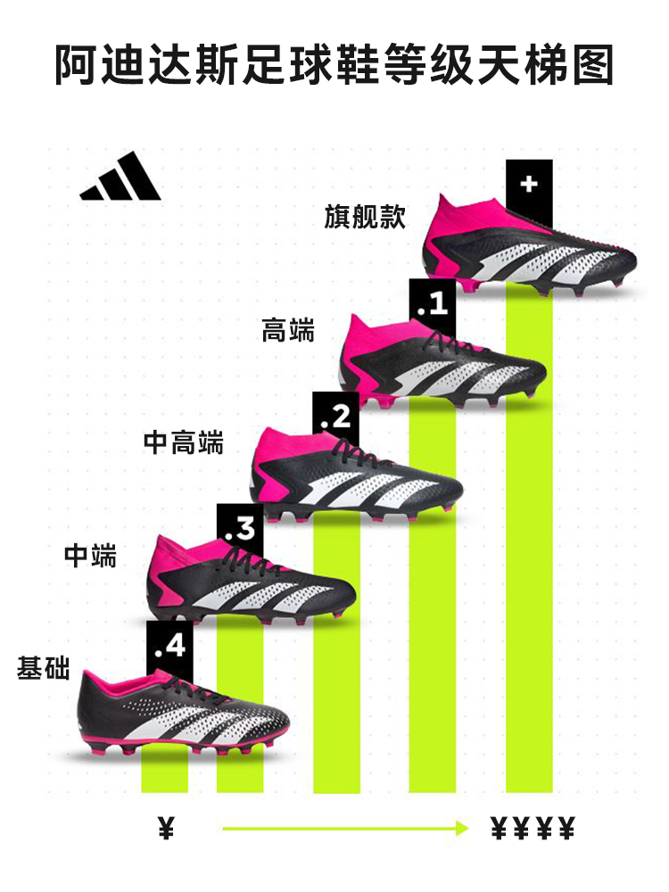 1、Nike/耐克等级划分: Elite(DF):顶级高端款 Pro:次顶中高端款 Academy:中端款 Club: 入门基础款 2、Adidas/阿迪达斯等级划分: +:旗舰版 1:顶级高端款 2:次顶中高端款 3:中端款 4:入门基础款 3、Puma/彪马等级划分: Ultimate:顶级高端款 Pro :次顶中高端款 Match:中端款 Play:入门基础款 #足球鞋怎么选