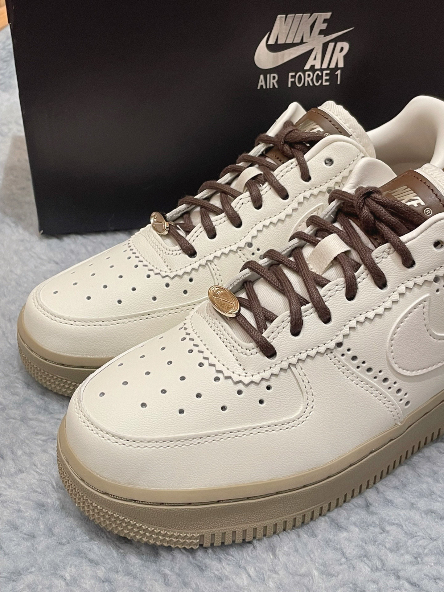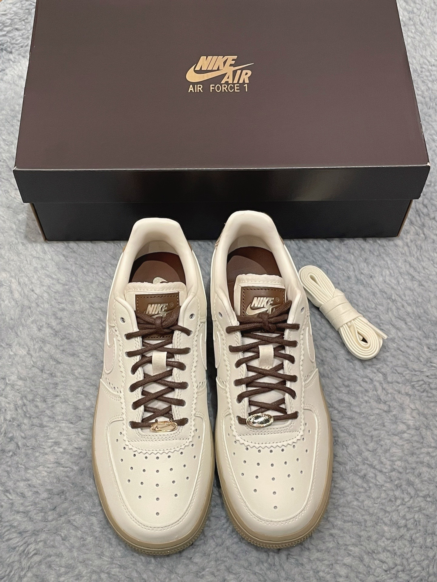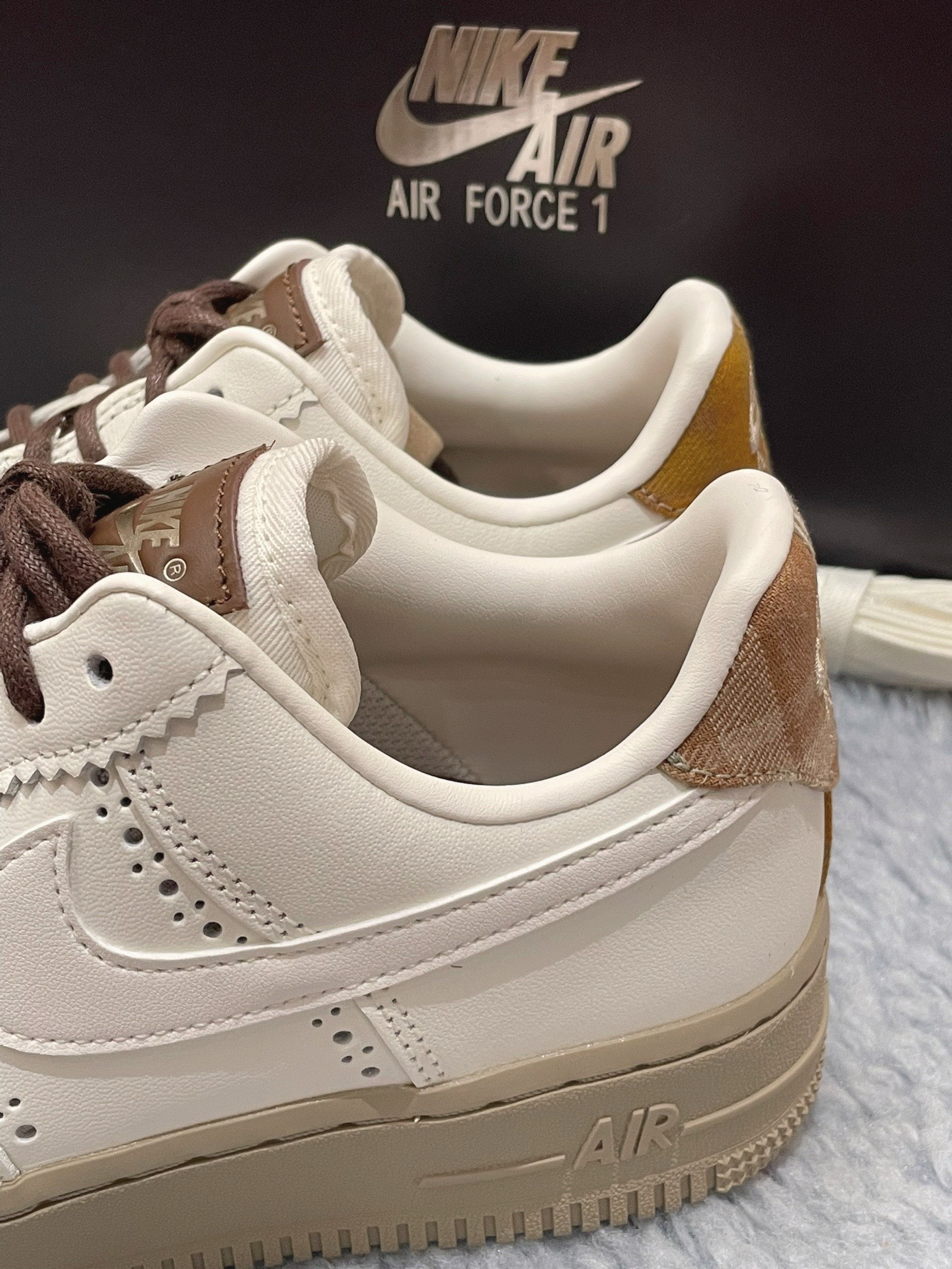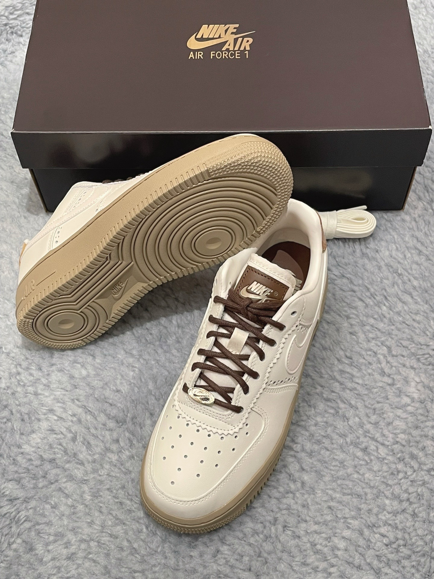 一眼沦陷的「暖咖调色盘」 ◾️ 奶白色荔枝纹皮革鞋面像融化的香草冰淇淋,浅棕色Swoosh与后跟贴片如咖啡拉花般流动,搭配做旧生胶大底的「微醺焦糖色」,把秋冬的慵懒感直接焊在脚上! ◾️ 独家「细节杀」:鞋带孔边缘的锯齿状皮革装饰暗藏复古腔调,侧身透气孔大小渐变如咖啡豆排列,后跟格纹帆布贴片像杯套般温暖,连鞋舌金属扣都镀上了奶茶金光泽~ AF1 35年经典的「隐形舒适魔法」 ✅ 头层牛皮鞋面越穿...