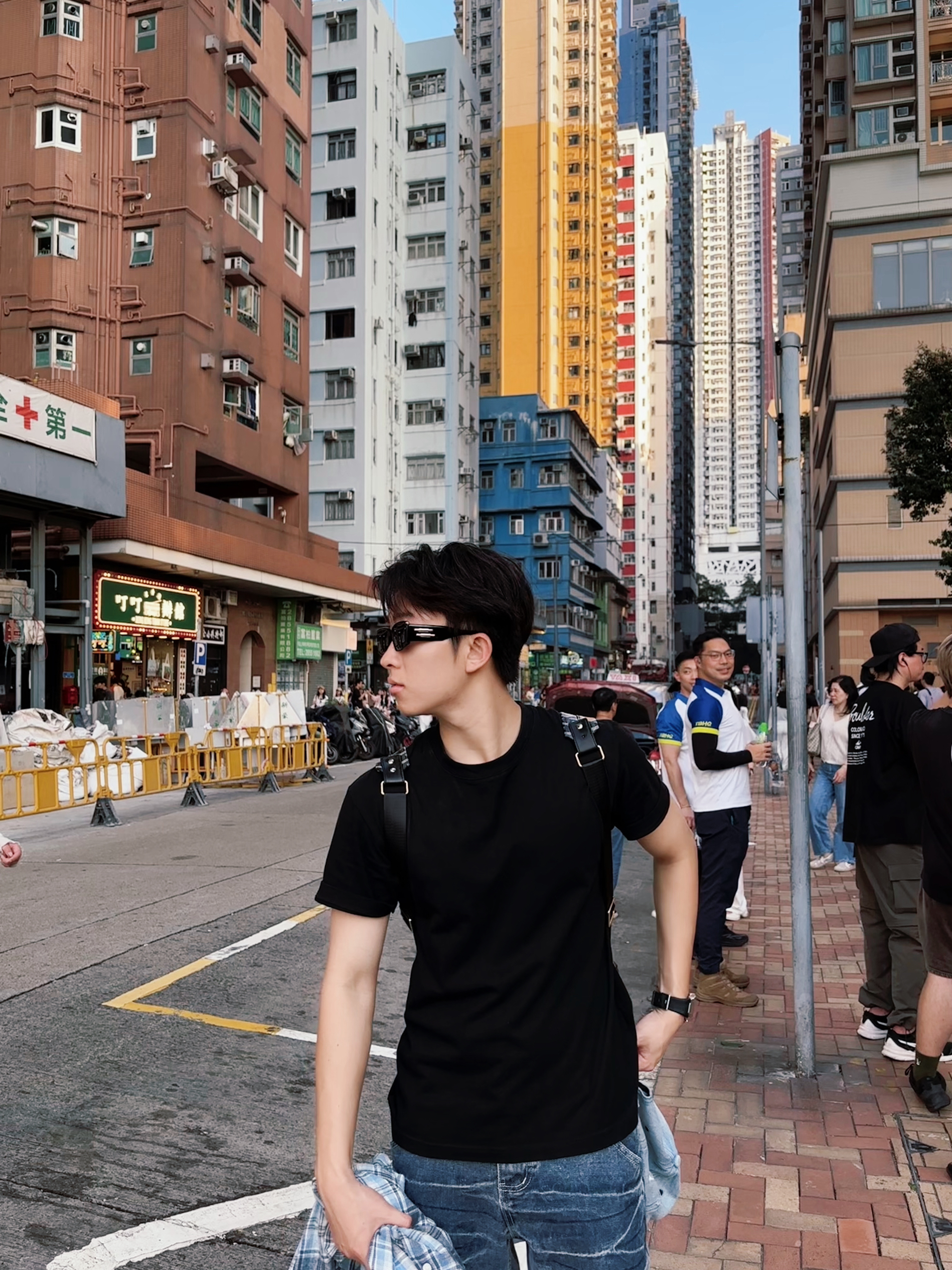 在香港小衬衫一出场 那一整个港风味道就出来啦 上身一件基础款的黑T 袖口往上翻彰显小心机 衬衫别在腰上展现搭配 上身可以再搭配一个同色系双肩包增加搭配性 下身选择一条做旧蓝牛也是很有港风的味道了哈哈哈哈(腰间可以系一顶同色系牛仔帽子点缀) 搭配一双蓝牛的运动鞋 毕竟谁不知道去香港要暴走两w公里哈哈哈哈哈哈 身高|体重:175/125 👔 上衣:一件基础纯黑短袖 👖 下装:蓝色做旧牛仔裤...