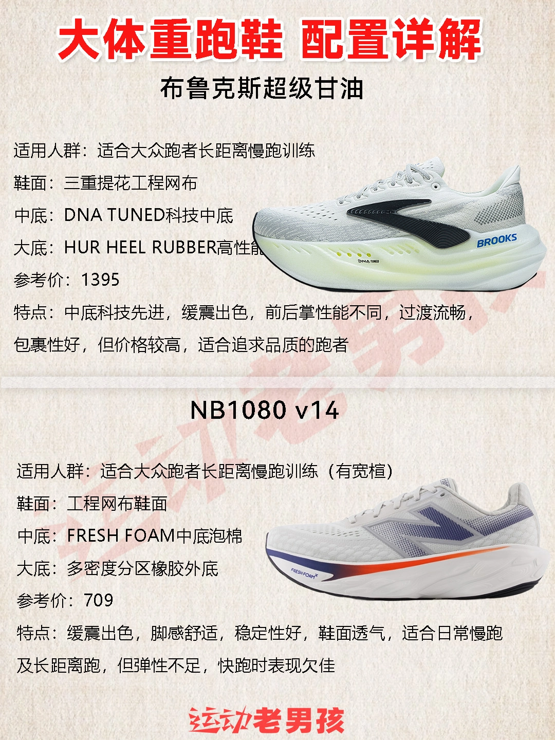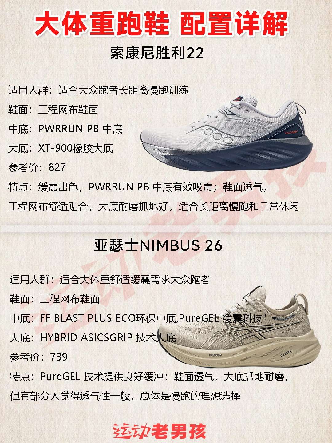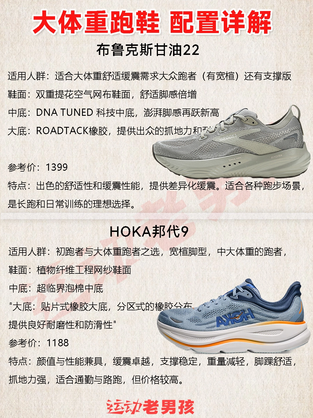 假期一过,大家的大体重趋势是不是越来越明显了? 春夏运动跑步开始提上日程! 大体重者在跑步时,对地面的冲击力更大 大体重者在跑步时,对地面的冲击力更大,易受伤。 缓震材料能更好地吸收冲击力,保护关节。 因此,为确保安全与舒适, 大体重者应选择专为其设计的适合大体重跑鞋。 - 老男孩也整理部分品牌适合大体重跑鞋款式,供大家选择: 得物的尺码颜色都很全,价格也很合理,可做参考 -- 索康尼胜利22 ...