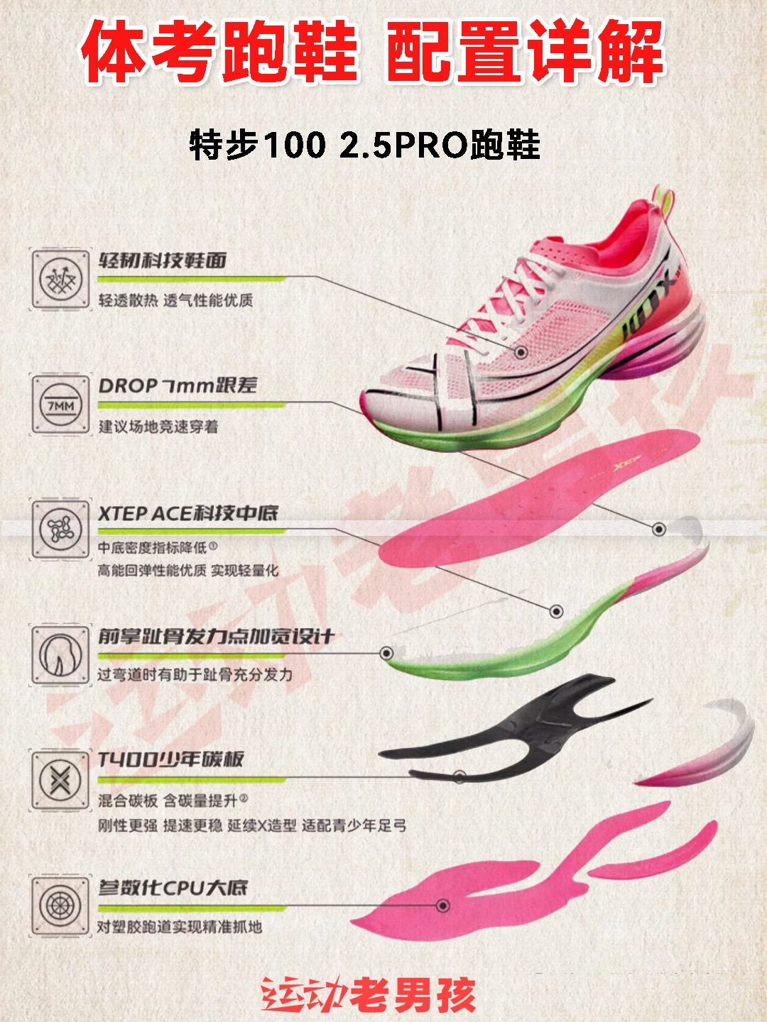中学生体考体测该穿什么鞋? 跑步!应该选跑鞋? 是的,再具体点,是竞速跑鞋!再进一步,是场地竞速跑鞋! 适用于塑胶田径场地体考体测人群 800/1000m,跳高/跳远[跳绳]/间歇跑/场地训练 体测多场景 那该怎么选? 选薄底的,脚和地板接触反馈就快,有利于提速! 选重量轻的,减少体力消耗, 这里特别推荐:特步100 2.5PRO跑鞋 专为场地竞速研发的: T400少年碳板:刚性更适配青少年...