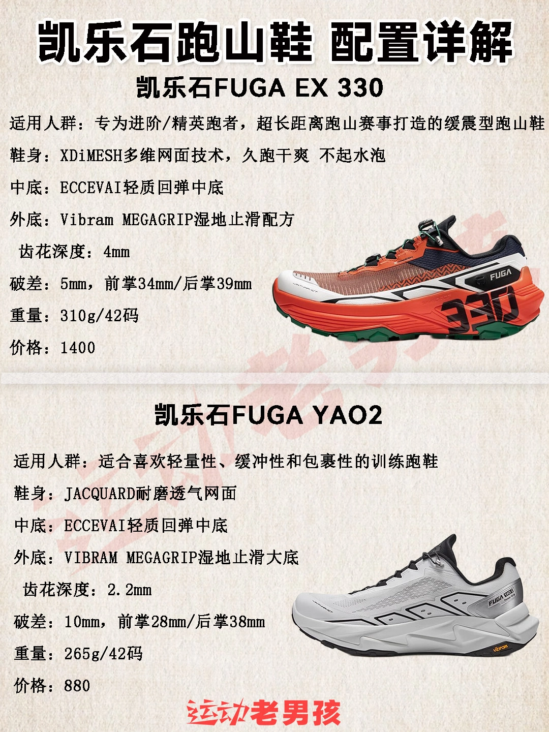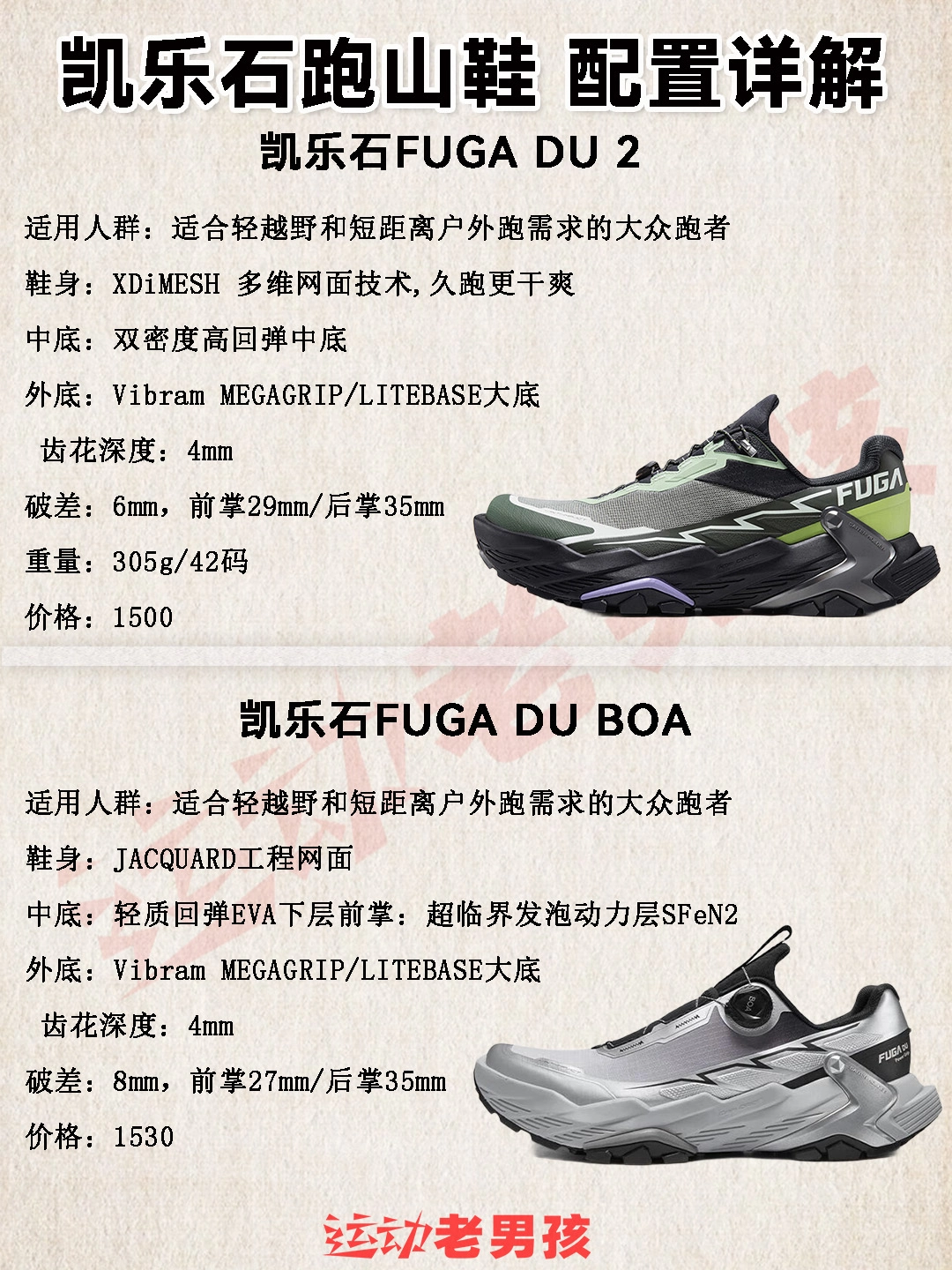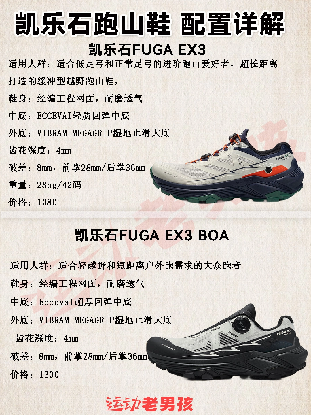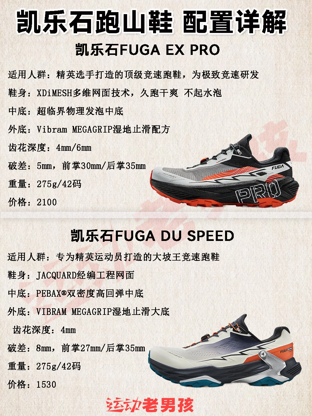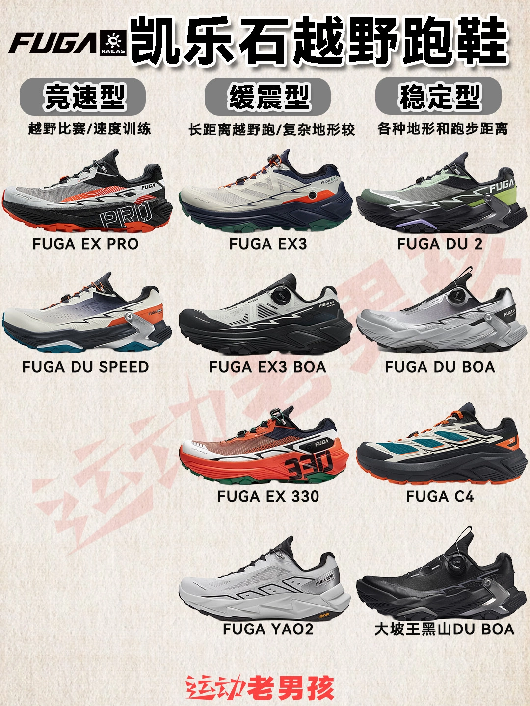 近年来,跑山正像马拉松运动在全球各地普及,各项赛事也越来越多! 参与越野跑山的跑友,体验与自然同行的户外运动。 老男孩的跑友们,可以先了解下凯乐石越野跑山鞋怎么选择! 这边也整理竞速型,缓震型,稳定型分类矩阵,方便选择: 凯乐石FUGA EX PRO:精英选手打造的顶级竞速跑鞋,为极致竞速研发 凯乐石FUGA DU SPEED:专为精英运动员打造的大坡王竞速跑鞋 凯乐石FUGA EX3:适合低...