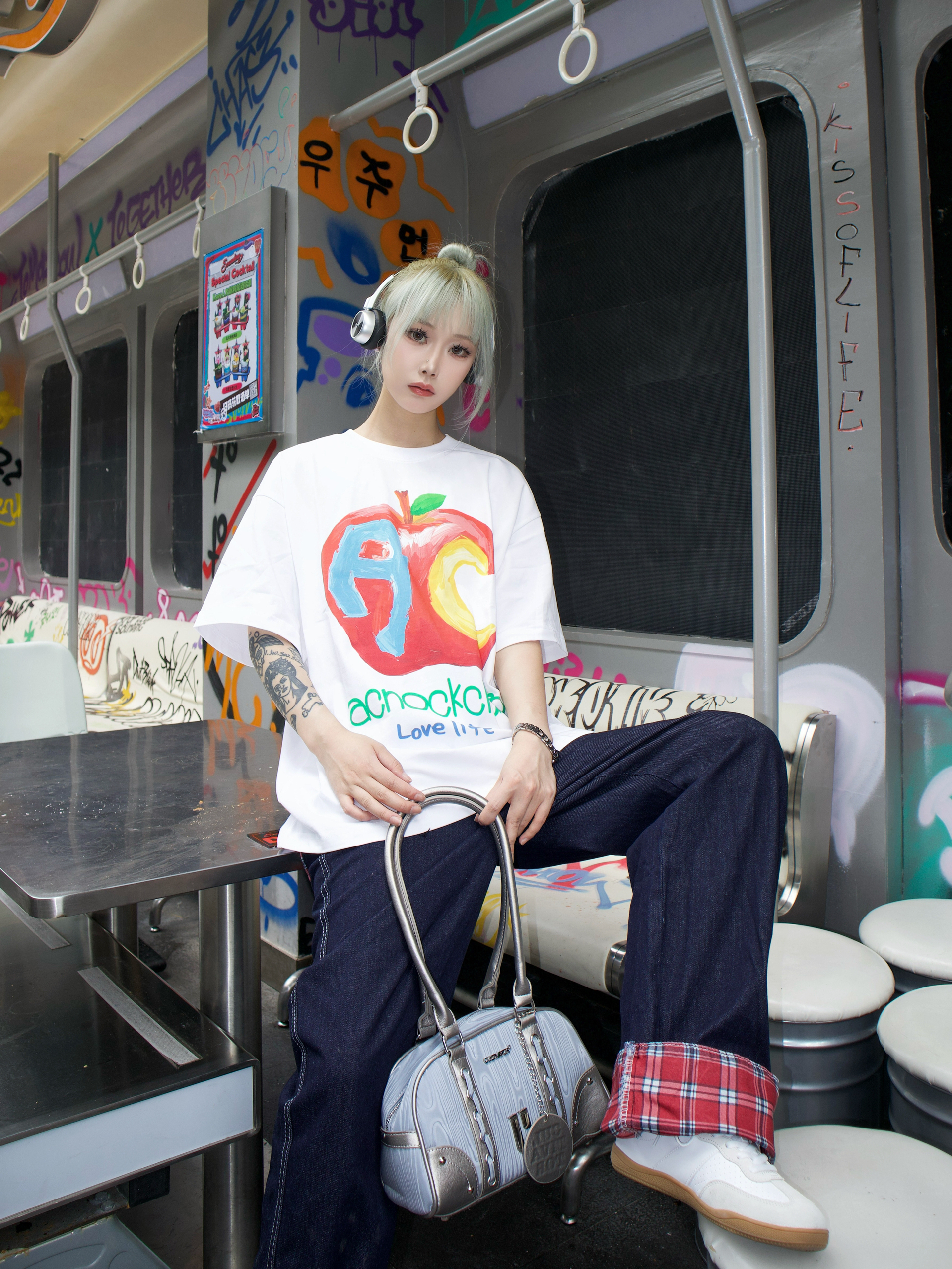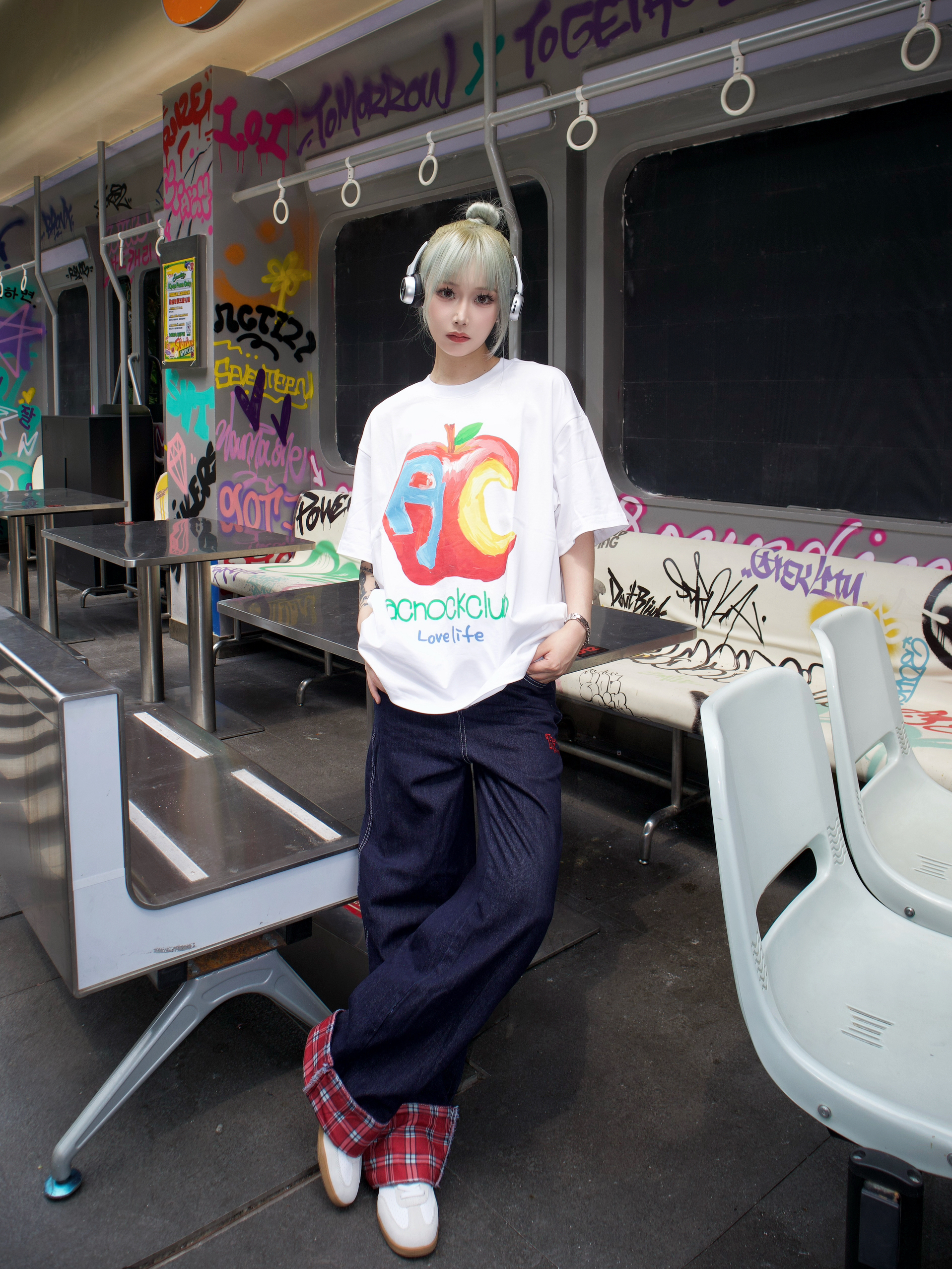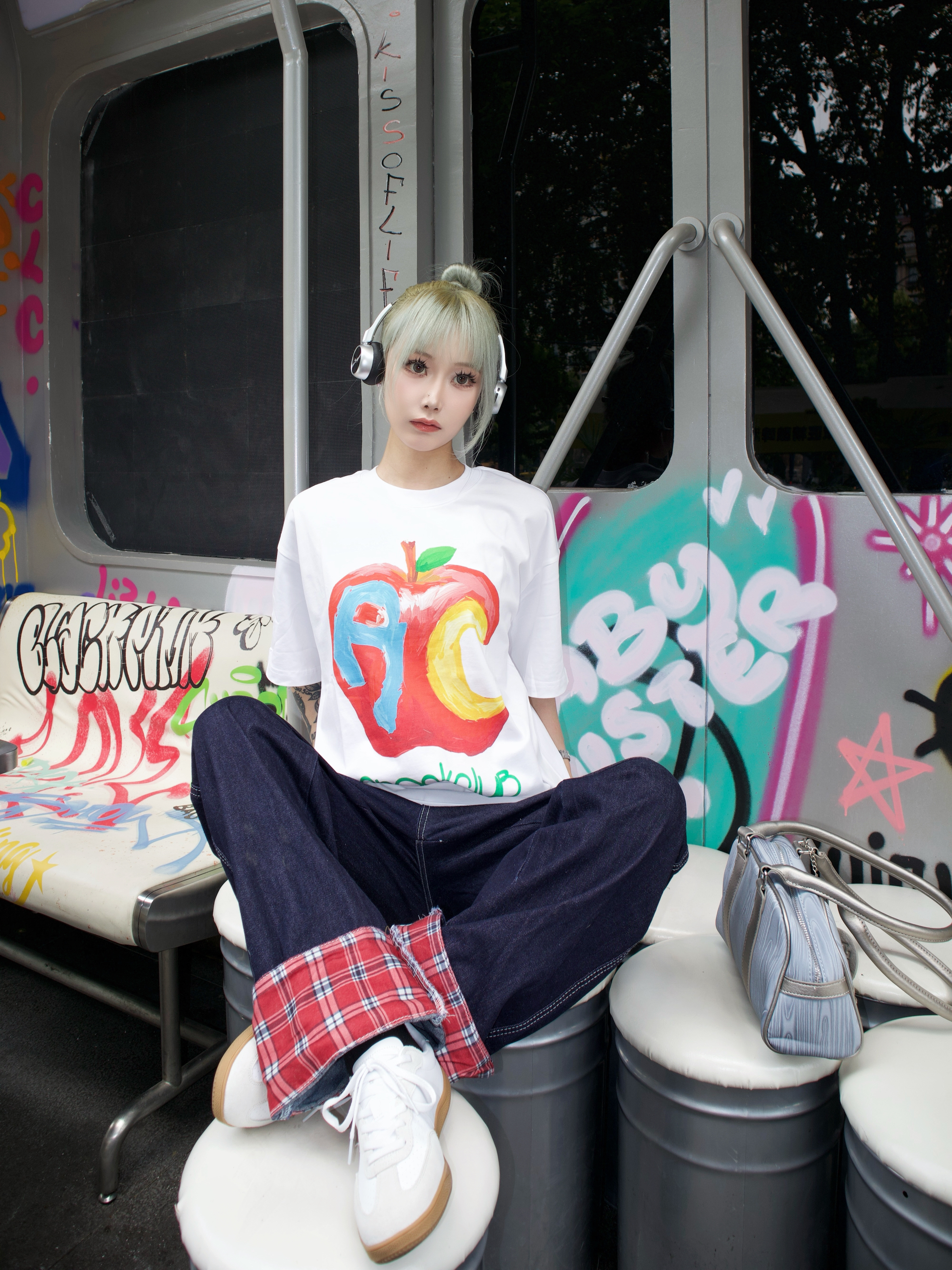 夏日穿搭白 T 是灵魂!纯棉基础款舒服不用说 重点在胸口的 🍎咬一口印花! 带点小趣味又不会太夸张 清爽里带点小个性 这条牛仔裤版型巨好显腿直显腿长! 红色格子拼接 把基础白T衬得一点都不无聊了! 小心机在耳机!🎧 黑白配色的挂脖耳机一戴 科技感➕运动感 立刻有! 走路带风听歌超方便!