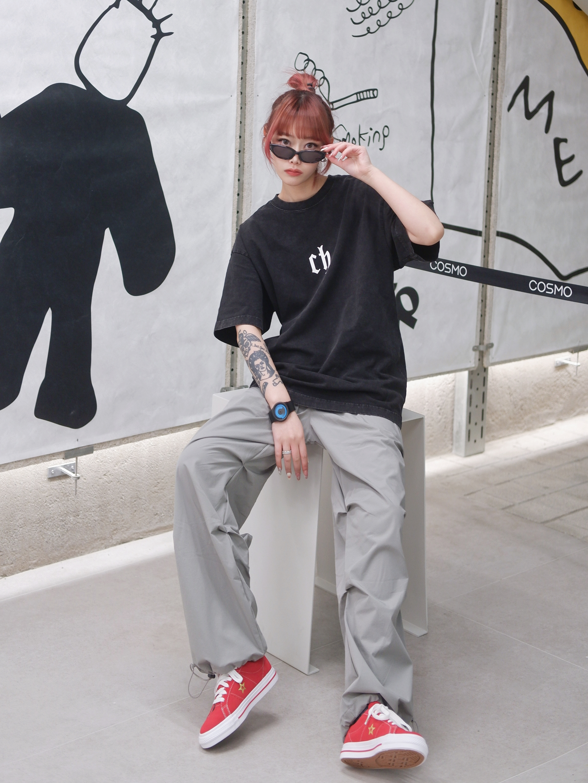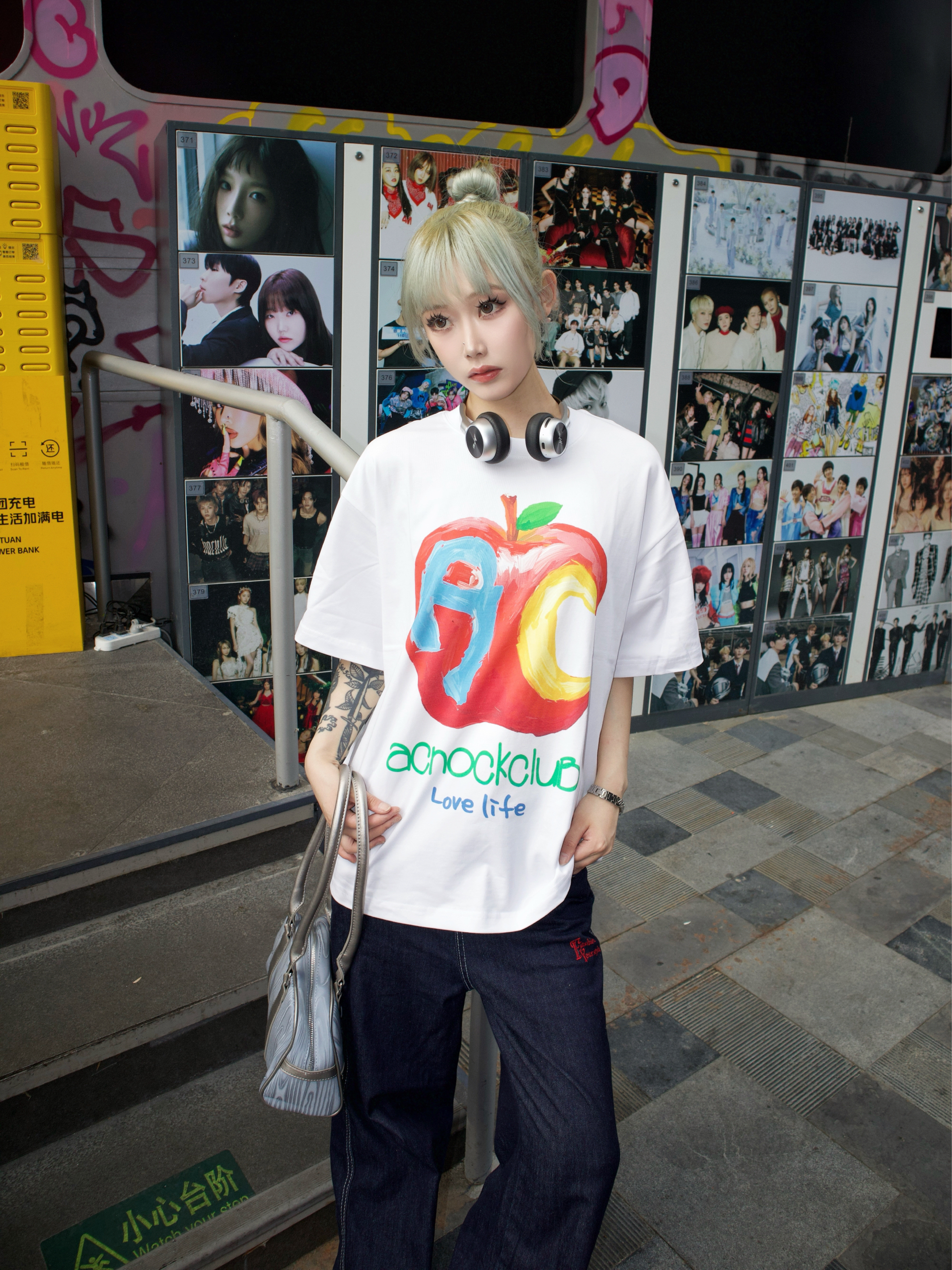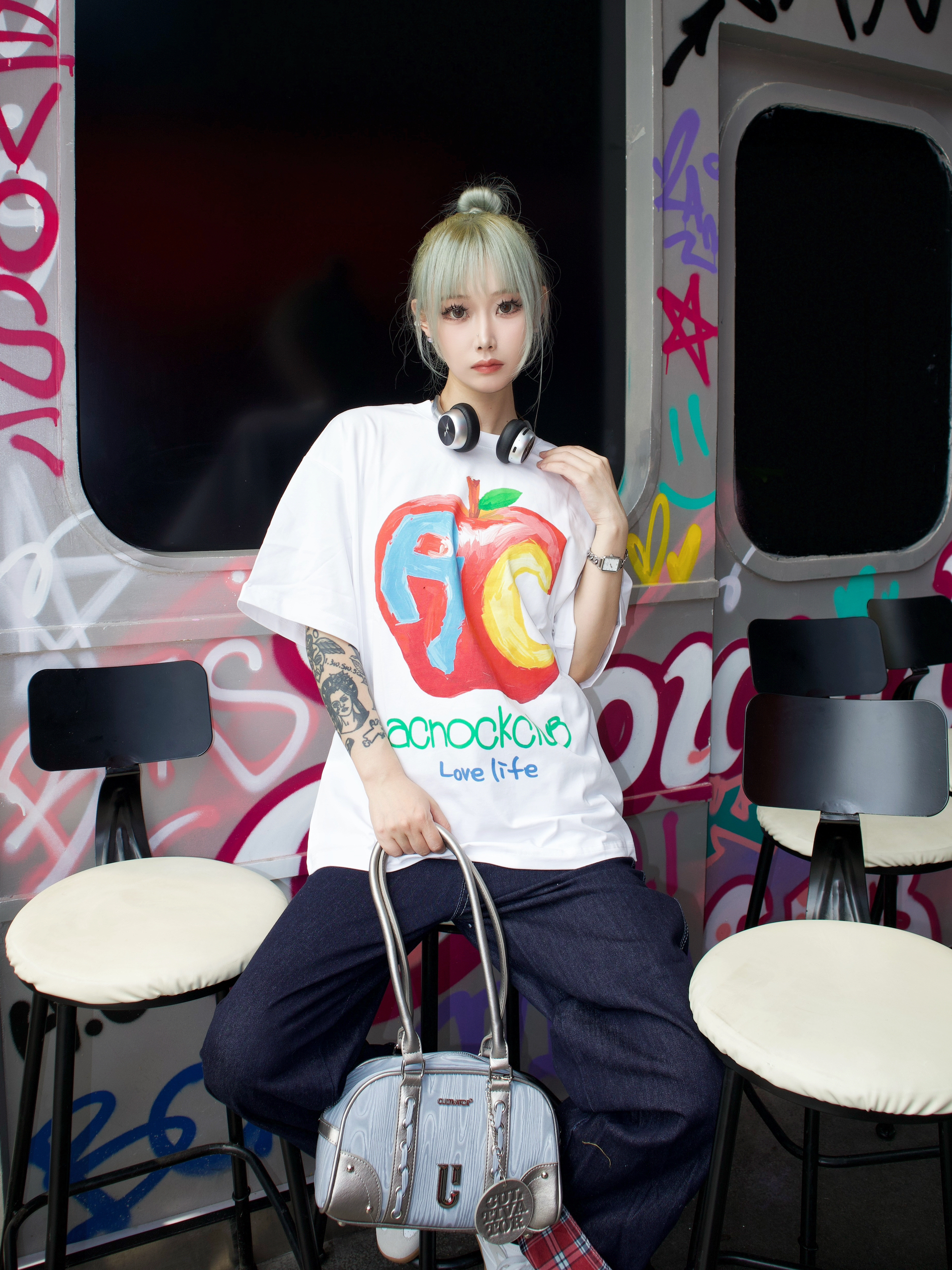 夏日穿搭白 T 是灵魂!纯棉基础款舒服不用说 重点在胸口的 🍎咬一口印花! 带点小趣味又不会太夸张 清爽里带点小个性 这条牛仔裤版型巨好显腿直显腿长! 红色格子拼接 把基础白T衬得一点都不无聊了! 小心机在耳机!🎧 黑白配色的挂脖耳机一戴 科技感➕运动感 立刻有! 走路带风听歌超方便!