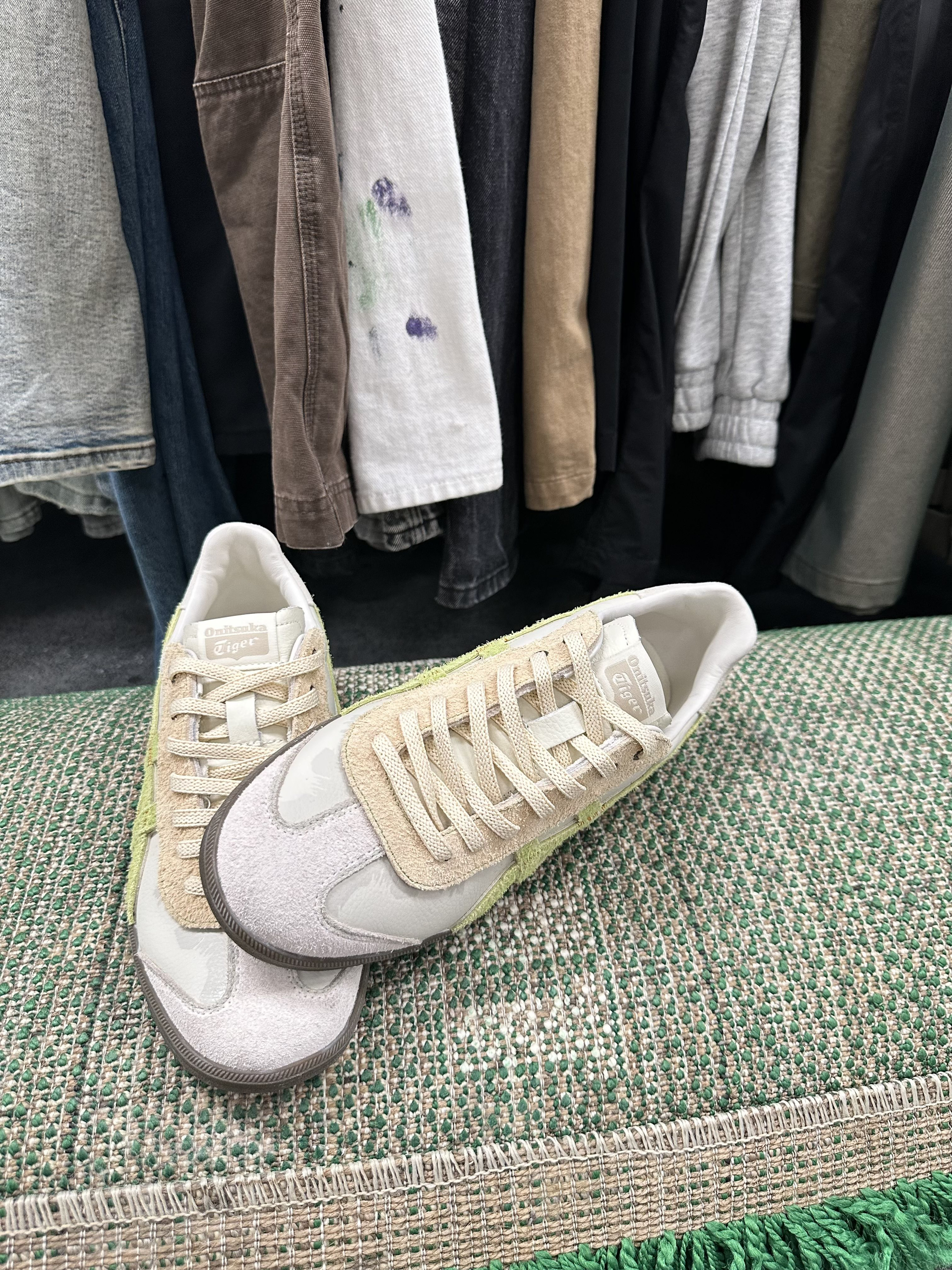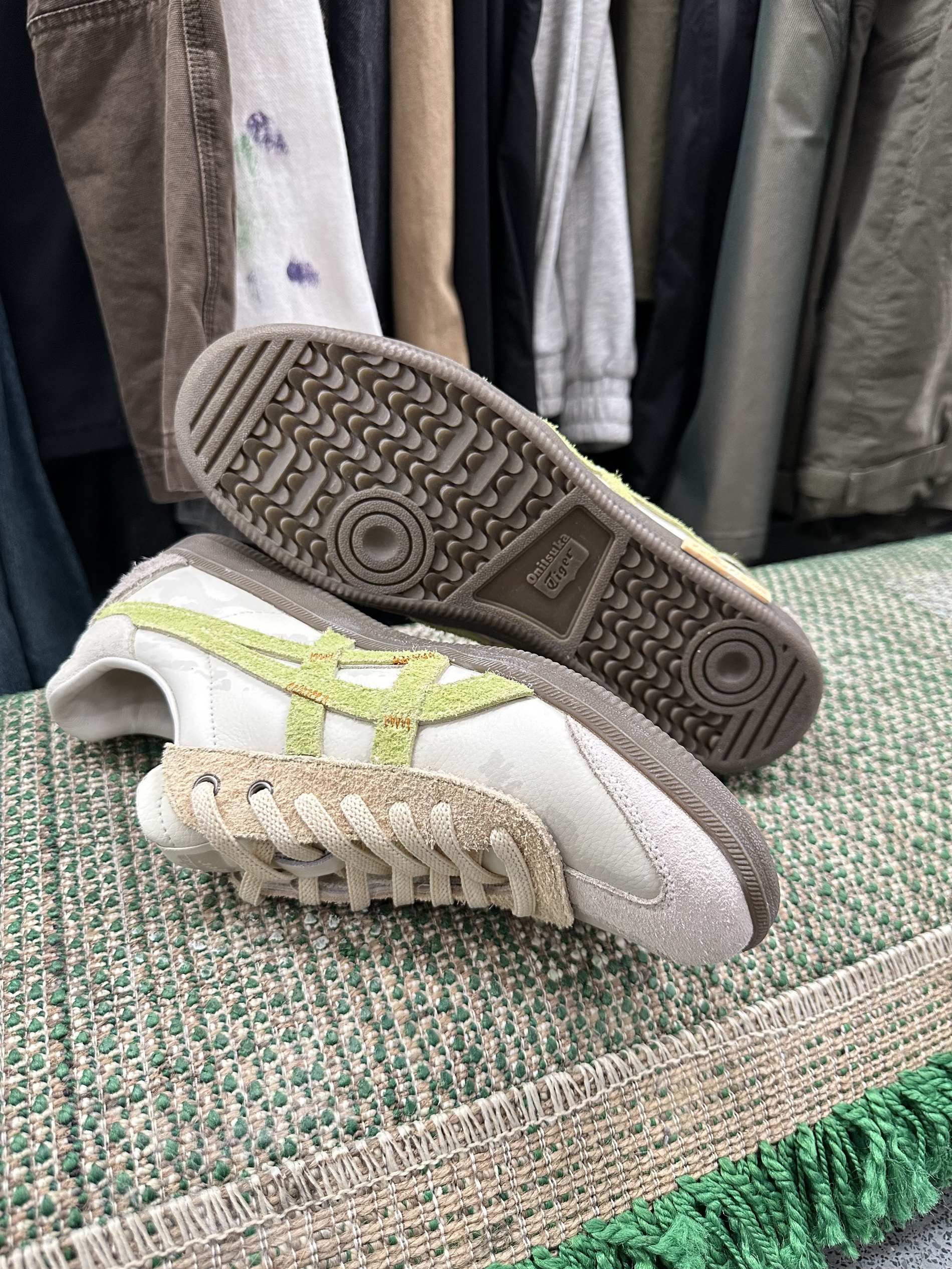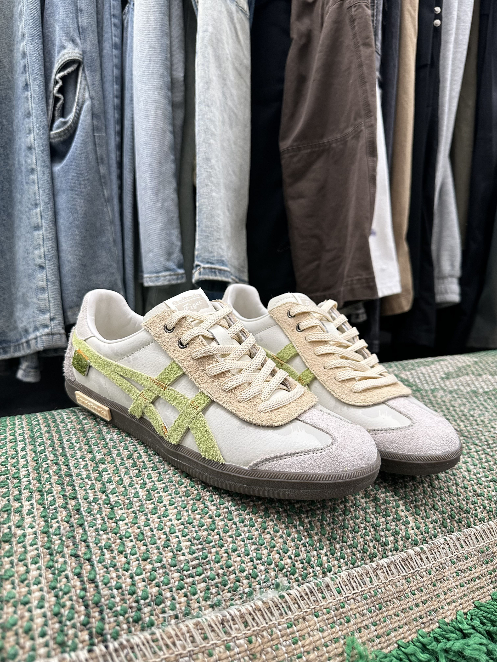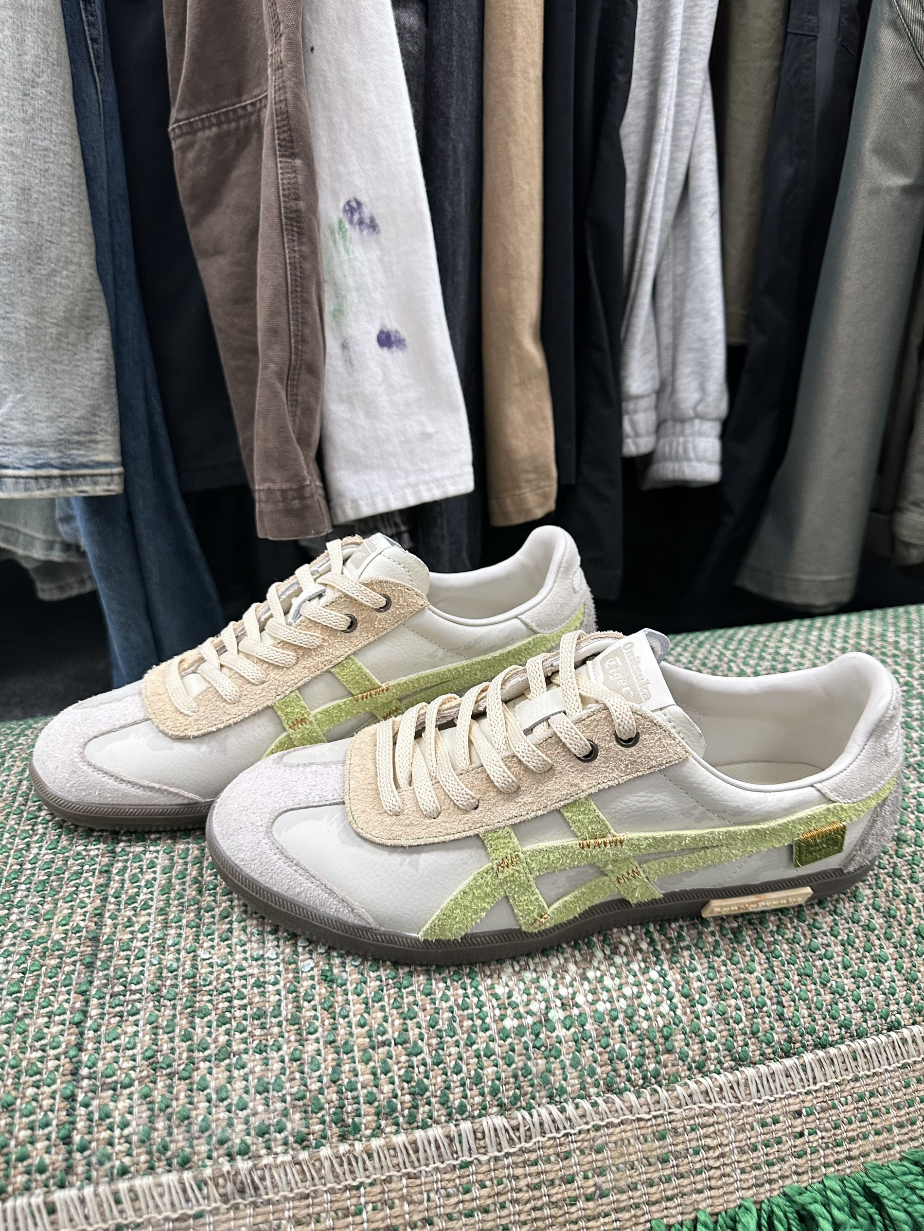 鬼塚虎家的板鞋之前就穿过,但这个配色我直接爱了😍,它是来自熊猫恶作剧定制板鞋 颜色是米绿配色,真的很清新,太适合夏天了吧 鞋面是翻毛皮材质+皮革拼接而成,摸着很有质感 上脚就很轻便,软软的很舒服😌,走起路来也不累脚 平时搭配休闲裤,短裤都很好看啊