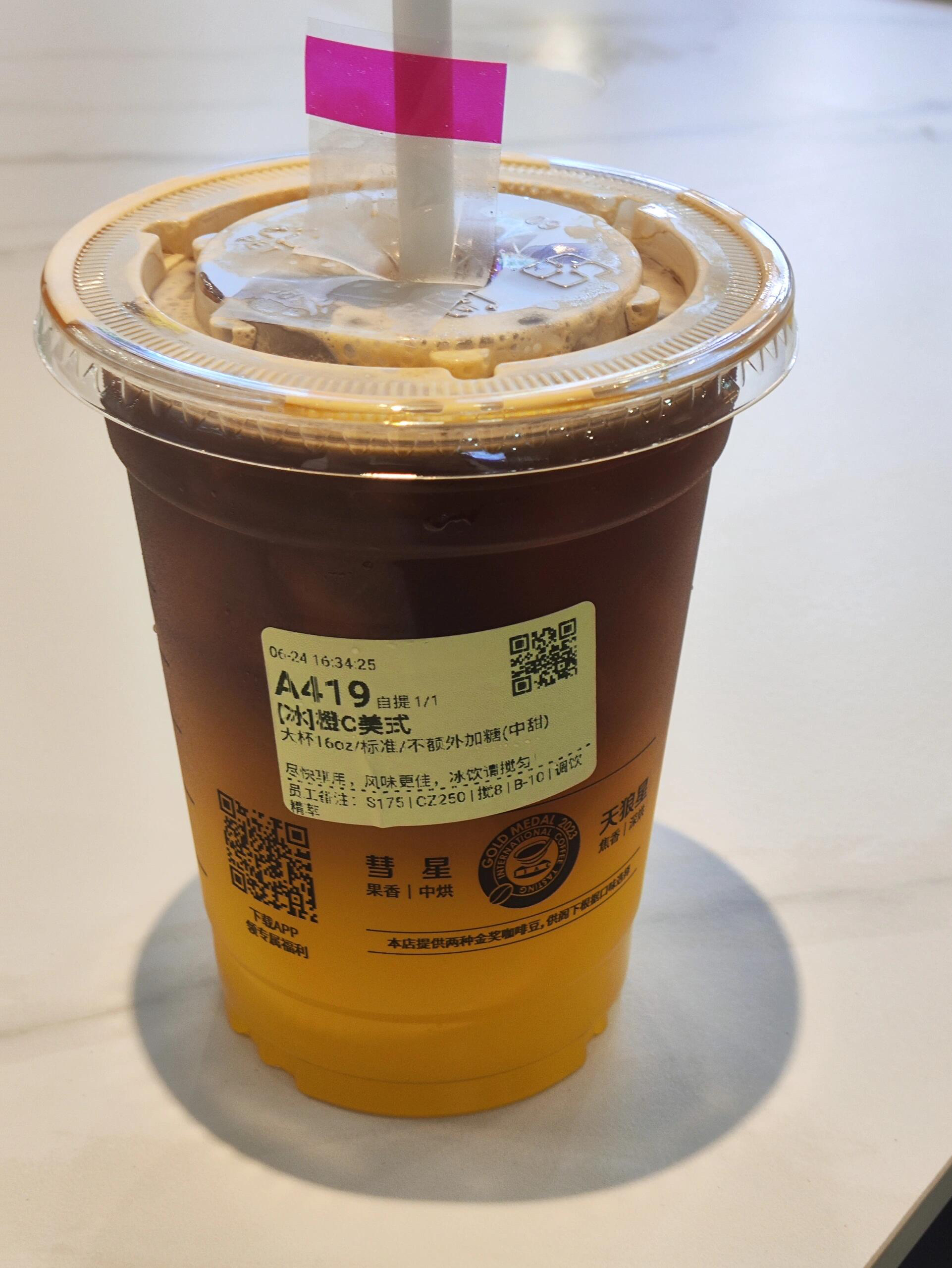 对于不怎么爱喝美式的我来说经过深思熟虑最终点了橙c款。很惊喜!好喝的,甜甜橙汁味,不过对于喝惯无糖美式的人来说应该会偏甜一些。我不怎么爱喝甜的人觉得还能接受,这款甜度比奶茶甜度相比会好一点,很清爽,没有奶茶店果糖的那种齁甜味。 对我来说不搅匀喝会好喝一点,这样果汁味偏多,然 后中间混着一点咖啡的焦香味口感蛮不错的! 不怎么爱喝美式的可以试试这一款!