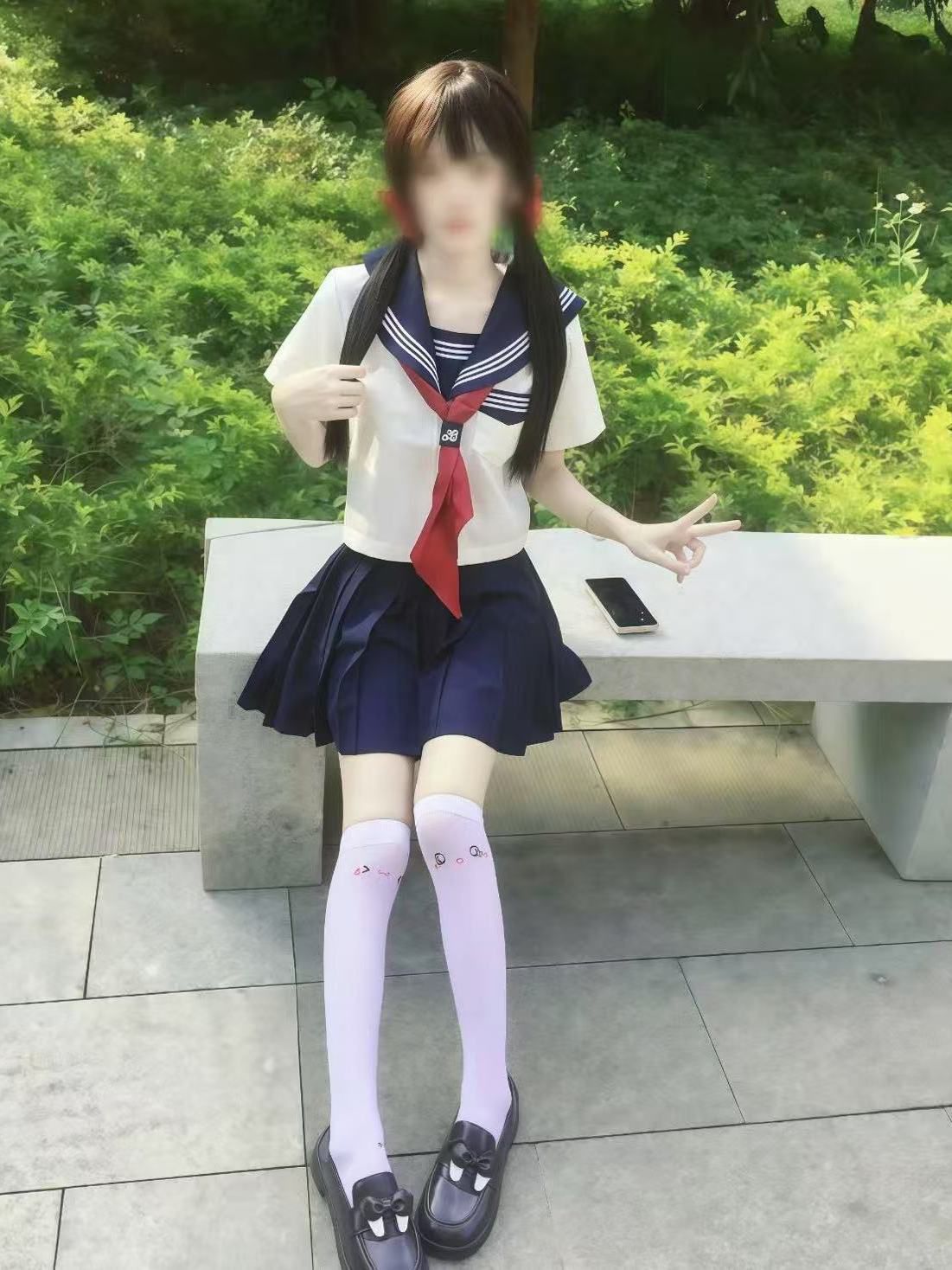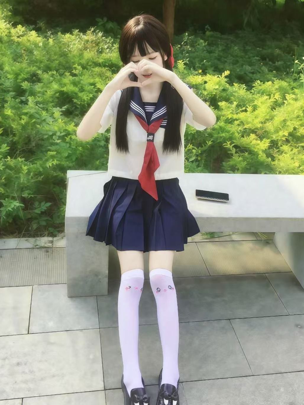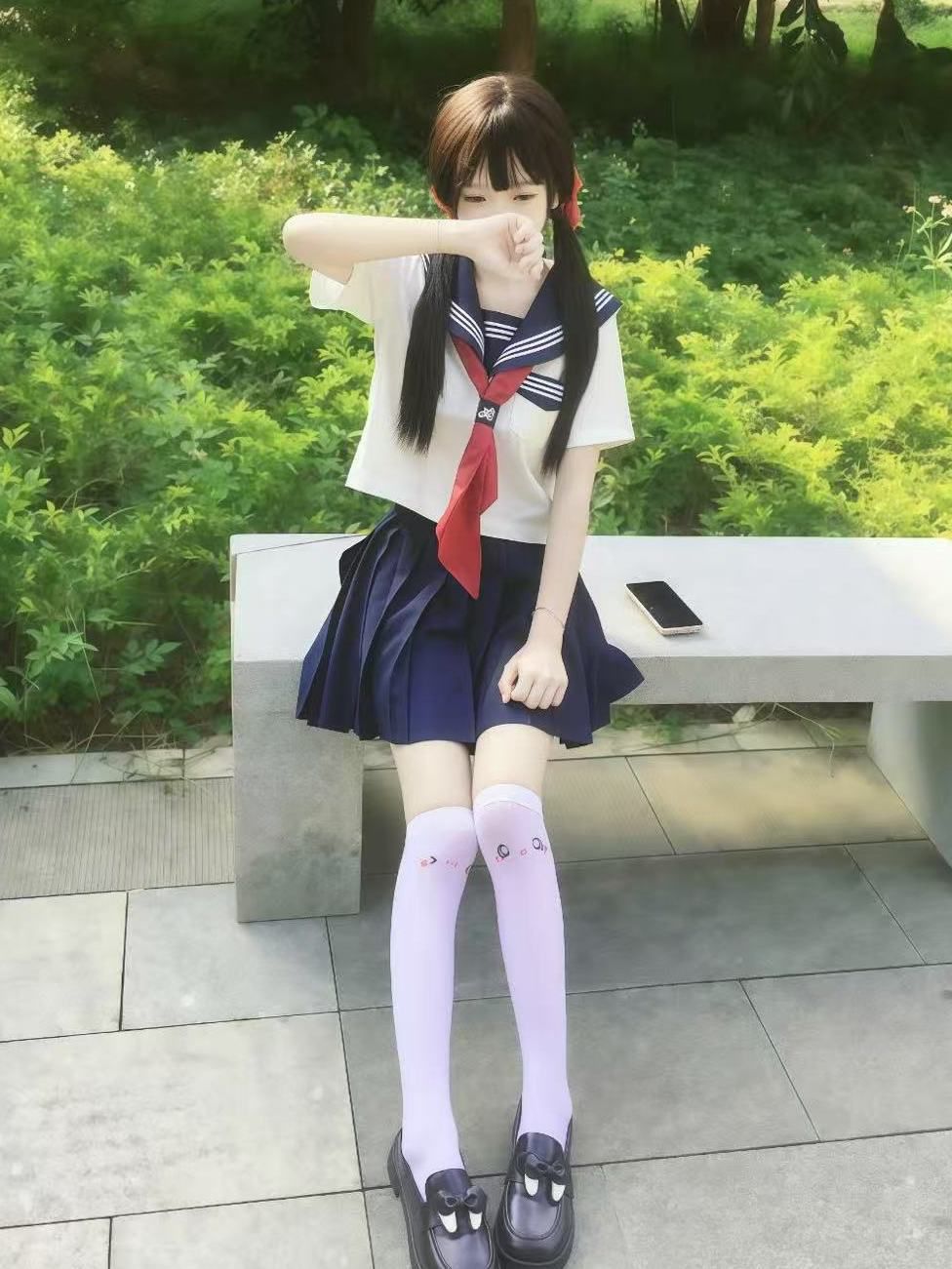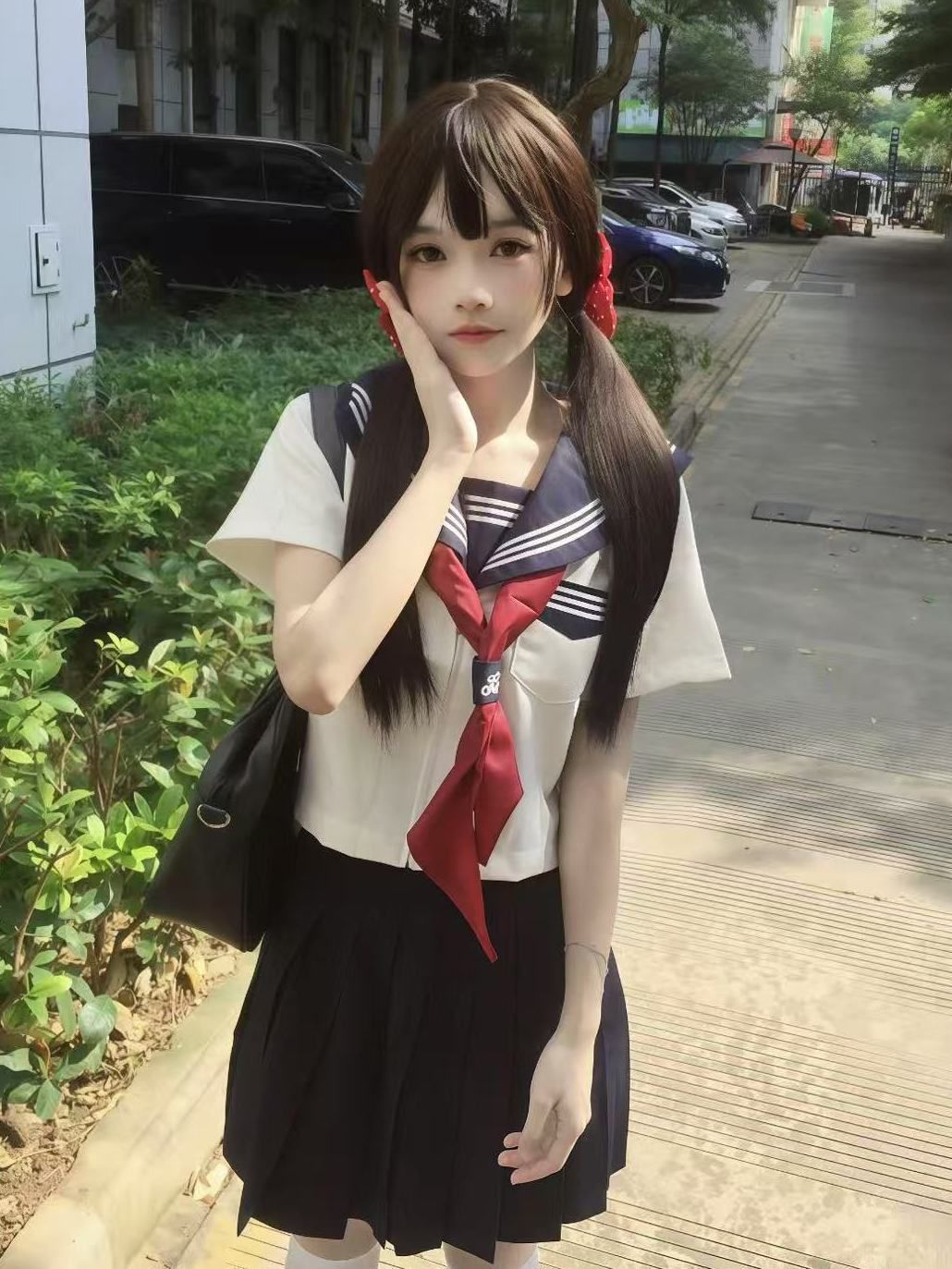 海军领短袖+绀色短裙+白色帆布鞋+双马尾,领绳换成彩色飘带,早读课抱着书本跑过走廊,阳光洒在领口刺绣上,crush看了会愣神的程度!