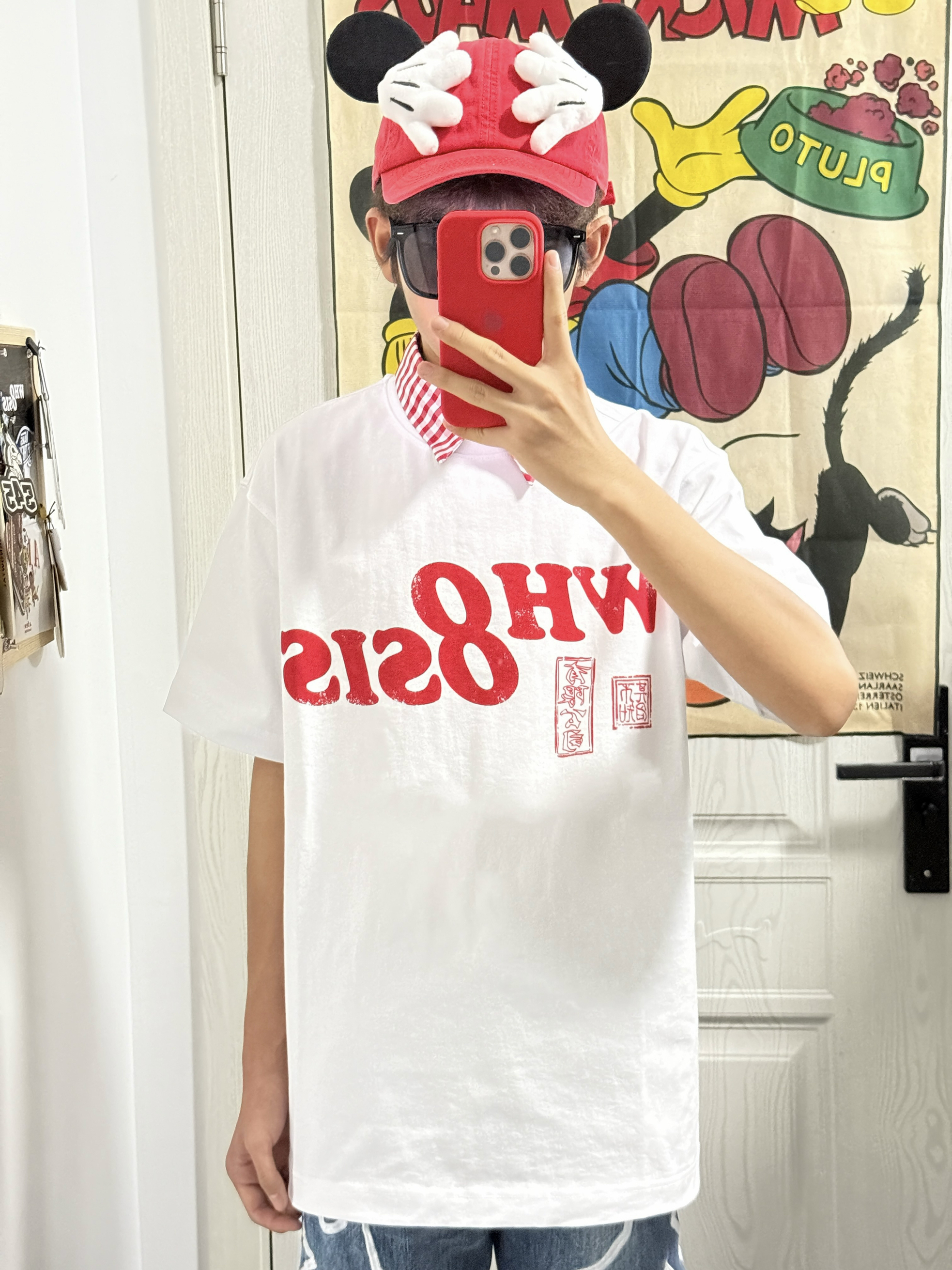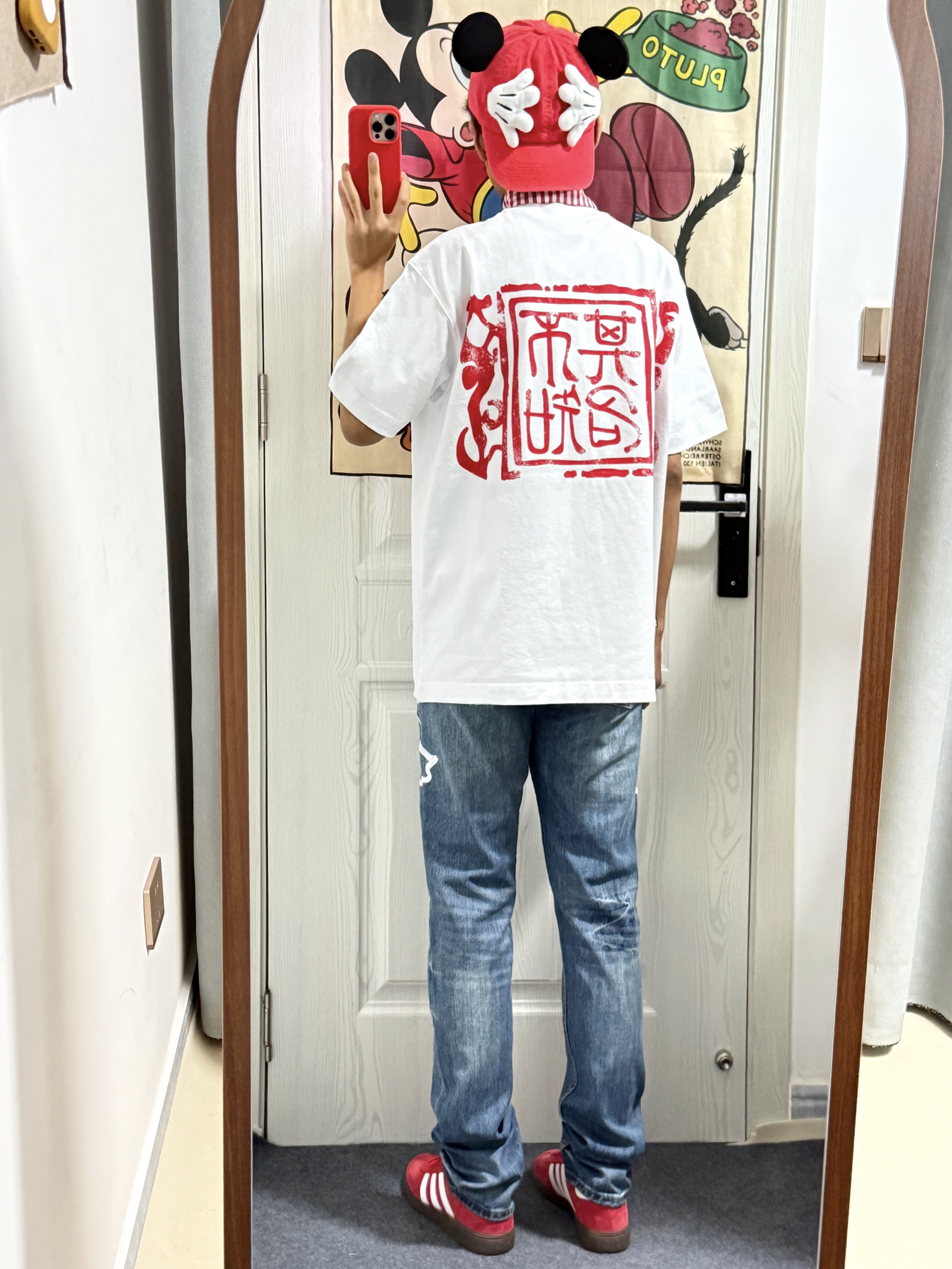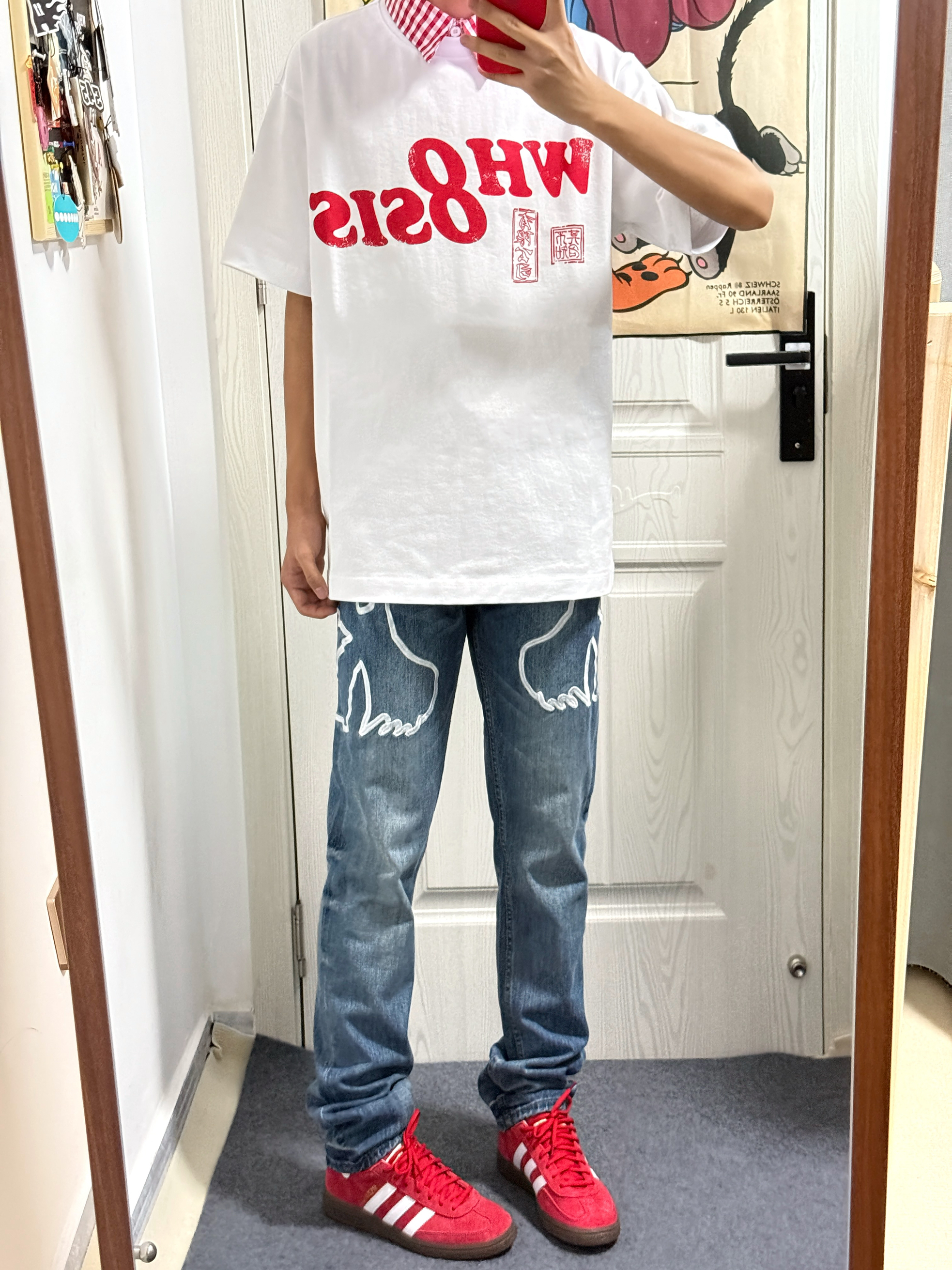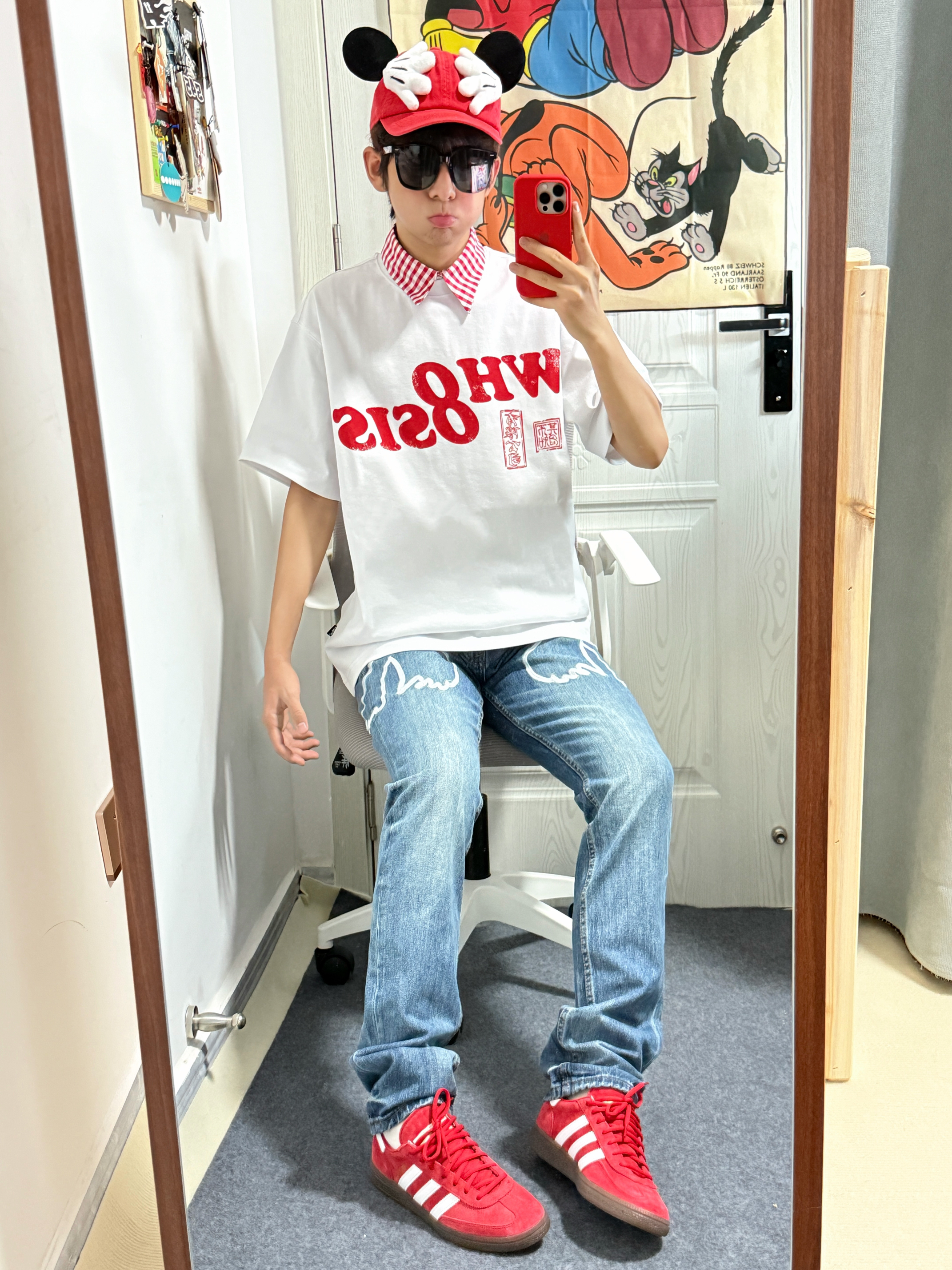 今天穿的是WHOOSIS印章Logo白色短袖😍 红色印花🔴设计很吸睛🤩 米奇帽子也get上了‼️ 里面叠穿了个红白格纹假领子~ 显得有层次感一点🥳 下面搭配VINKID蓝牛💙 经典鸽子🕊️刺绣➕重磅做工面料 搭配起来时尚毫不费力🤓 最后穿的是我的adidas德训鞋🍉