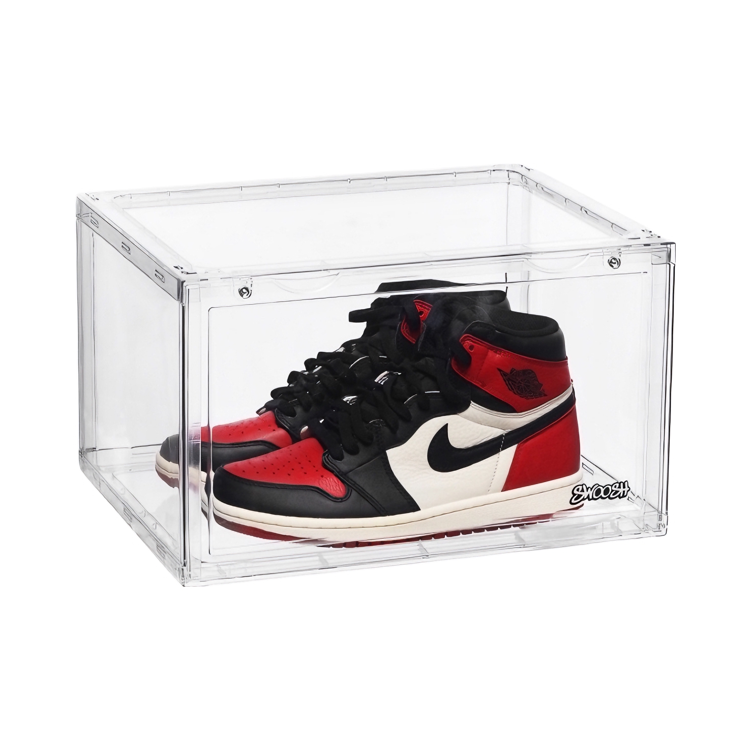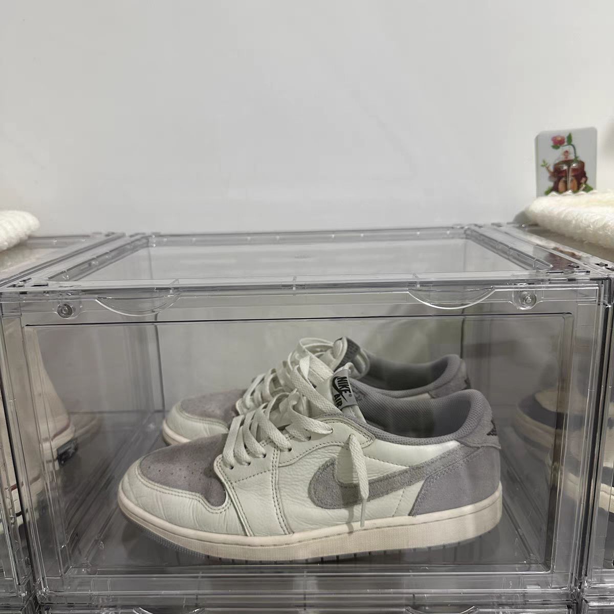 👏 收到货第一眼就觉得质感很好,全亚克力材质清澈透亮,厚实的盒身+光滑边缘,拿在手里沉甸甸的,卡扣设计严丝合缝,开合顺滑还防尘防潮 。 下雨天干洗的AJ放进去,第二天依旧崭新;堆叠时稳稳当当,多层收纳也不塌,强迫症患者狂喜!👍