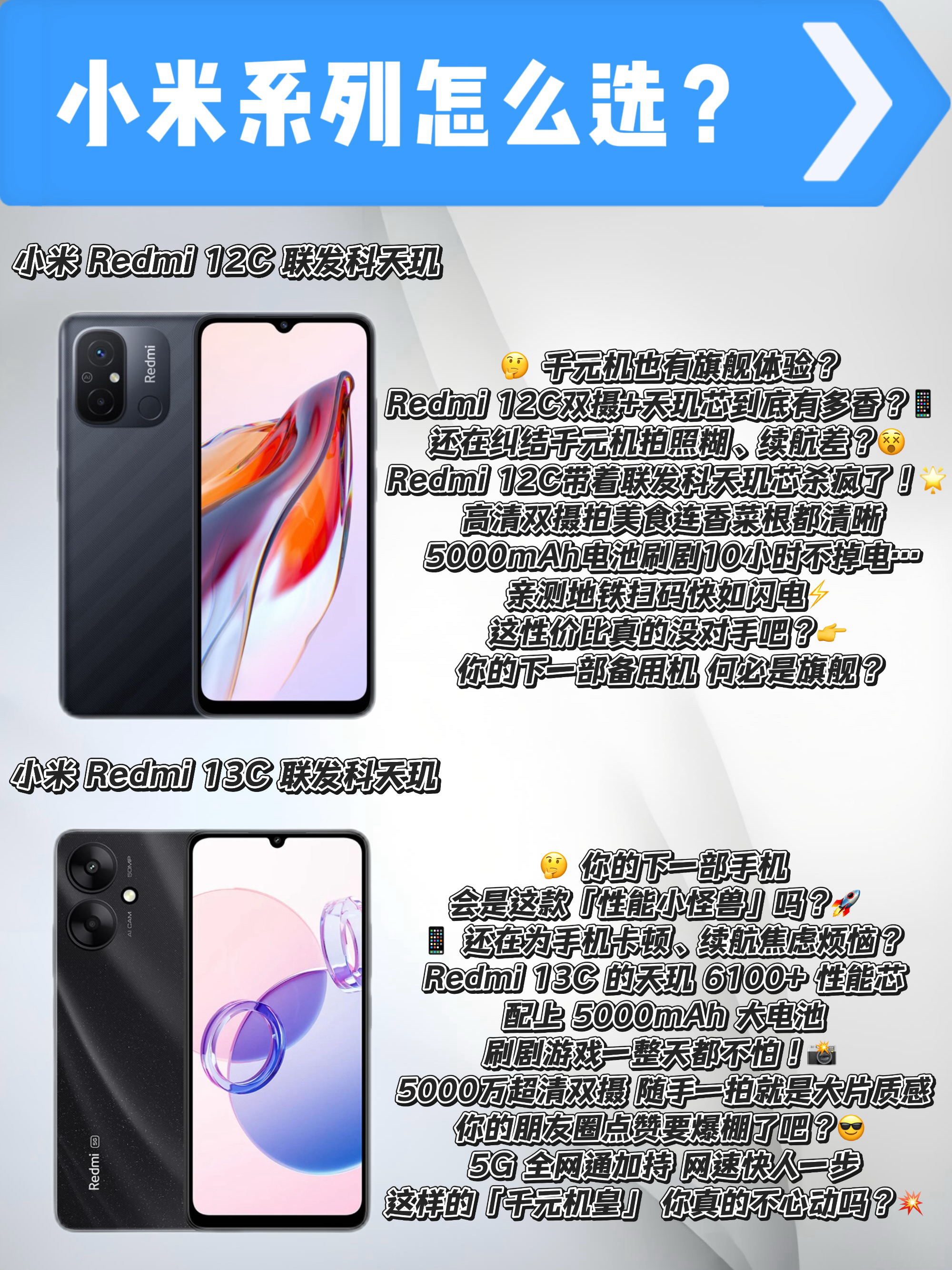 还在为换手机纠结吗?😵💫 每次打开电商平台,是不是被各种参数轰炸到头晕目眩?💥 作为连续摔坏3台旗舰机的资深米粉,今天我要用血泪史告诉你——这些Redmi机型到底怎么选!📱 🌟【百元机皇对决】Redmi 12C和13C谁更香? - 同是联发科天玑芯,13C的6100+芯片性能暴涨23%!🚀 - 实测发现:13C的5000mAh电池能连续刷抖音14小时!📺(别问我怎么知道的...) 💫【中端神机暗...