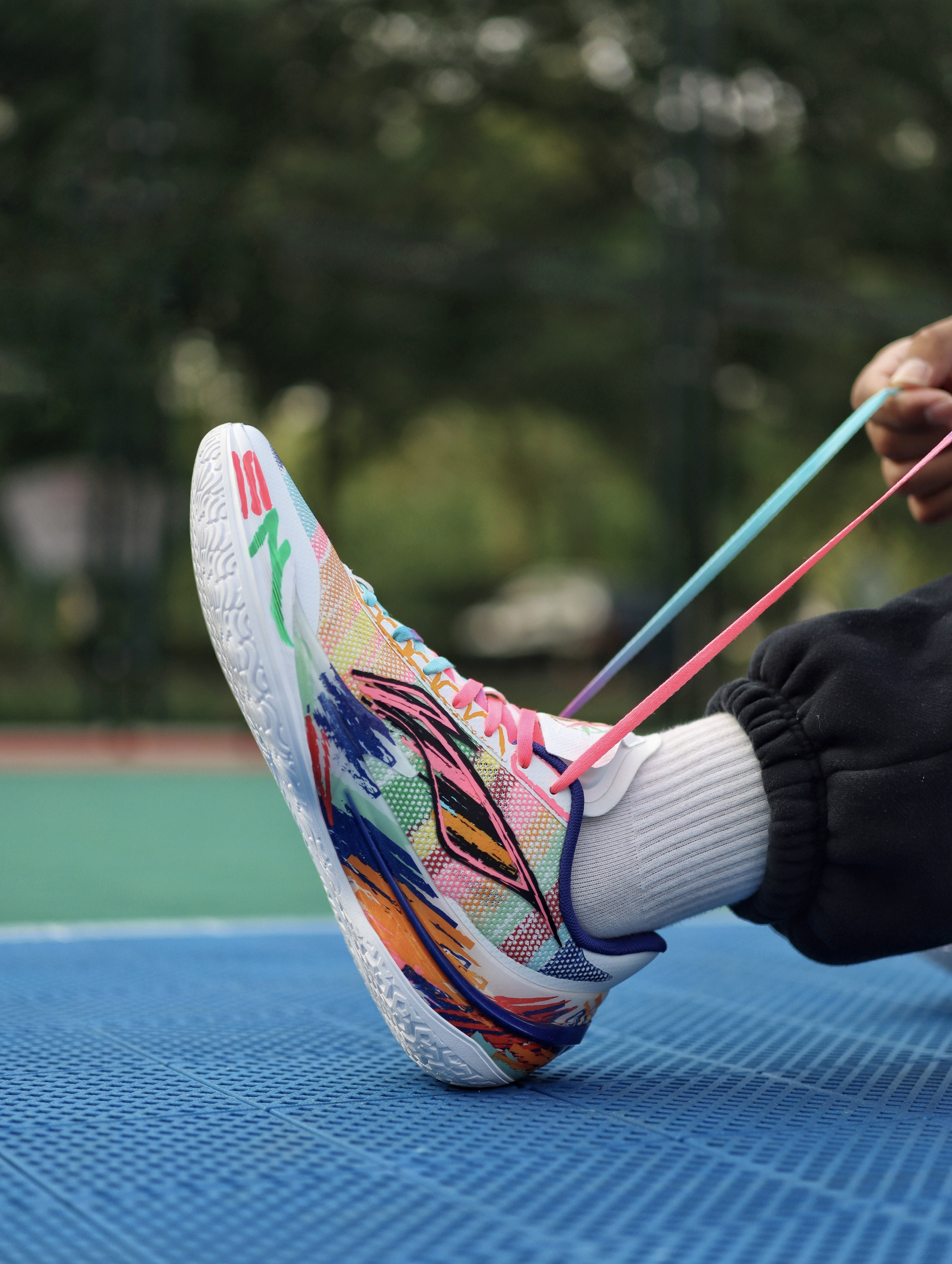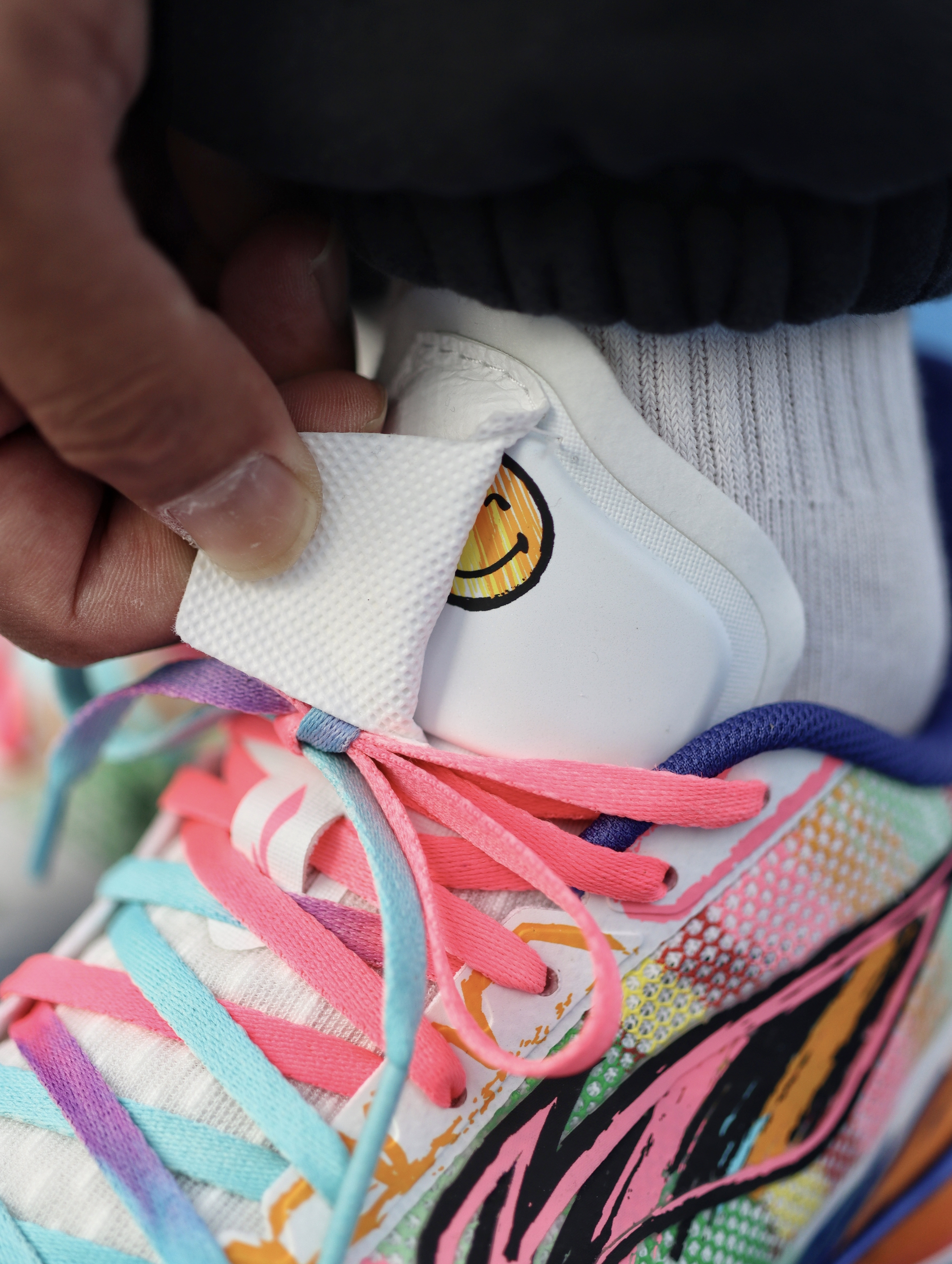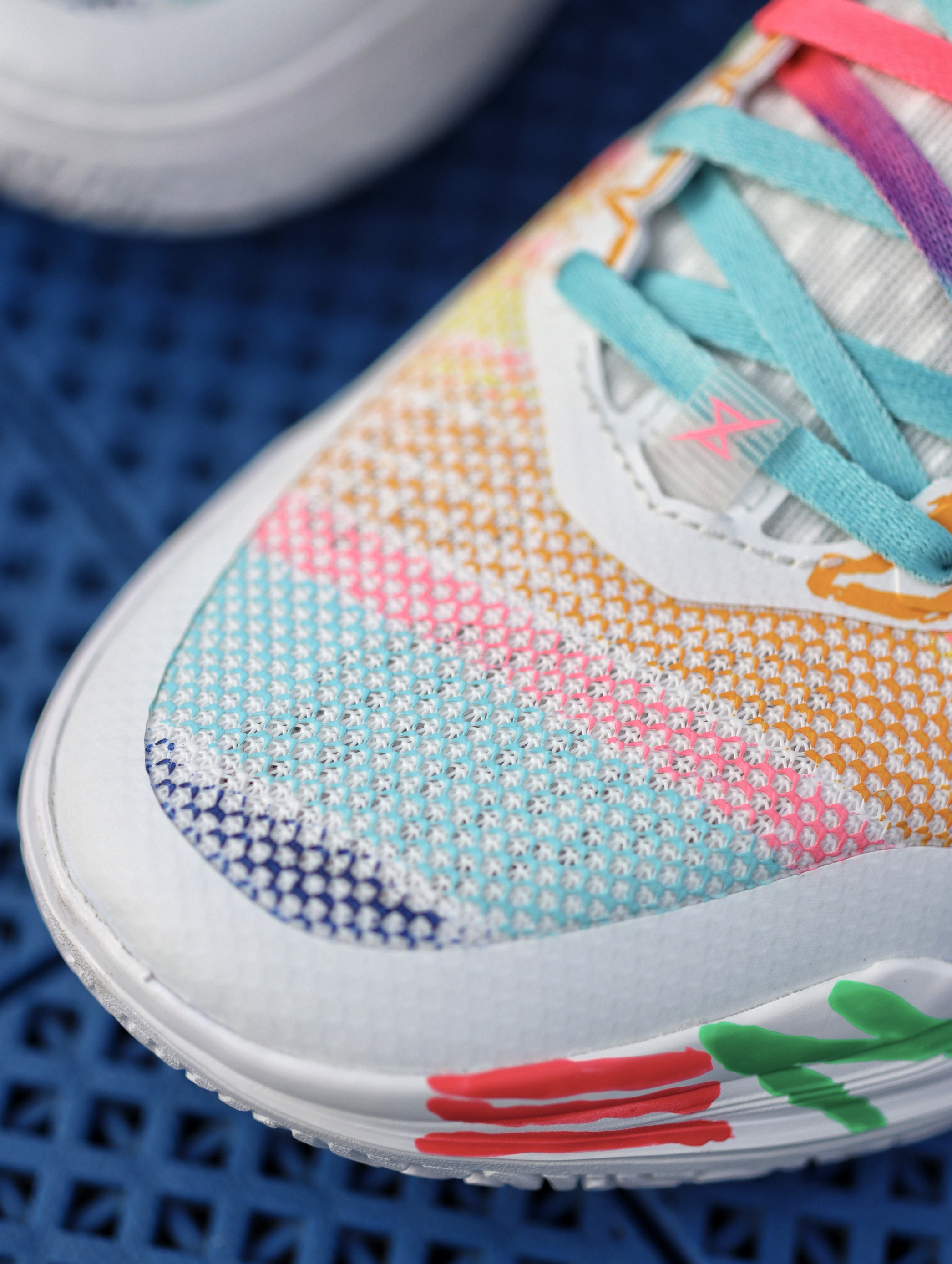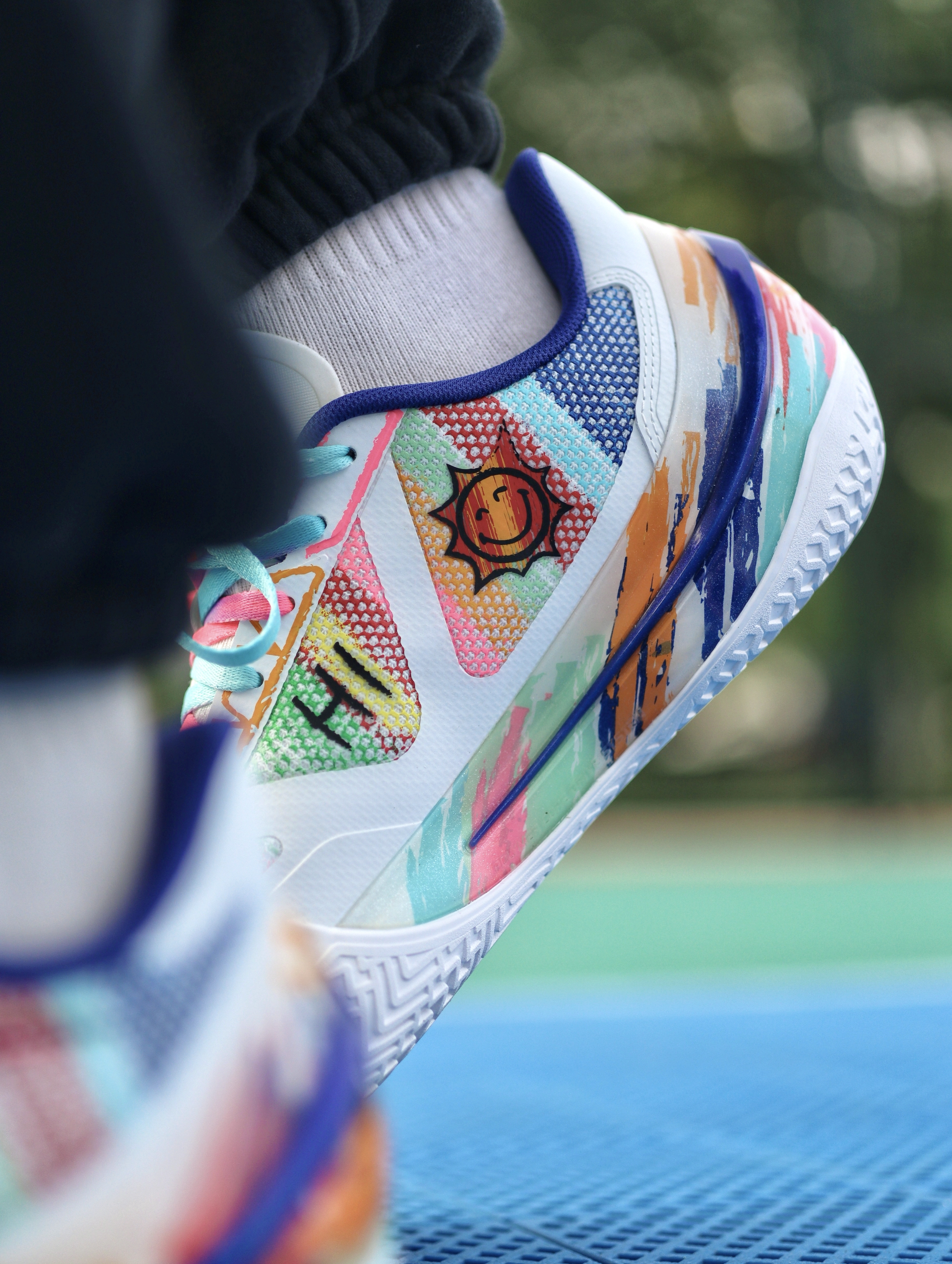 利刃5V2之前也入了好几个配色了,对于平常实战打后卫场地感都是蛮不错的,这次这双“内向艺术家”配色,我觉得还是值得聊一下的。 鞋子配色来自于关爱孤独症儿童为灵感,用涂鸦的设计展现小朋友内心的那股天真,鞋舌部分用了杜邦纸覆盖,撕开后内藏玄机。