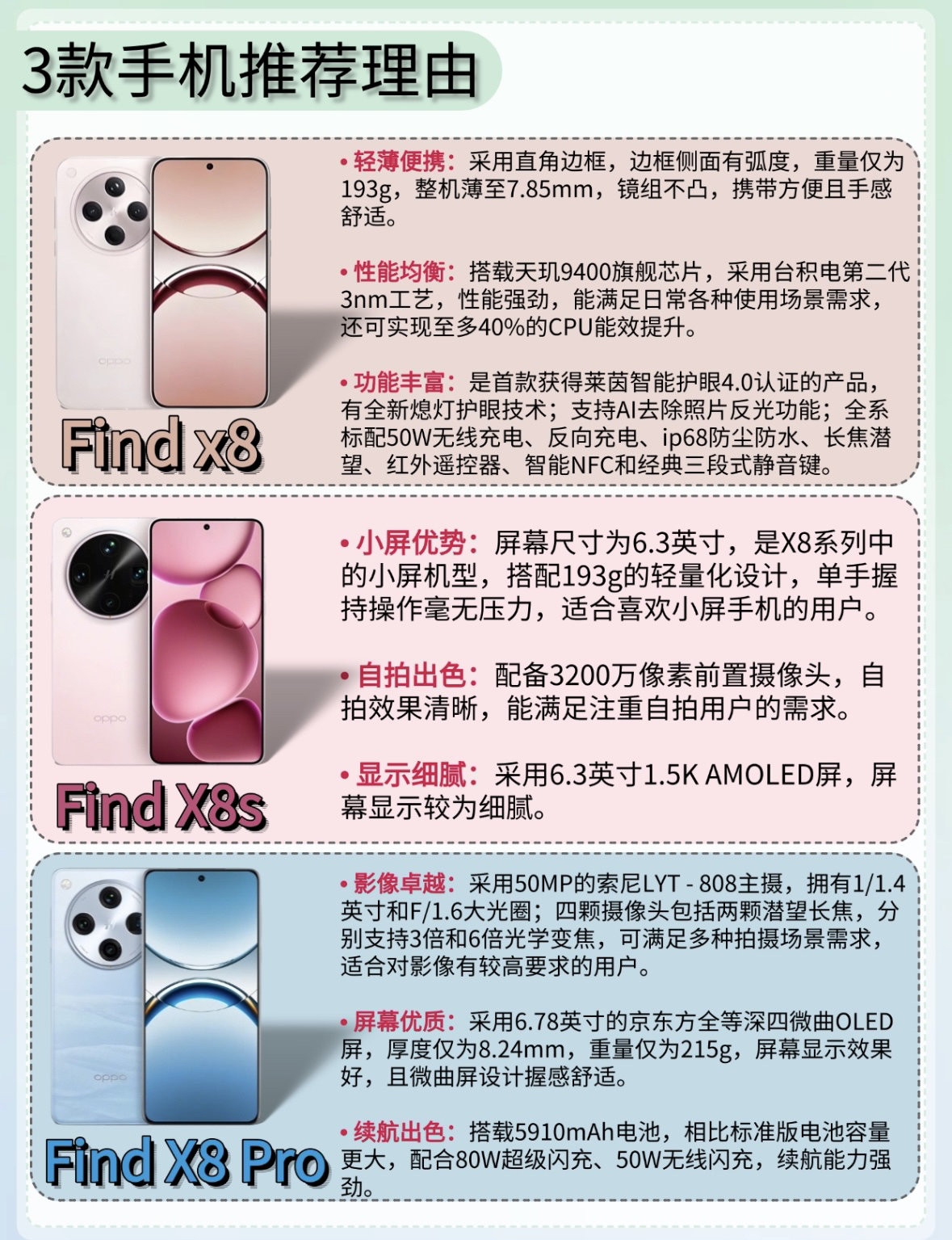 2025年618 OPPO Find X8系列|参 数一图看懂! #心心念念就等618 OPPO Find X8 轻薄直屏党福音!6.59英寸京东方1.5K四边等宽直屏,拿在手上,小直屏的绝佳手感与大屏视觉享受完美兼得~ 二性能上,OPPO潮汐引擎搭配天玑9400,再加上集成的天工散热系统,日常使用丝滑流畅,打游戏也超稳,完全不担心发热降频。 Gi影像方面更是可圈可点,专业哈苏人像带来全新胶片风格...