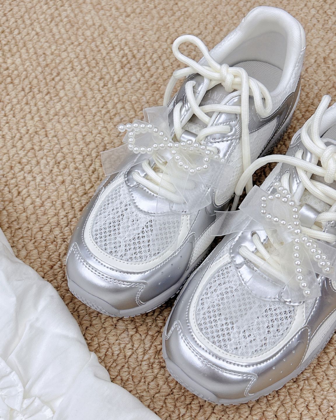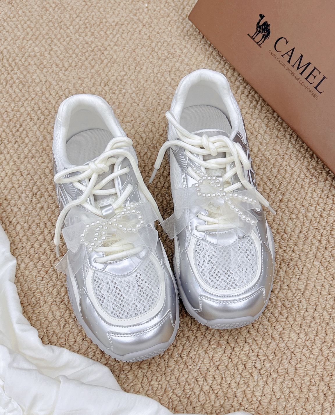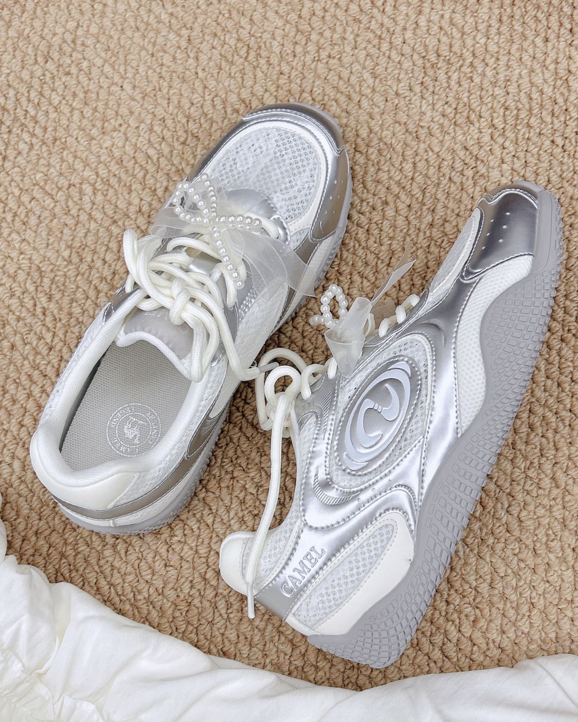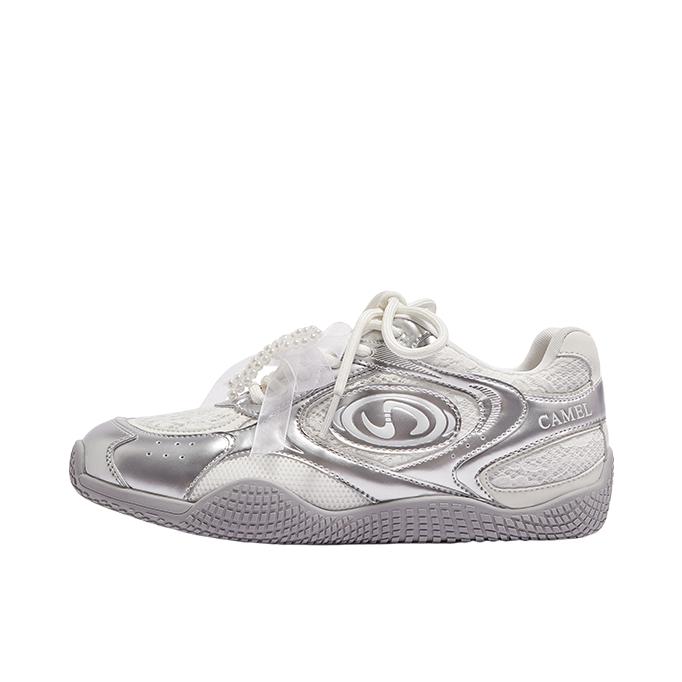 骆驼你小汁!介双液态银芭蕾德训鞋尊嘟吼吼看啊啊 !! 是 自CAMEL骆驼家新出的月牙德训鞋耶~ 液态银+白色蕾丝的鞋面融合在一起意外的好看还有珍珠蝴蝶结鞋带元素作为点缀让整双鞋子看起来少女感满满