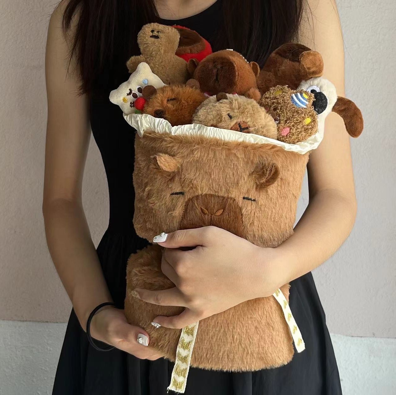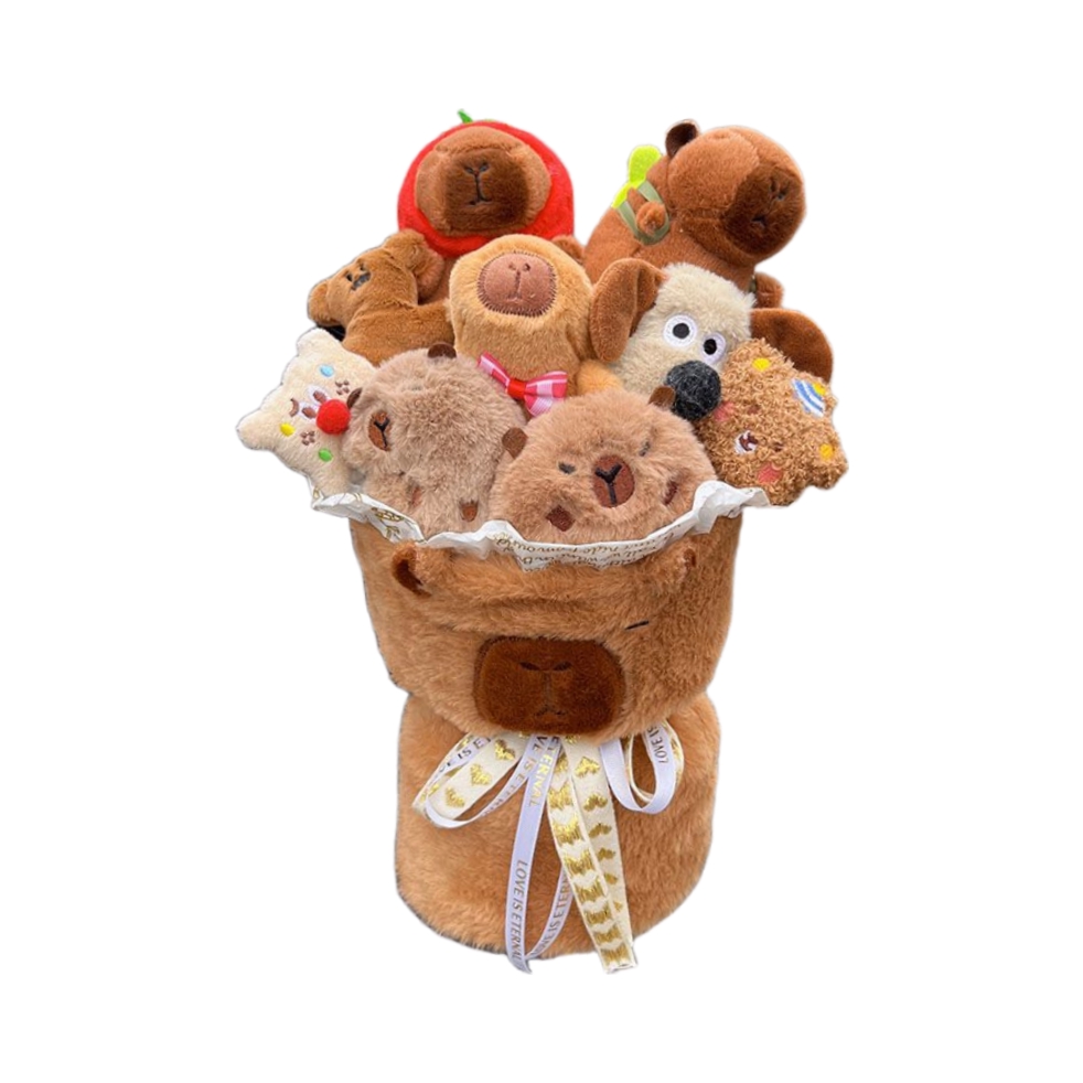 软fufu的水豚花束捧在手里,圆滚滚的肚子像揣了棉花糖☁️,每只都睁着无辜豆豆眼冲你笑~毛绒触感像撸到云朵本朵,抱着追剧时连坏心情都被呼噜呼噜吸走啦!摆床头当治愈系摆件,朋友来家里直接被萌到尖叫🐾~这波“躺平美学”我先冲为敬!