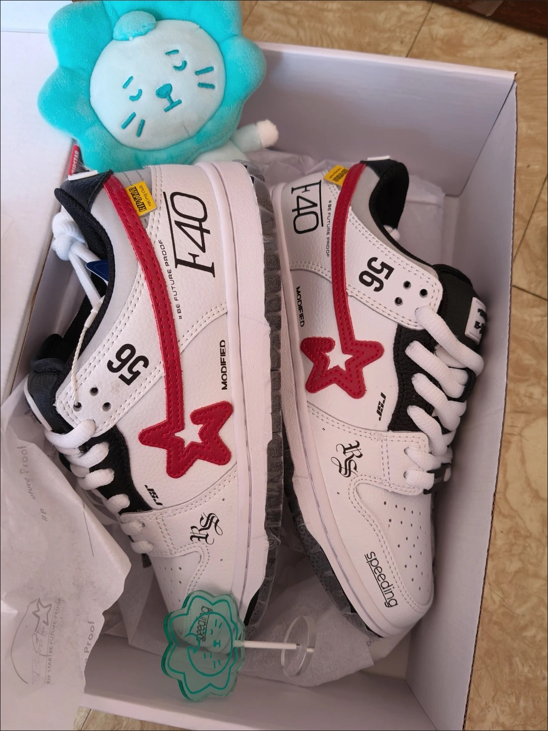 鞋子特点 1. 赛道基因+复古潮流:灵感源自赛车设计,白红撞色拼接搭配流线型鞋身,街头感与复古风格并存;鞋面采用耐磨合成革+透气网布,兼顾质感与耐用性。 2. 轻量化科技:单只重量仅约150g(接近一包抽纸),EVA中底结合缓震鞋垫,大幅减轻脚部负担,提升步履轻盈感。 3. 防滑耐磨升级:橡胶大底嵌入深纹路横向沟槽,增强抓地力与排水性,应对湿滑路面更稳当;加厚鞋跟设计暗藏增高效果,低调修饰...