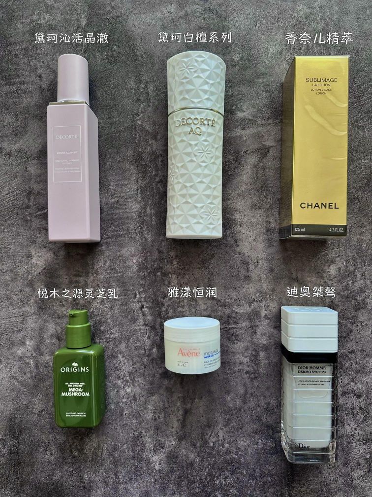 打工人的护肤也可以是极简主义 分享几瓶让我用空瓶后默默回购的水乳 一步搞定 每瓶单拿出来也都很能打 🧴黛珂白檀系列(保湿最好 出油也多) 🧴迪奥桀骜(还可以当须后水 适合混干) 🧴悦木之源灵芝乳(维稳修护保湿 性价比高) 🧴雅漾恒润(保湿同时哑光提亮 适合混干) 🧴香奈儿精粹(虽然是水 但保湿程度够) 🧴黛珂沁活晶澈(敏肌可用 擦完有通透感) 因为我是混合皮 T区出油 两颊偏干 所以需要清爽薄...