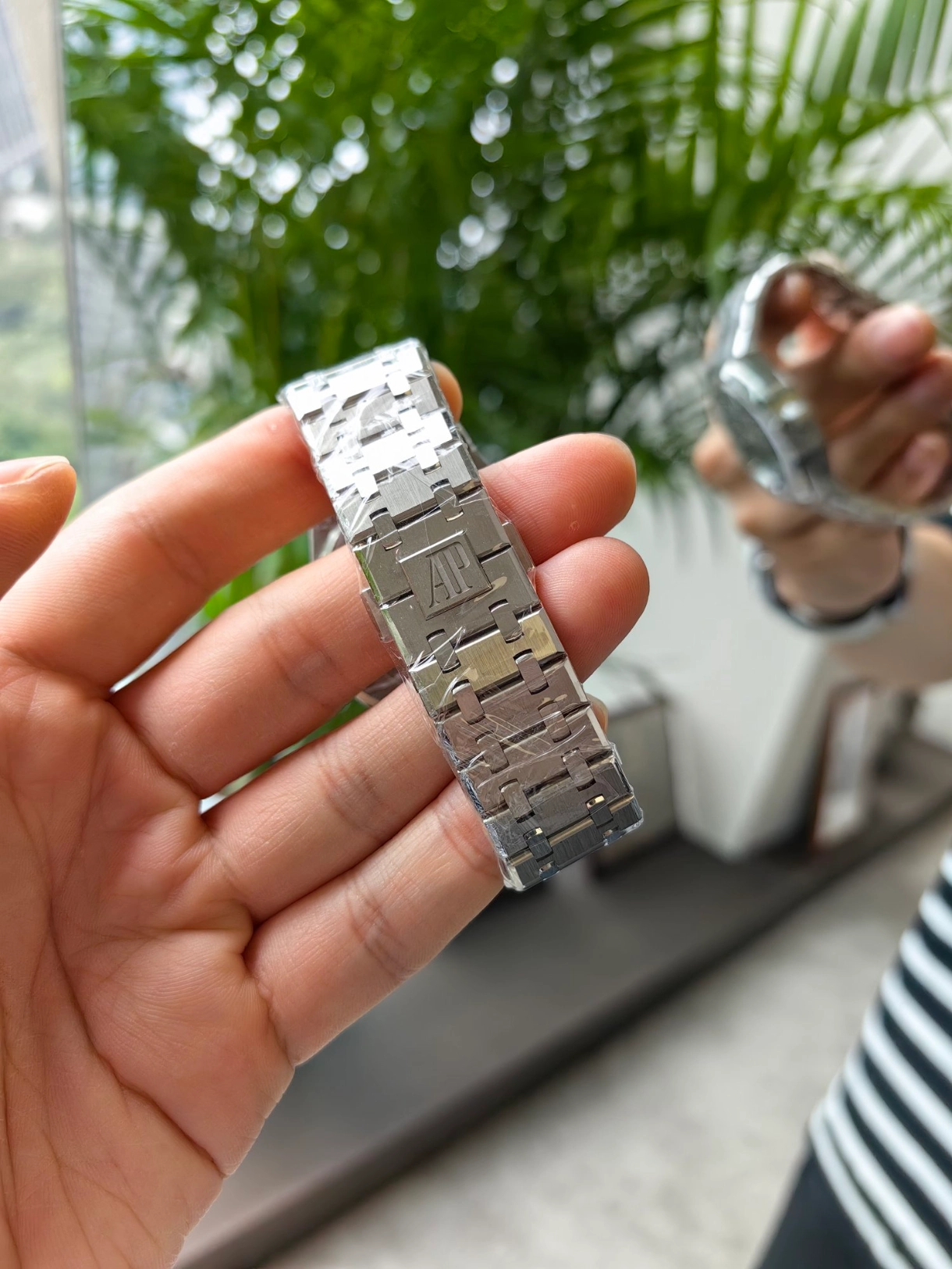 终于明白为什么说 “每个男人都该有块皇家橡树”!这枚 41mm 精钢款我戴了半年,从职场到生活,它简直是万能搭子。 八角形表圈 + Tapisserie 格纹表盘,标志性设计一眼万年,商务会议上抬手看时间,客户瞥到都会夸一句 “品位不错”。精钢表带经过 12 道抛光工序,贴合手腕曲线,连表冠护桥的倒角都处理得圆润不硌手,细节控狂喜。自动上链机芯储能达 60 小时,周末放两天也不用重新调时间,对懒人...