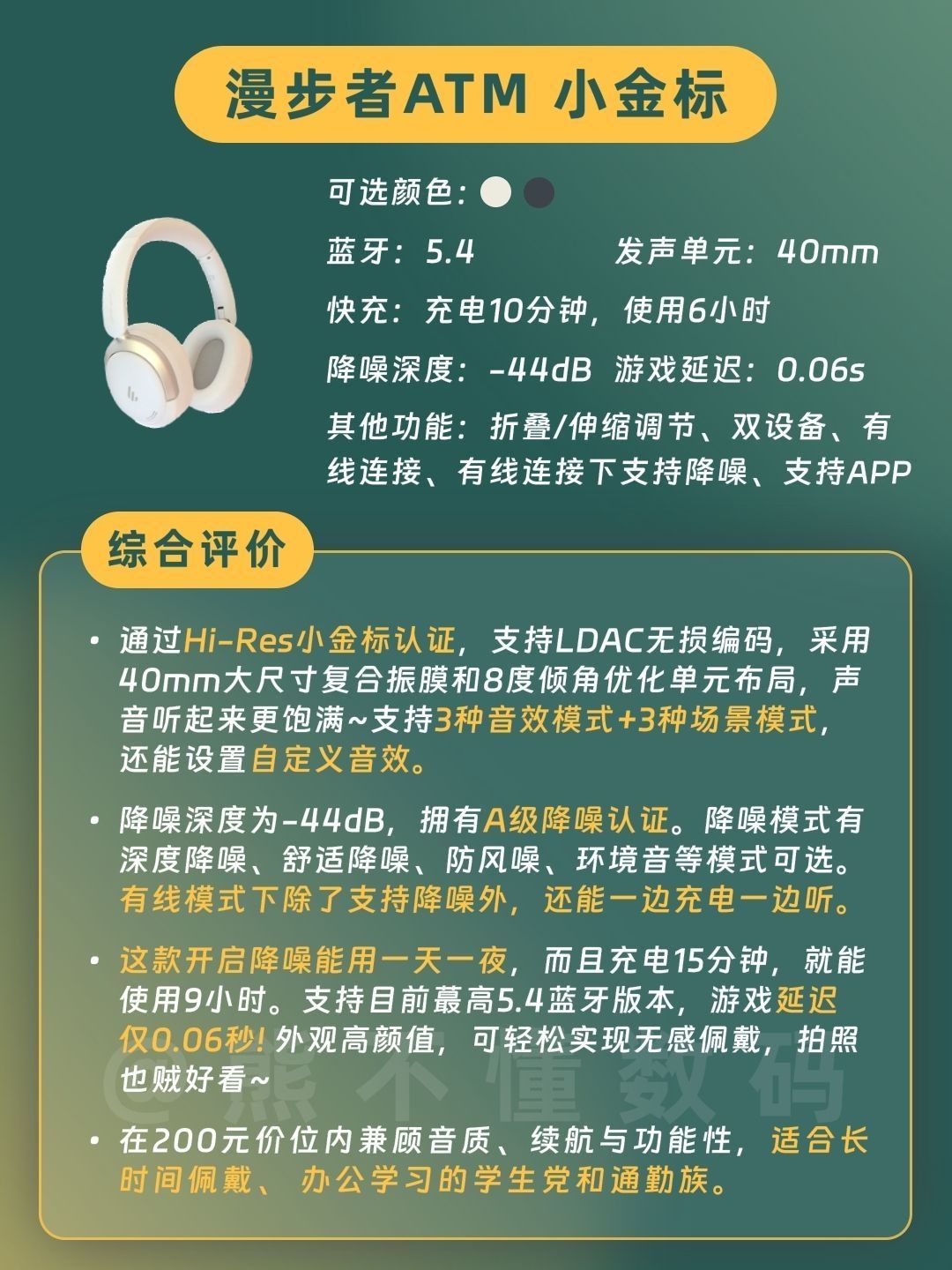 学生党低预算买头戴式耳机怎么选❓ 👉一提到头戴式耳机,大家担心的无非这几点:音质、快充、降噪、佩戴舒适度和游戏延迟,以及预算。 📝根据以上,这次我整理了4款高性价比的百元级头戴式耳机,特别适合学生党和打工人~ 1⃣漫步者ATM小金标 通过Hi-Res小金标认证,40mm大尺寸复合振膜和8度倾角优化单元布局,声音听起来更饱满~支持3种音效模式+3种场景模式,还能设置自定义音效。 降噪深度为-44d...
