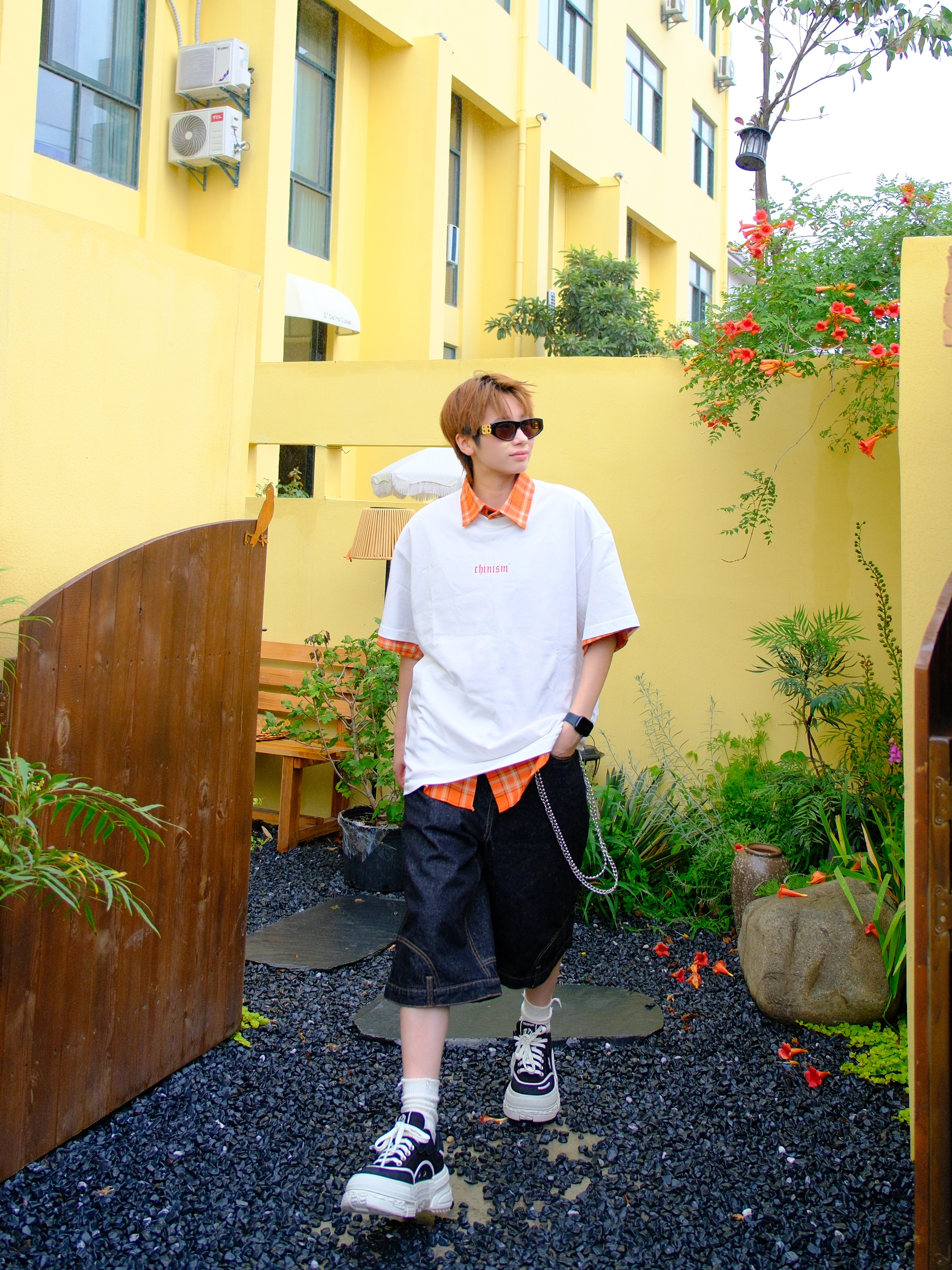 白T➕衬衫➕牛仔七分裤➕厚底板鞋 入夏的少年感穿搭公式 白T不要选的太素 这种胸口和后背带点彩色logo的 面料轻薄也不会很热,叠穿亮色衬衫更出效果 下面搭配深色原牛七分裤 再来一双黑白拼色的厚底板鞋 平衡掉七分裤压腿长的问题 还能增高5cm左右 帆布材质的鞋面夏天穿不是很闷脚 加个裤链配饰,街头vibe感拿捏住 尺码参考:163cm/46kg 上身S码