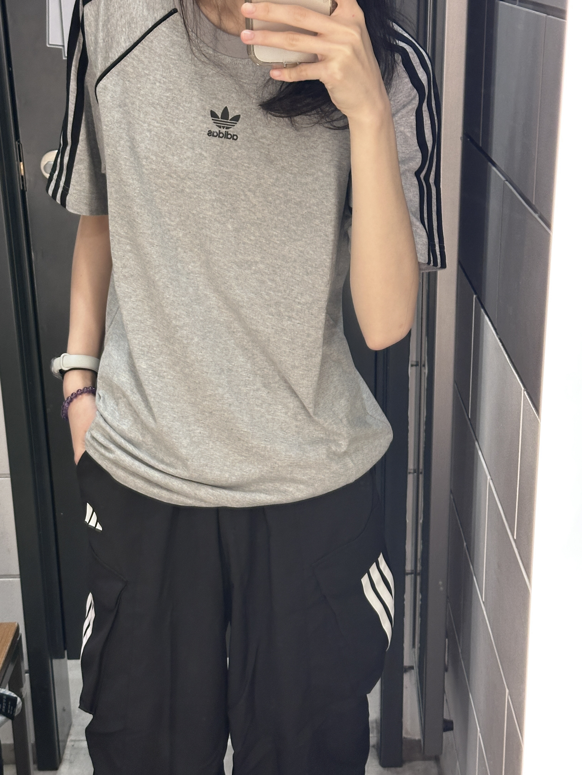 阿迪的这件短袖,浅灰配色百搭又清爽🌿 ,经典三条纹拼接,简约中带运动感,小logo点缀超耐看~面料柔软亲肤,日常出街、运动健身都能穿,不管高个子小个子都能轻松驾驭,轻松打造松弛感穿搭,家人们,闭眼入不踩雷✨