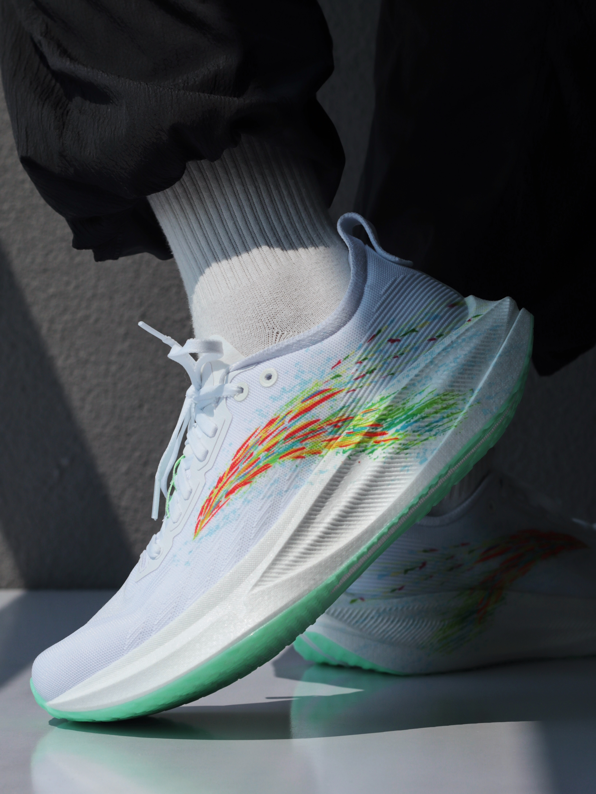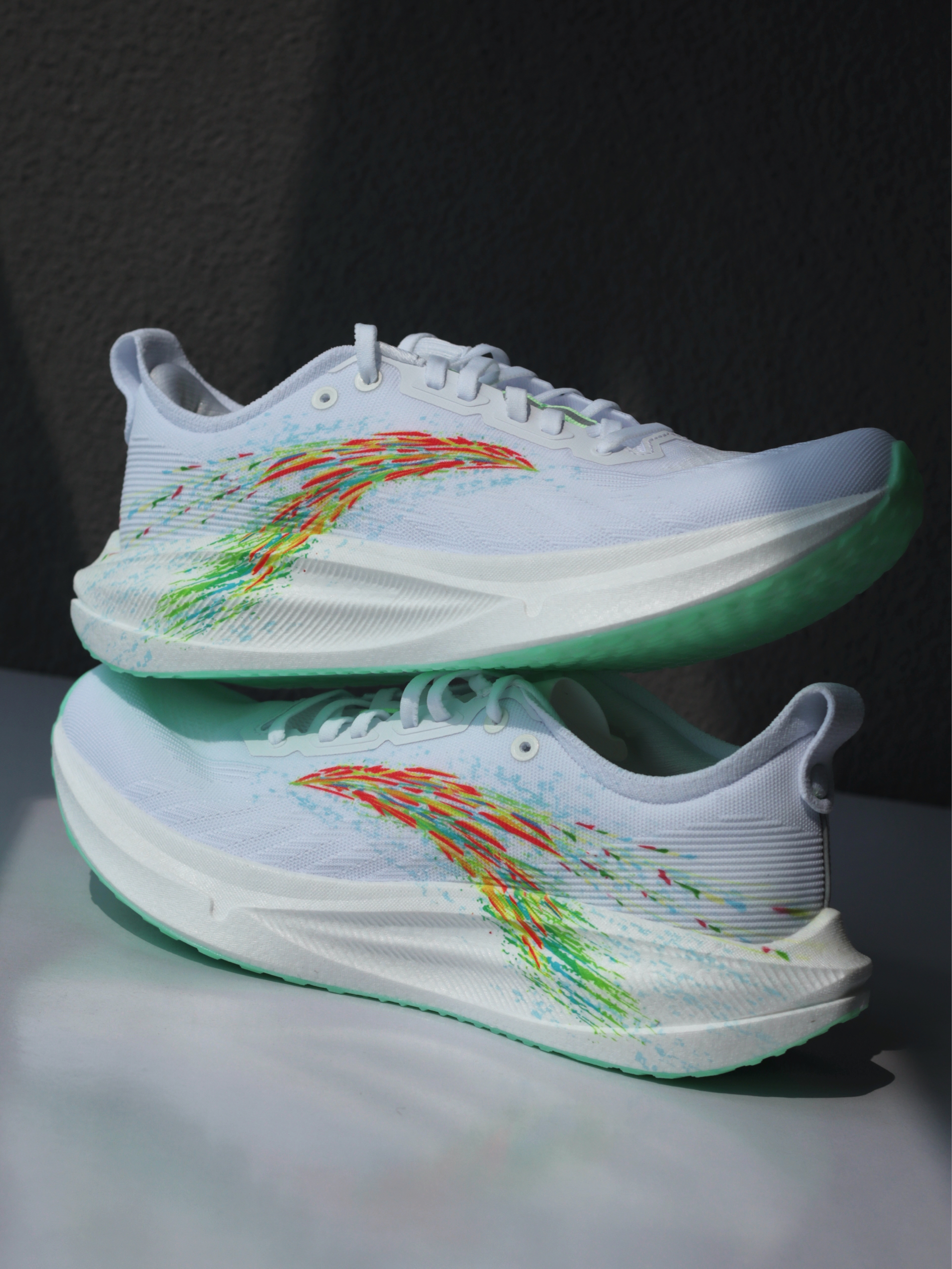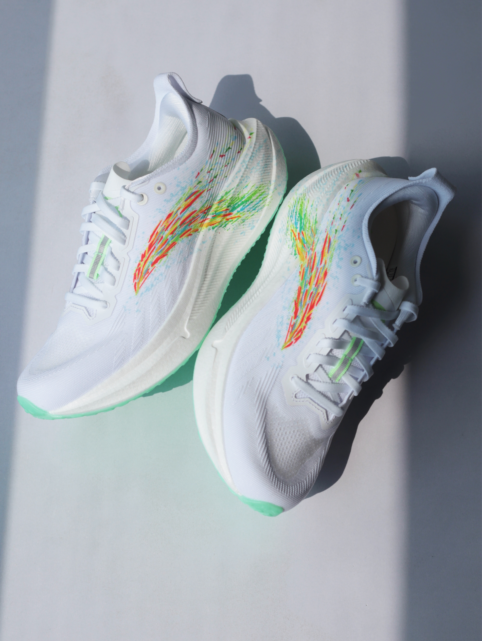 刚拿到「格桑花」这个配色时,确实让我眼前一亮!大面积白色鞋身,侧面代表格桑花海的多彩安踏logo一直延伸至中底后跟,上脚是真的好看~ 一体织鞋面轻薄透气,挺适合夏天穿的!上脚滚动感很流畅,再加上前掌镂空的碳板,温和不激进,很适合我这种想要挑战下长距离的大众跑者~ 当然,氮科技中底加宽设计,搭配防滑耐磨大底,对于日常慢跑或者训练来说,也是非常稳定舒适的一双~