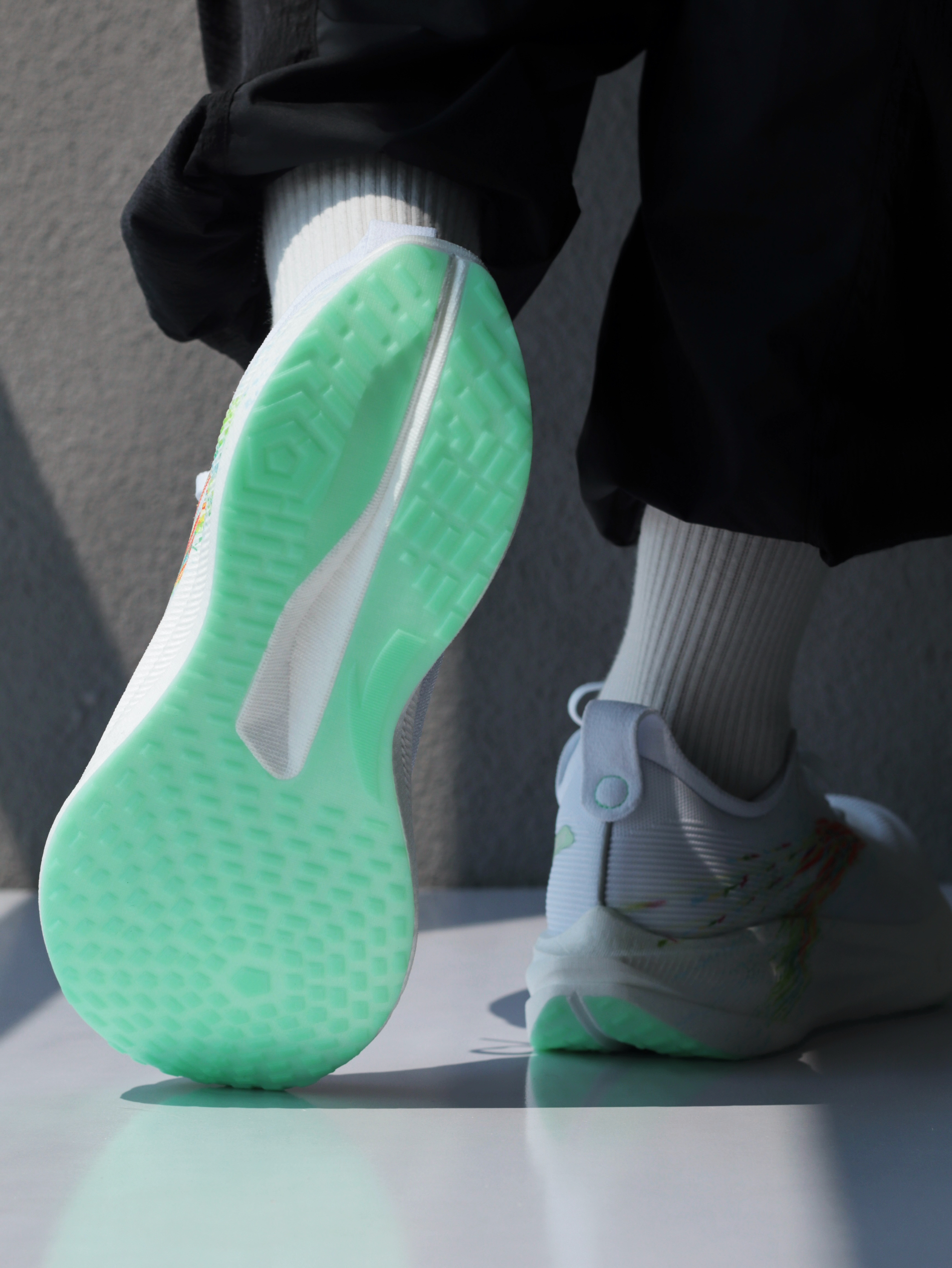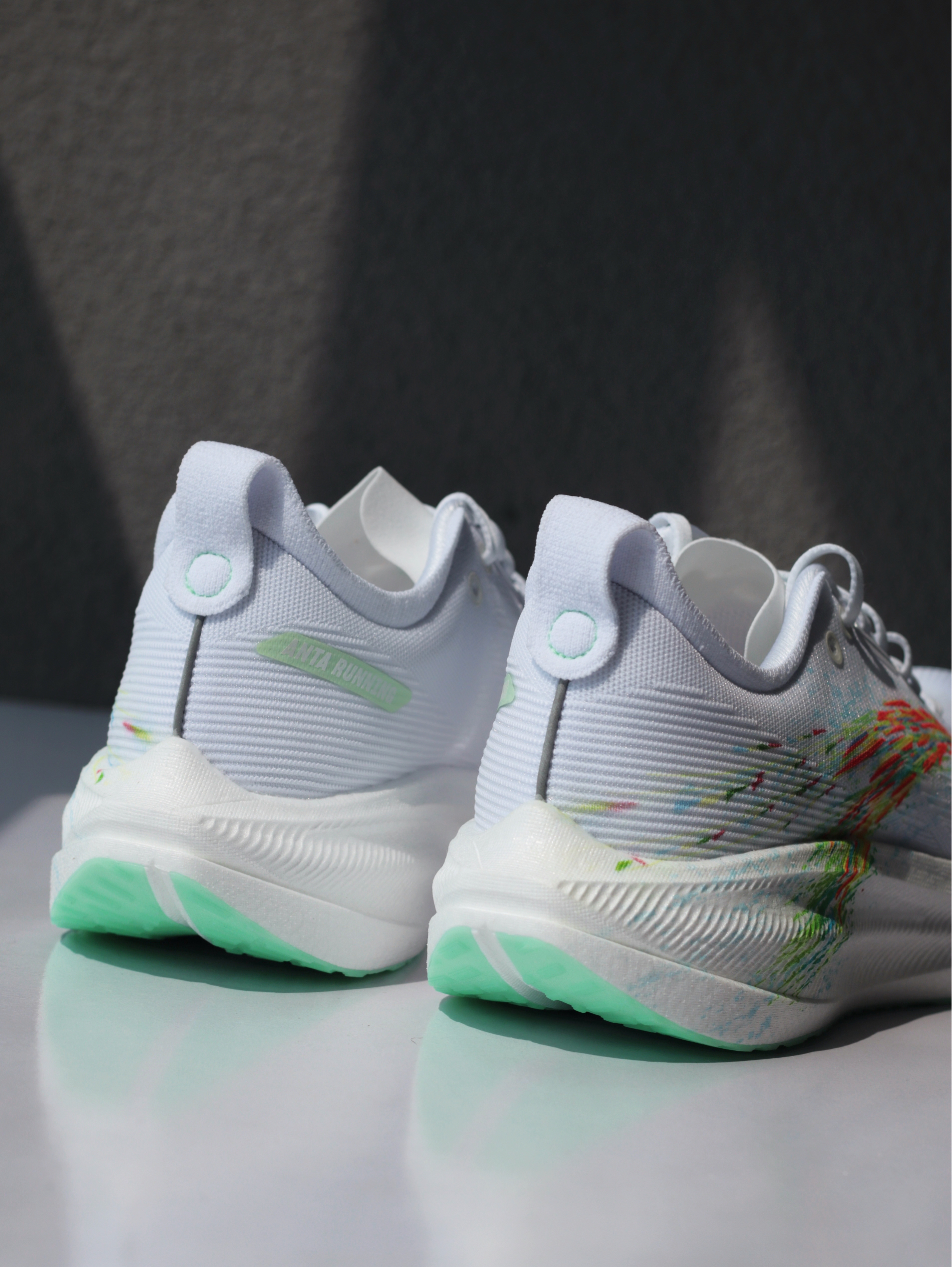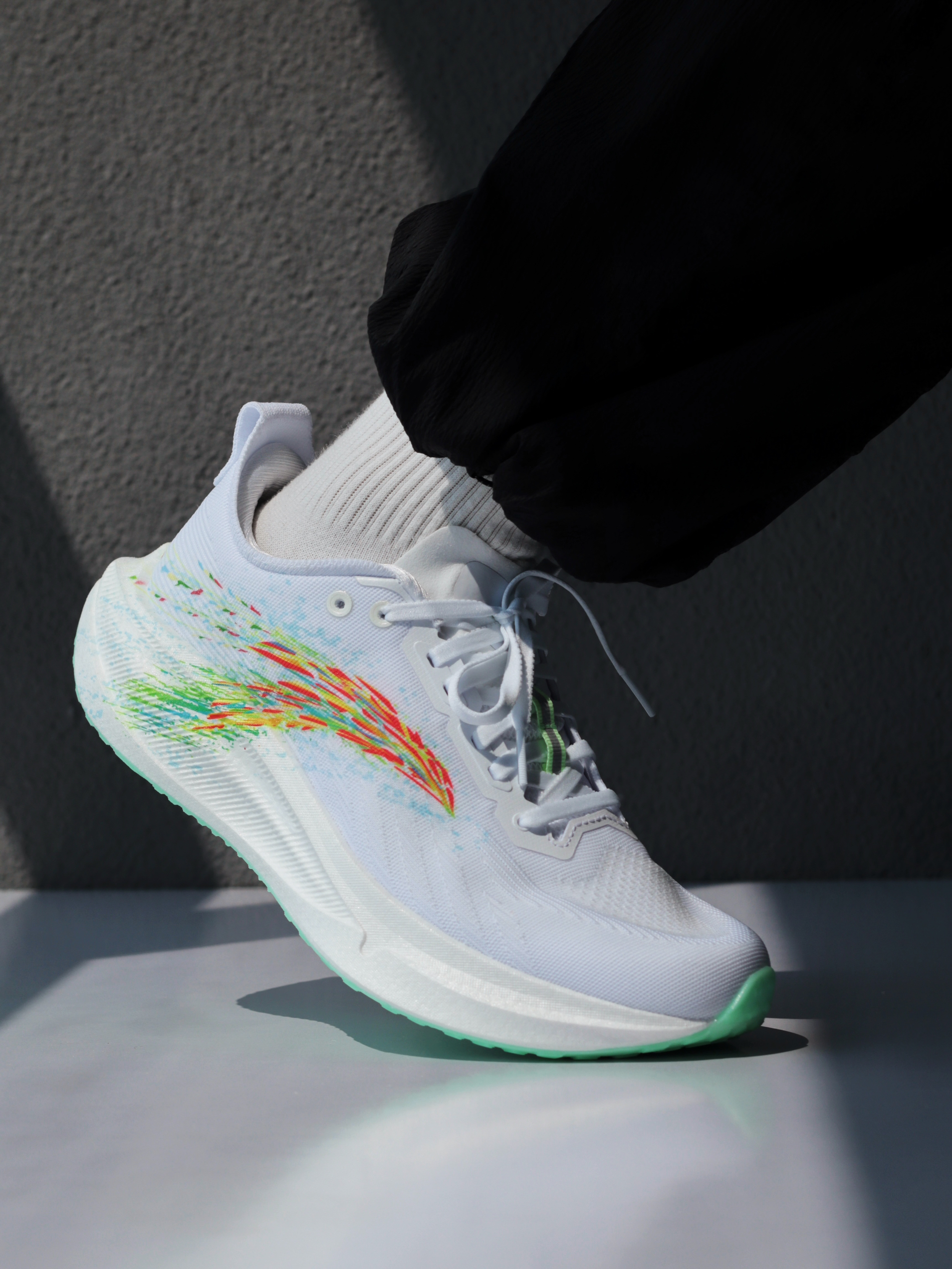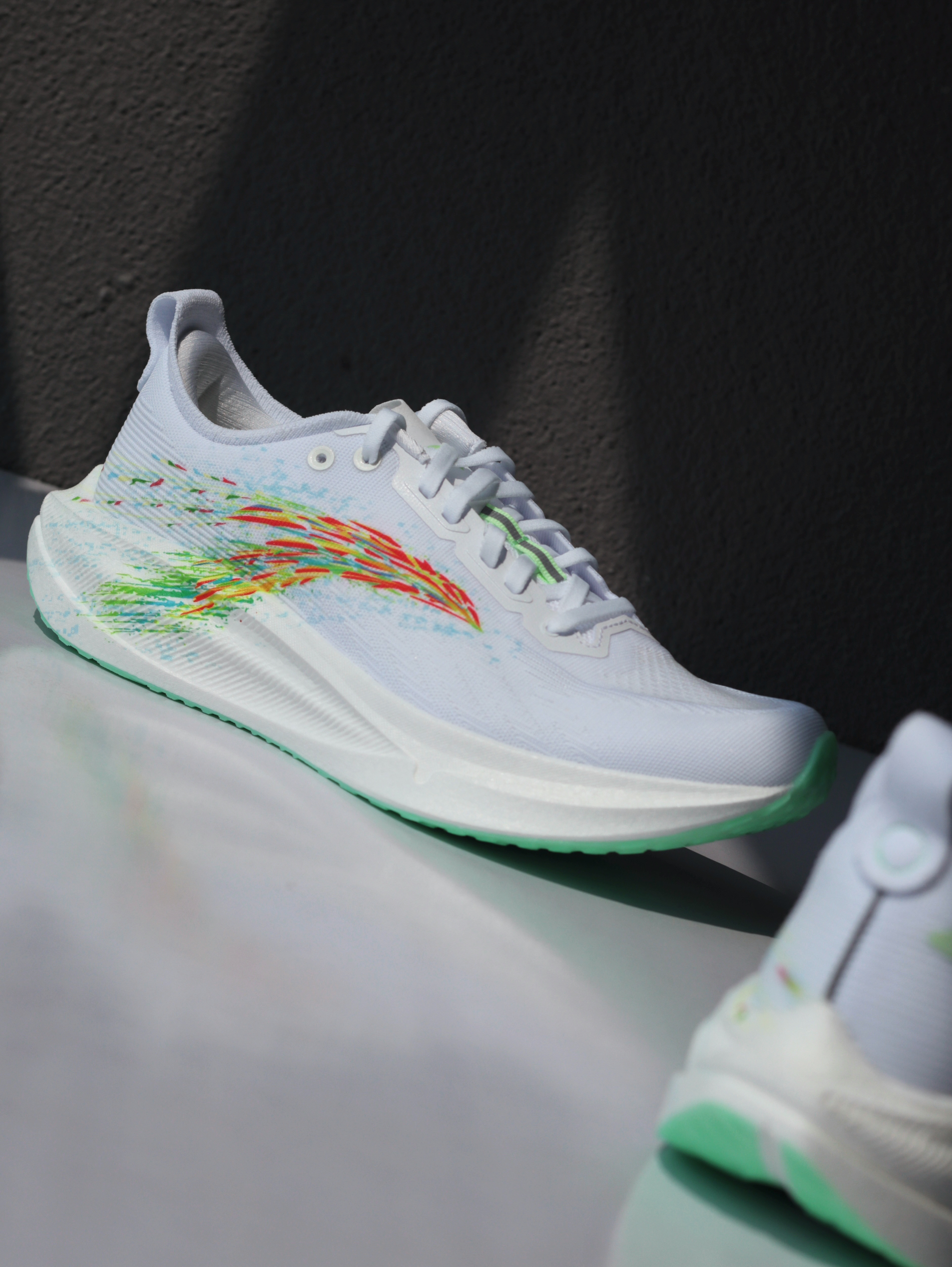 刚拿到「格桑花」这个配色时,确实让我眼前一亮!大面积白色鞋身,侧面代表格桑花海的多彩安踏logo一直延伸至中底后跟,上脚是真的好看~ 一体织鞋面轻薄透气,挺适合夏天穿的!上脚滚动感很流畅,再加上前掌镂空的碳板,温和不激进,很适合我这种想要挑战下长距离的大众跑者~ 当然,氮科技中底加宽设计,搭配防滑耐磨大底,对于日常慢跑或者训练来说,也是非常稳定舒适的一双~