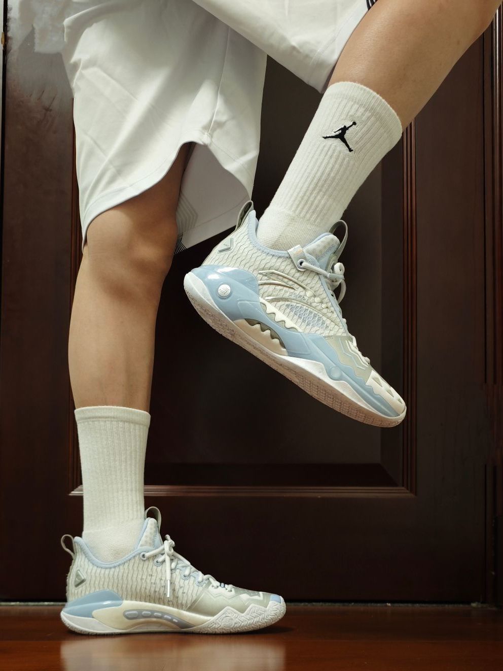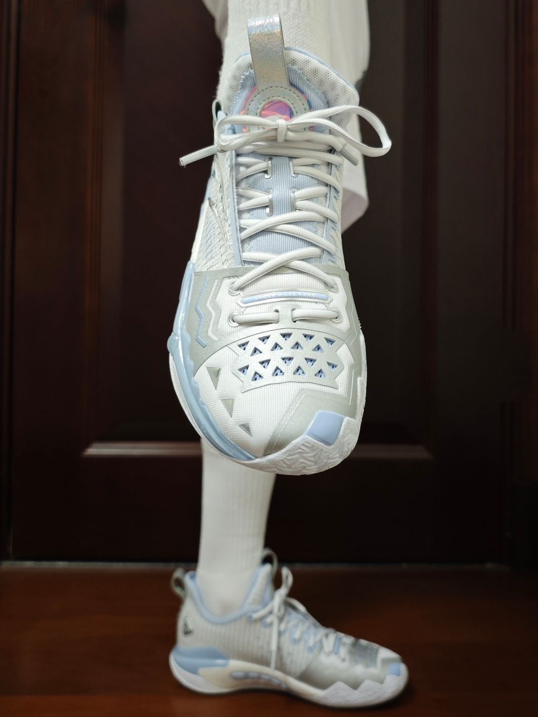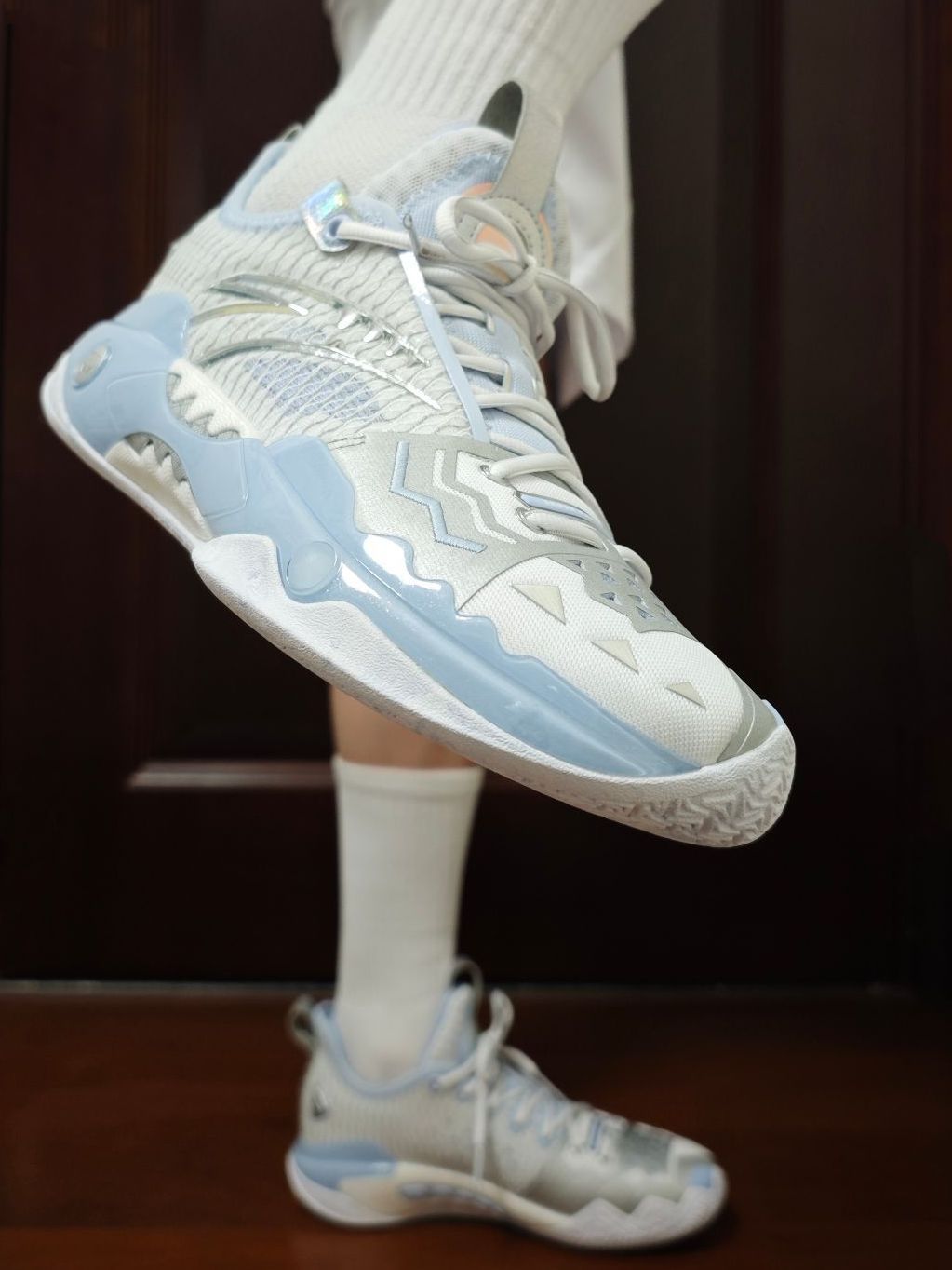 尽管材质并没有什么变化,但这个配色,一眼冰爽,太适合夏天了! 新发的四个配色,当初看图其实就是看中的这双“踏冰”,因为我个人是非常钟爱浅色系的球鞋。(尽管后来拿到实物还是被黑金拿捏了) 突破选手、喜欢安踏、喜欢狂潮、喜欢欧文的朋友,很建议冲这双鞋。